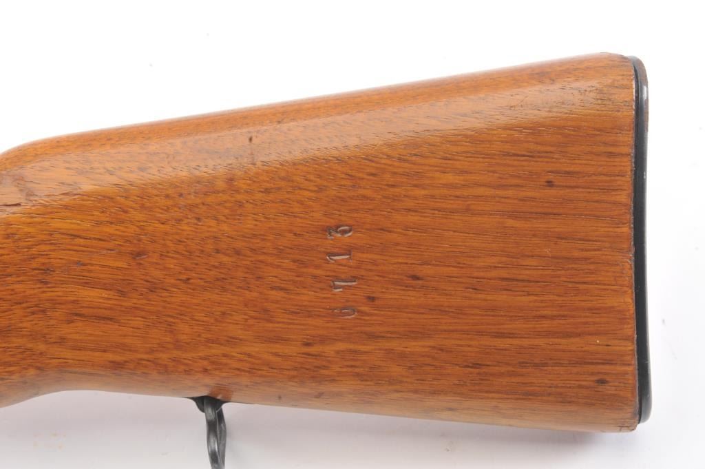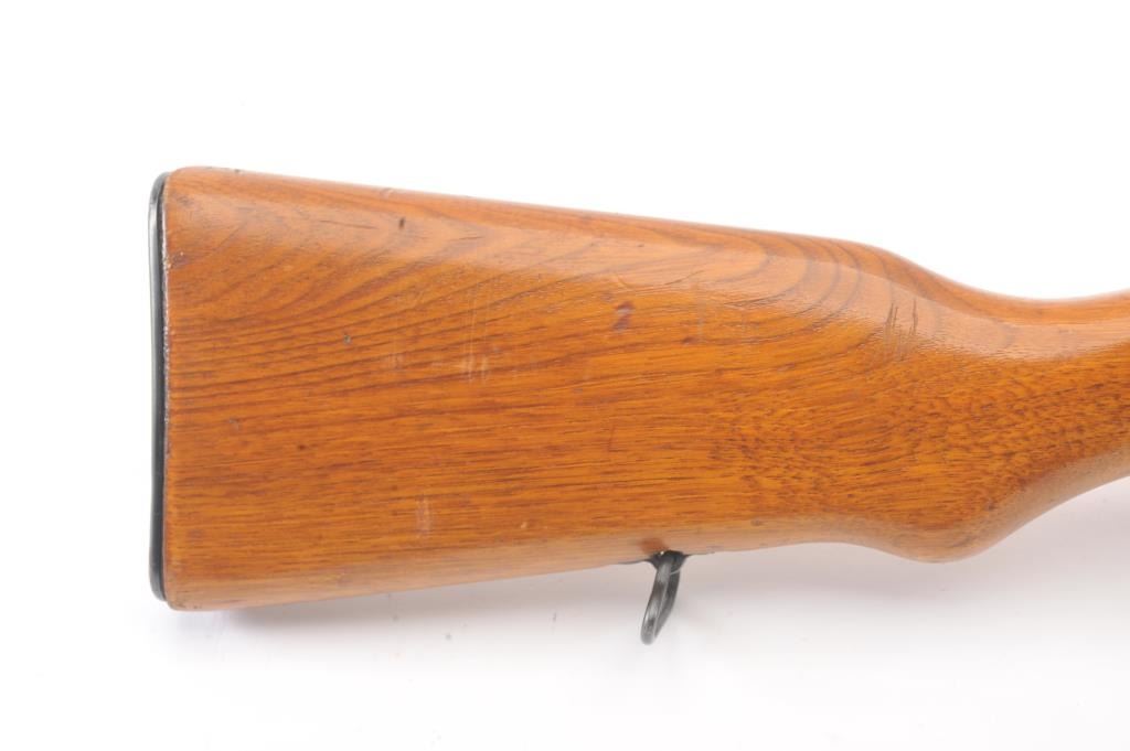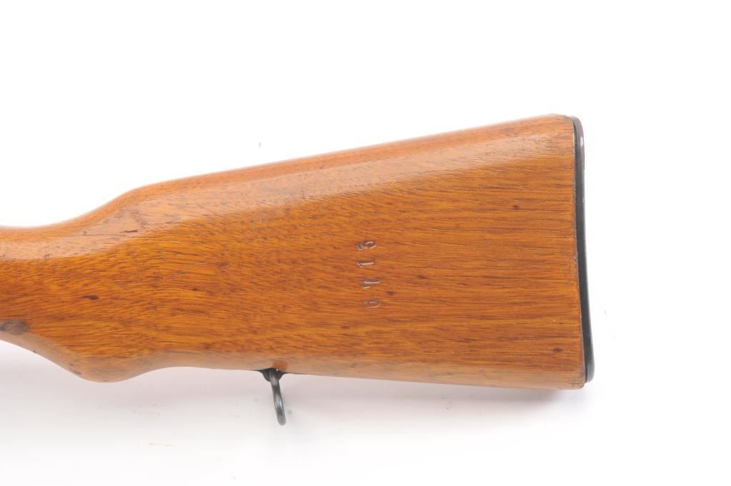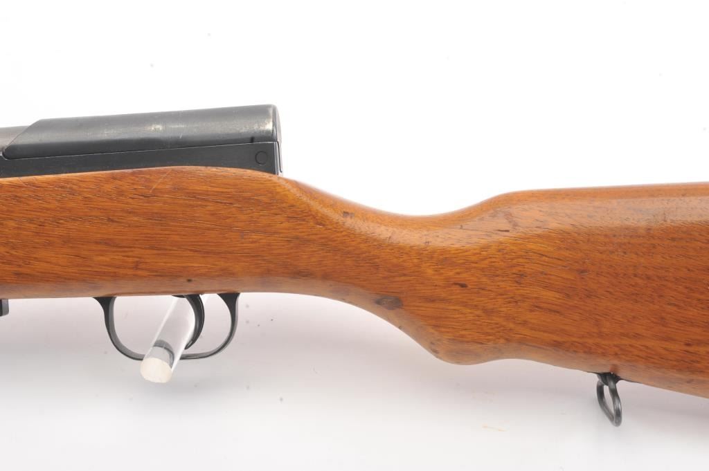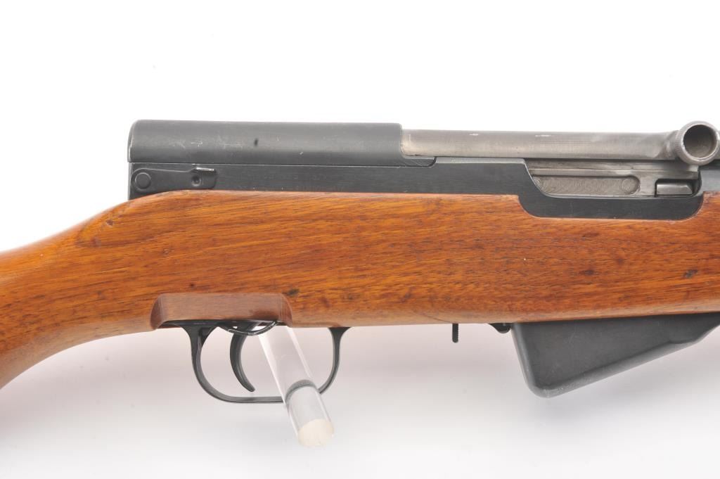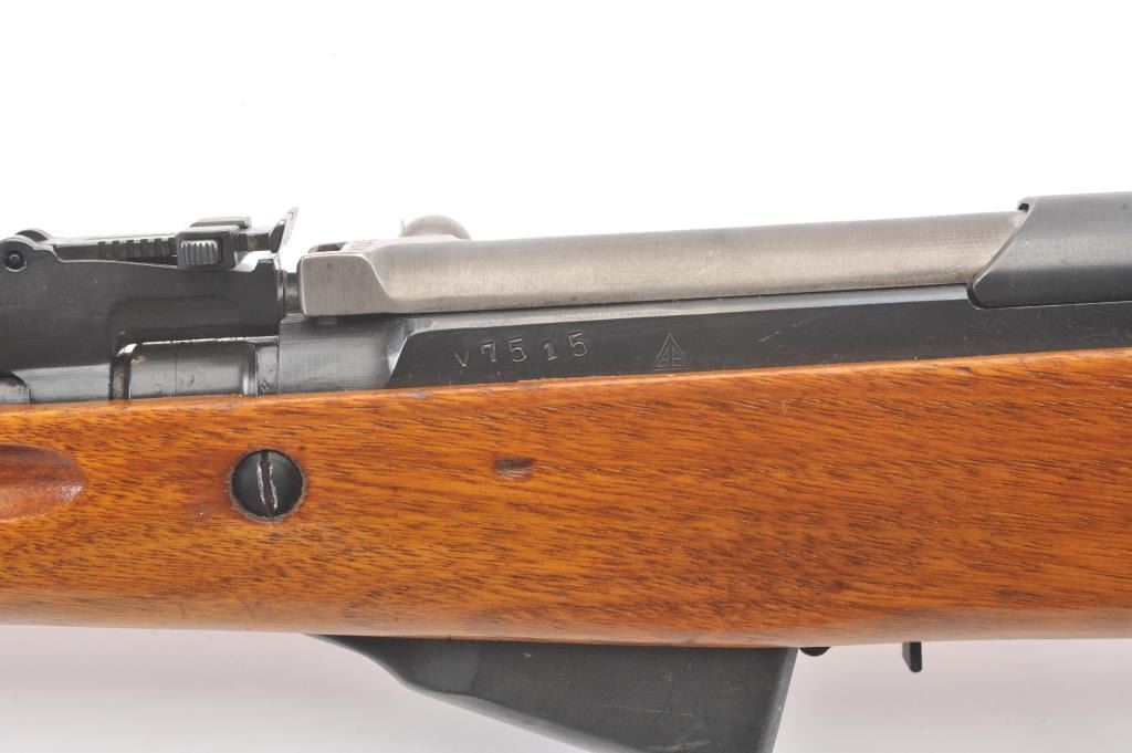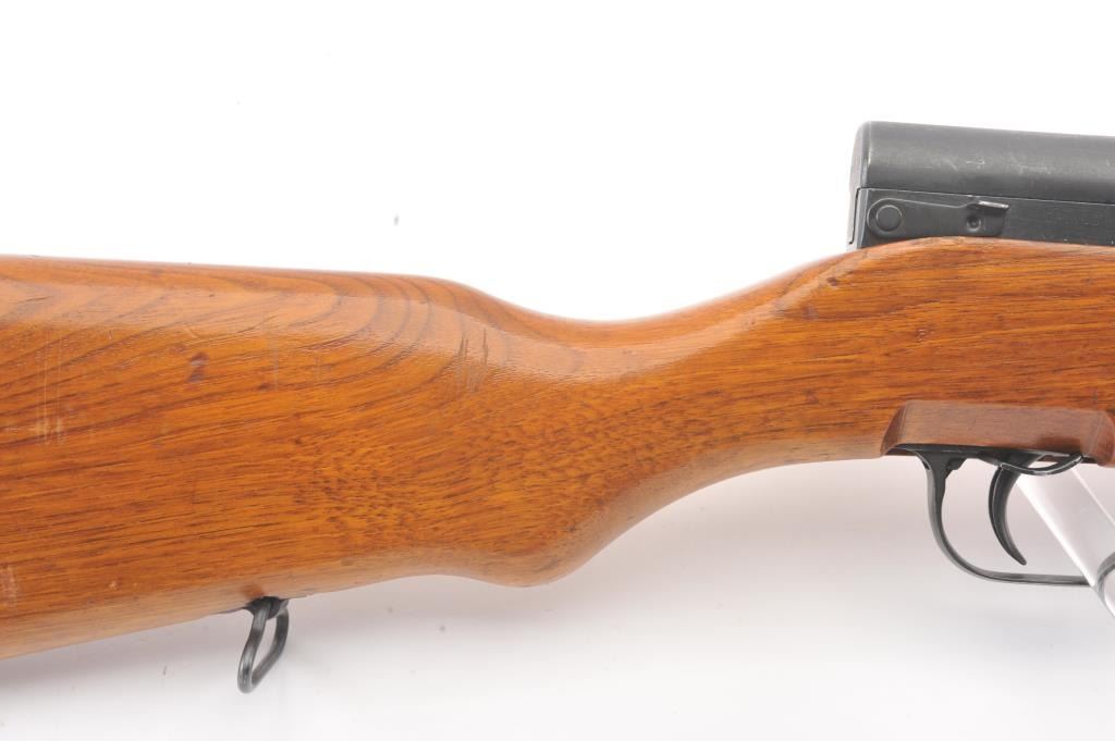 Chinese Norinco SKS semi-automatic rifle, 7.62 x 39 caliber, Serial #V7515. The rifle is in very good overall condition with a 20” barrel with a hooded aircraft front and military tangent rear sights. The rifleretains the majority of the military finish with all matching visible serial numbers. The smooth wood stock is in good overall condition with a mismatched piece on the fore end showing mars and compressions consistent with service use. The butt stock has had sling swivels and the folding bayonet is retained. The bore is good, the action is crisp and the markings are sharp. Est.: $250-$500. (Modern).