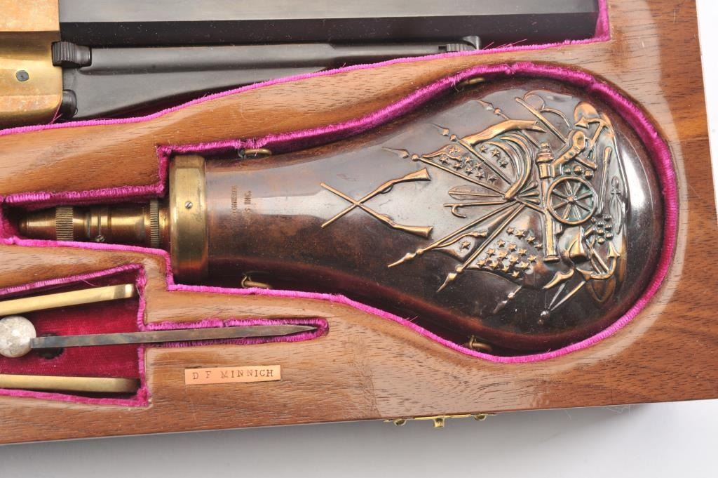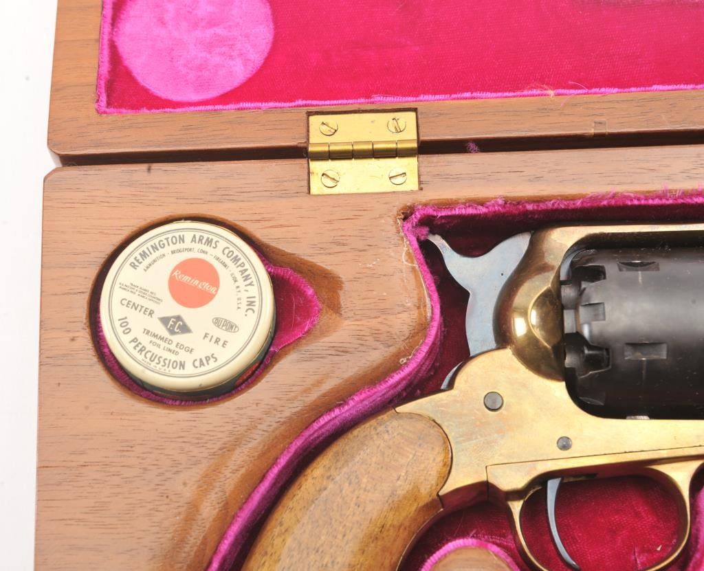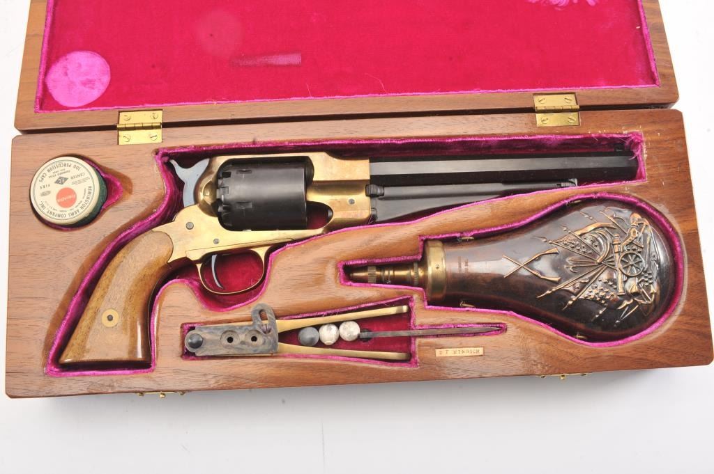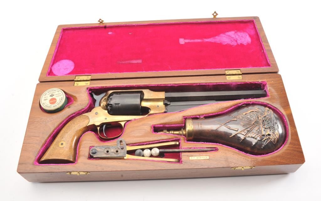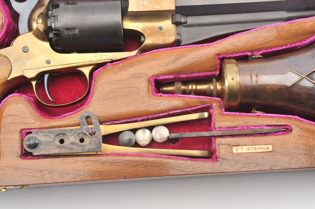 "Confederate" style .44 percussion revolver on Remington design with brass frame. Nicely cased in a hand made case with accessories. No markings, refinished and re-worked for a better appearance. (Antique) Est. $200-400