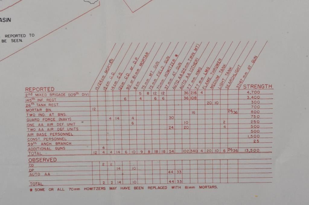 Reproduction of a WWII map of the island of Iwo Jima marked, “MILITARY INSTALLATIONS AND ESTIMATED TROOP DISPOSITIONS”. The map is based on a study of aerial photographs from the period of September 2, 1944 to December3, 1944 indicating Japanese troop strength and location of installations. The map measures 32” x 29” (Image only). The map is nicely framed in a dark Walnut colored wood in very good condition. Est.: $50-$100.