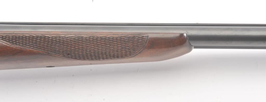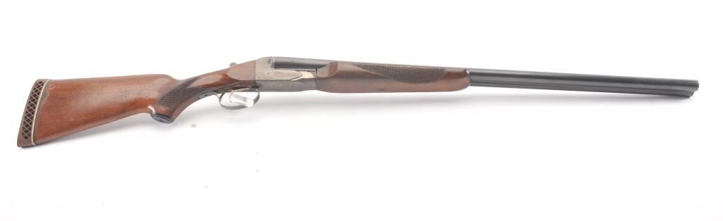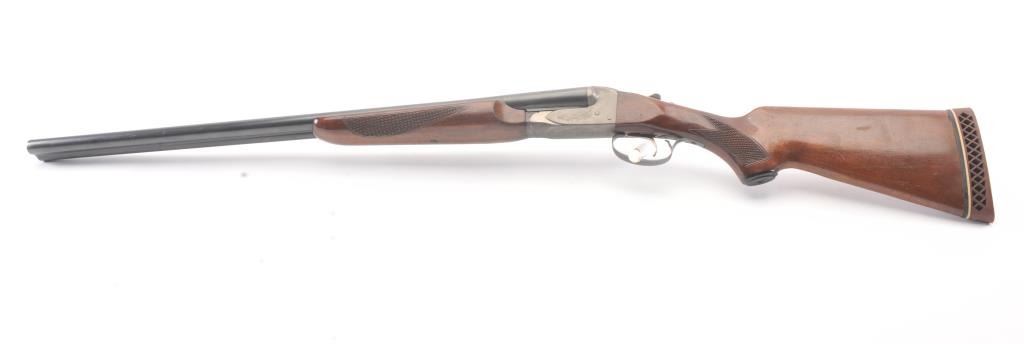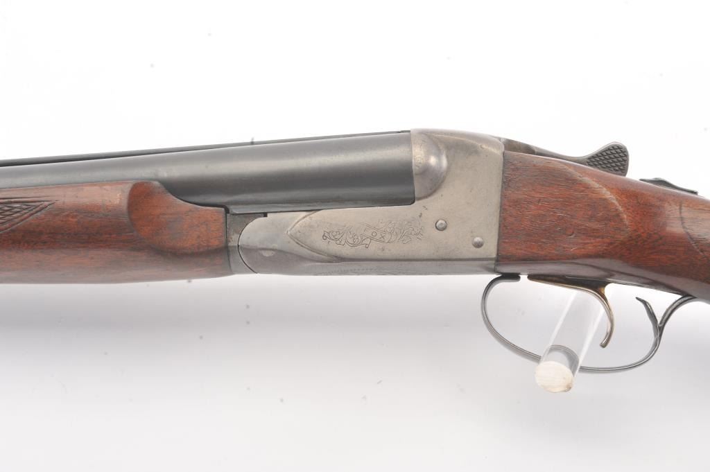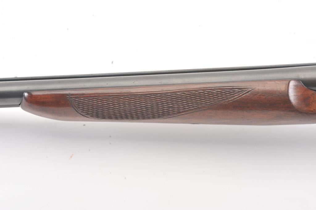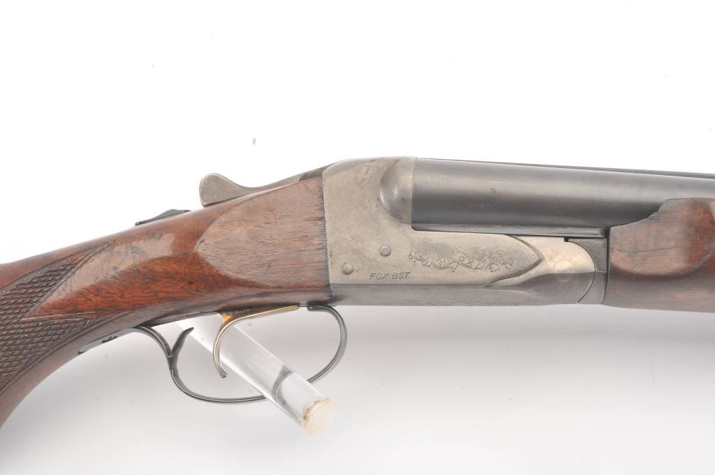 Fox Model B Side by Side shotgun, 16 gauge, Serial #NSNV. The shotgun is in very good overall condition with 28” barrels with a full-length ventilated rib. The barrels the majority of the blue finish with smallscratches and wear at the muzzles. The receiver is dull, toned case hardening drifting to grey patina. The checkered wood stocks are in very good condition with a beavertail fore end and ventilated rubberrecoil pad providing a 13 ½” LOP to a single gold trigger. The bores are good, the action is crisp and the markings are sharp. Est.: $200-$400. (Modern).