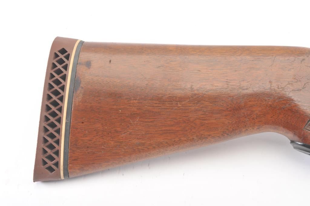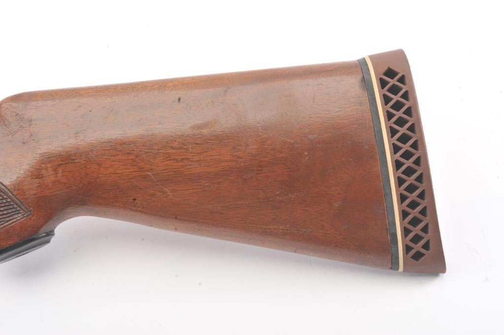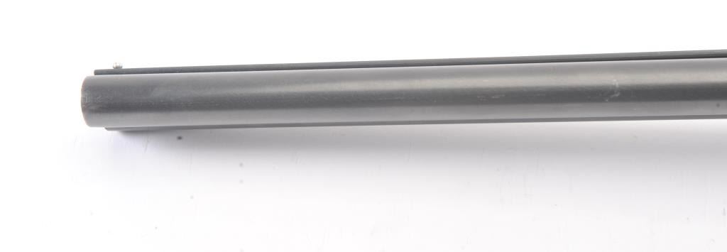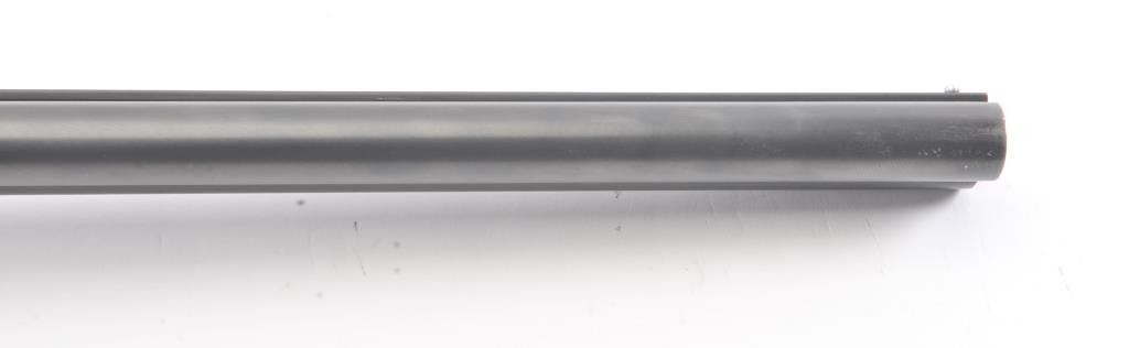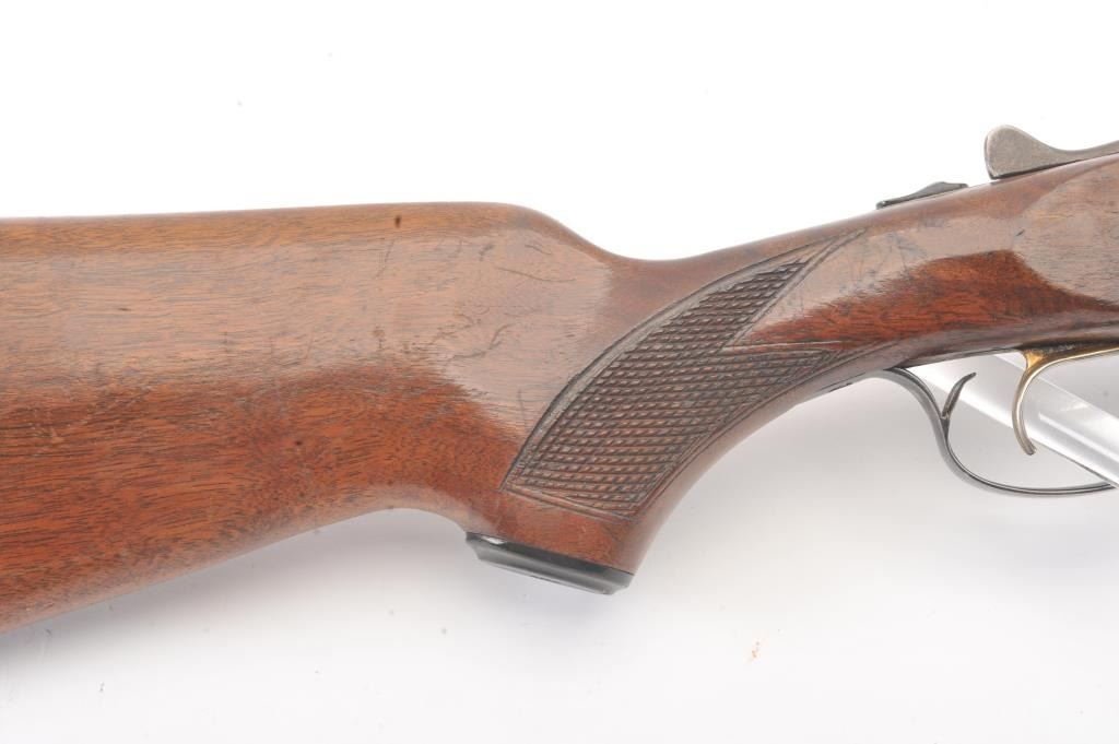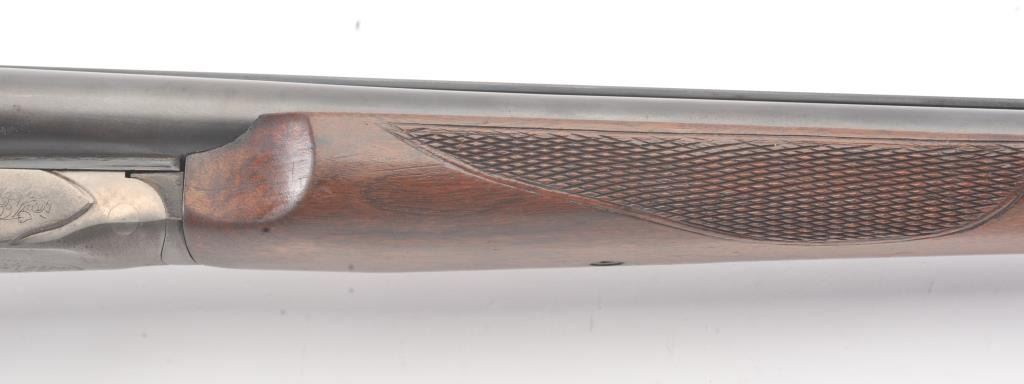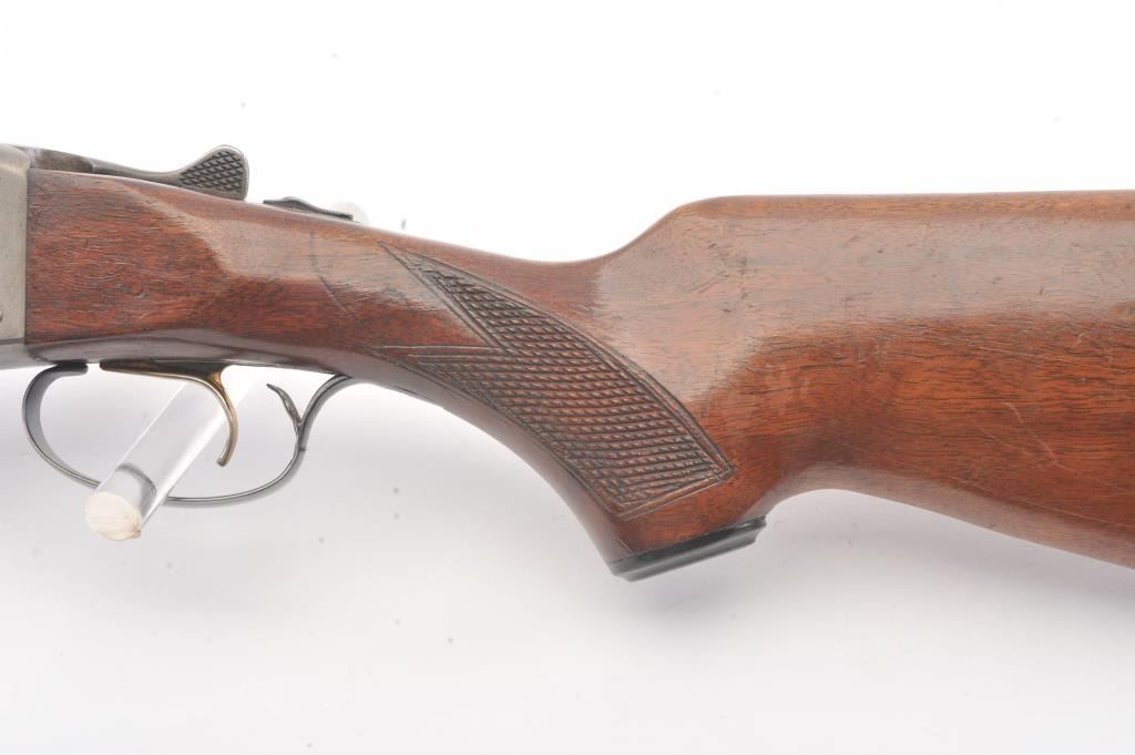 Fox Model B Side by Side shotgun, 16 gauge, Serial #NSNV. The shotgun is in very good overall condition with 28” barrels with a full-length ventilated rib. The barrels the majority of the blue finish with smallscratches and wear at the muzzles. The receiver is dull, toned case hardening drifting to grey patina. The checkered wood stocks are in very good condition with a beavertail fore end and ventilated rubberrecoil pad providing a 13 ½” LOP to a single gold trigger. The bores are good, the action is crisp and the markings are sharp. Est.: $200-$400. (Modern).