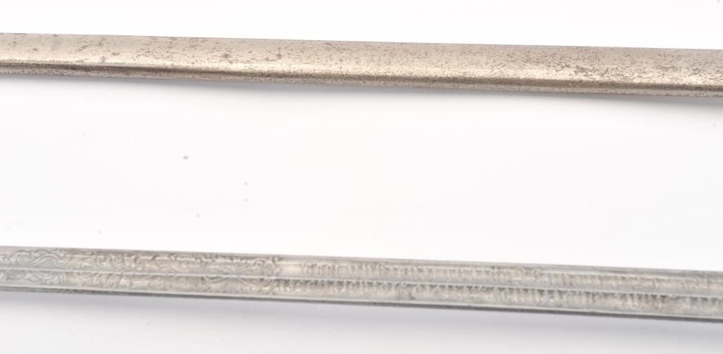 Swiss mdl 1899 presentation sword Mfd by Speyer Behm & Co., Bern-Zurich. Straight double fuller narrow blade is 30-½" long and has triple acid ornate etching. Blade shows much spotting. Obverse has paneledinscription in gothic font "Robert Stanz S./L. Freund Arnold Rohrstrasser//Z. Frol. Erinnering Aspirantenschule 1899" flanked by scrolled vine and leaf motifs. Reverse has similar motif in addition to an Athena headover a shield bearing the Swiss Cross emblem with sunburst pattern. Vine motif is etched on the spine. Metal dove head hilt has pierced guard with scrolled leaf motif and Swiss Cross on reeded background. Sharkskincovered grip has triple wire wrap. Leather finger strap is torn. Backstrap has a ribbed thumb rest. Rolled steel nickel plated scabbard has a single suspension ring. Some nicks on scabbard. Overall 35-¼" long. Est.: $400-$800