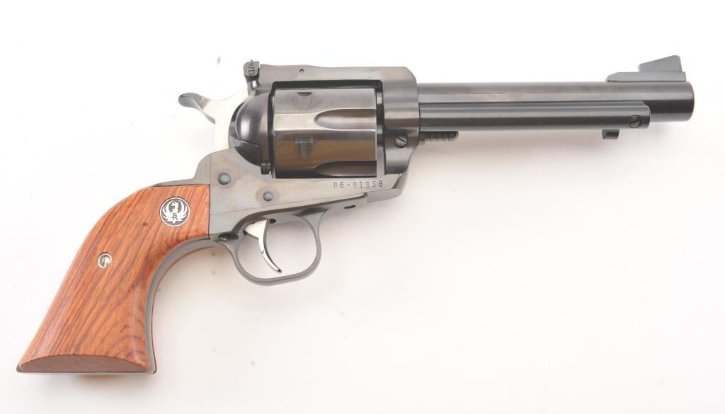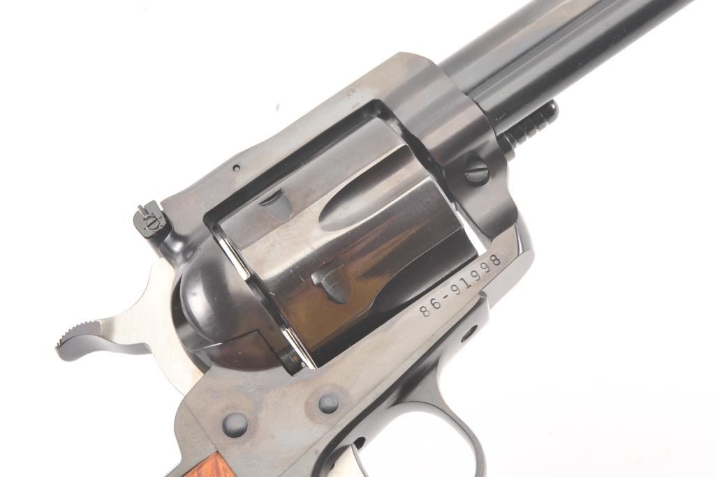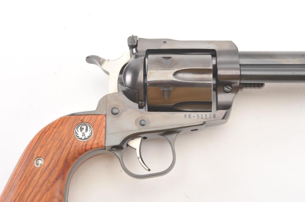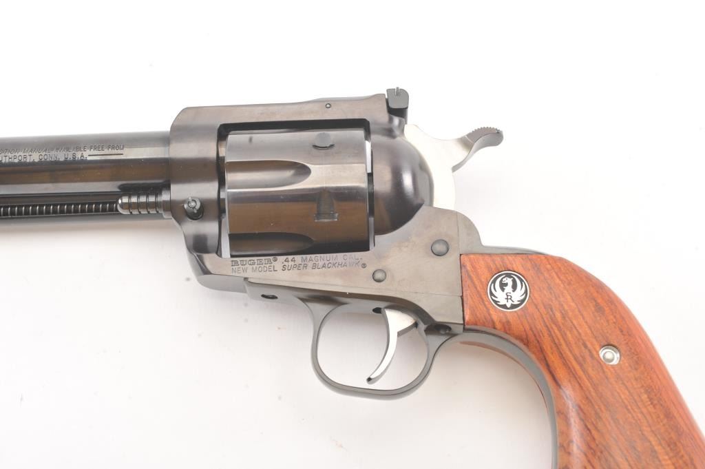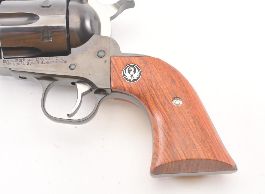 Ruger New Model Super Black Hawk SA revolver, .44 Magnum caliber, Serial #86-91998. The pistol is as new in the factory plastic case with a 5 ½” barrel. The pistol retains approximately 99% of the blue finish showinglittle to no use. The smooth wood medallion grips are in excellent condition. The pistol comes with the factory plastic case with all associated packaging materials. Est.: $250-$500. (Modern/PPT).