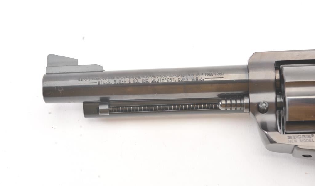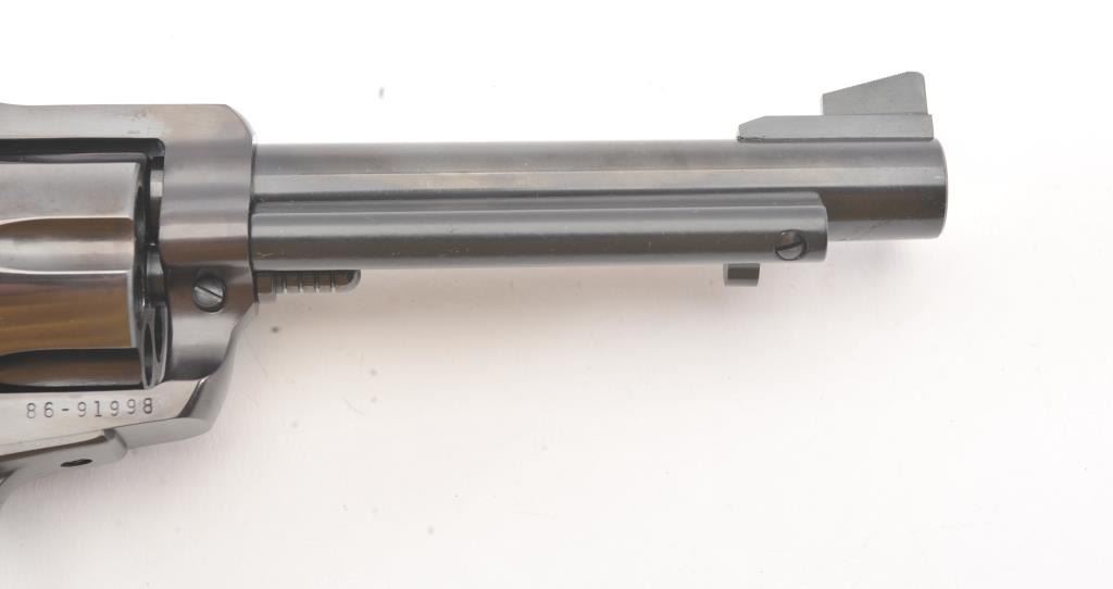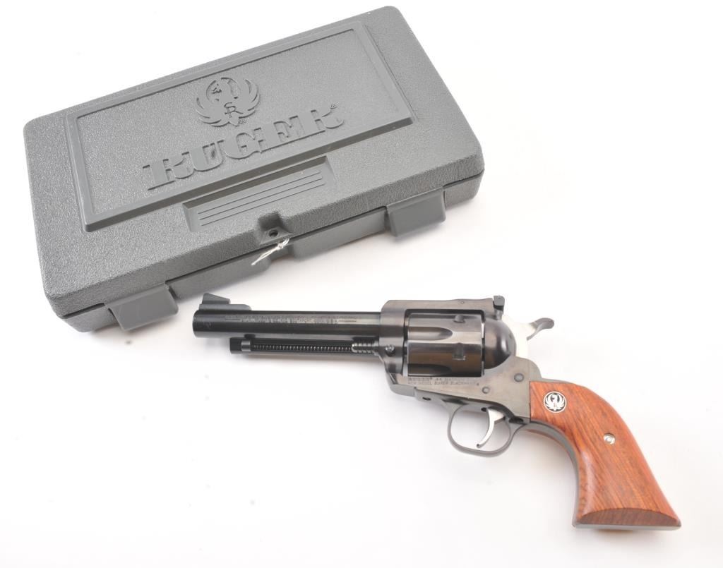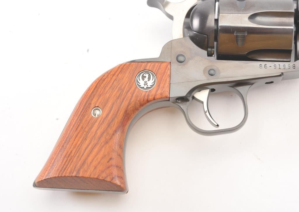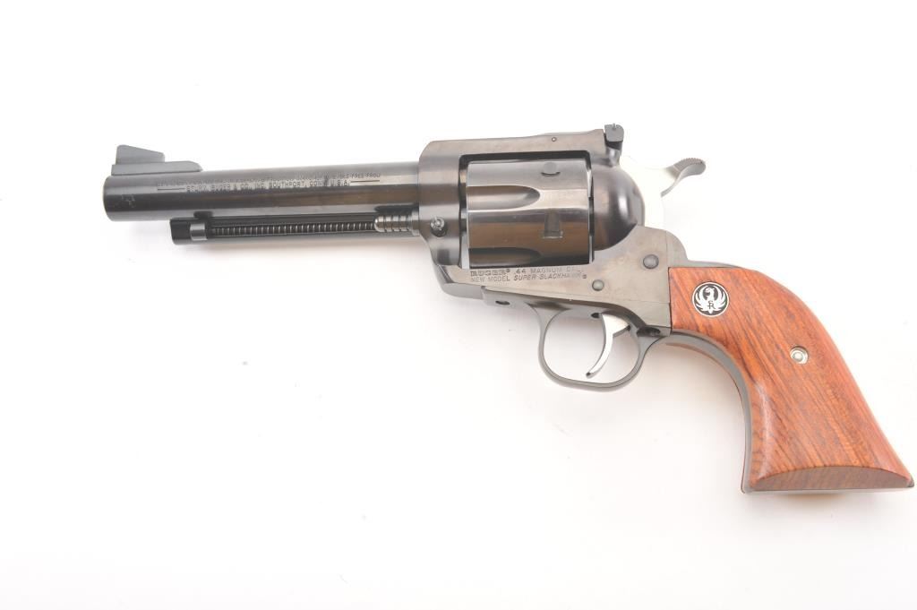 Ruger New Model Super Black Hawk SA revolver, .44 Magnum caliber, Serial #86-91998. The pistol is as new in the factory plastic case with a 5 ½” barrel. The pistol retains approximately 99% of the blue finish showinglittle to no use. The smooth wood medallion grips are in excellent condition. The pistol comes with the factory plastic case with all associated packaging materials. Est.: $250-$500. (Modern/PPT).