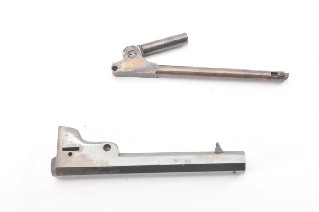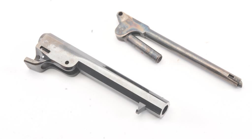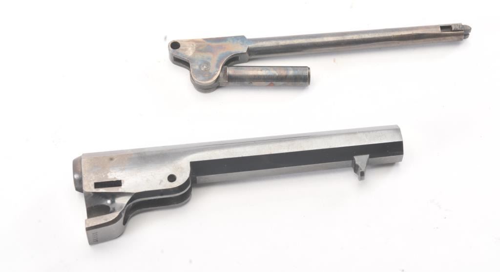 Lot of Colt parts. 1. 5 ½” barrel for Colt pocket navy, S/N 15817. 60%-70% bright flaking blue. Very good plus to almost fine. 2. Loading lever for Colt Navy un-numbered(Excellent old copy and probably Weiss.) 90% case colors. Est.: $150-$300