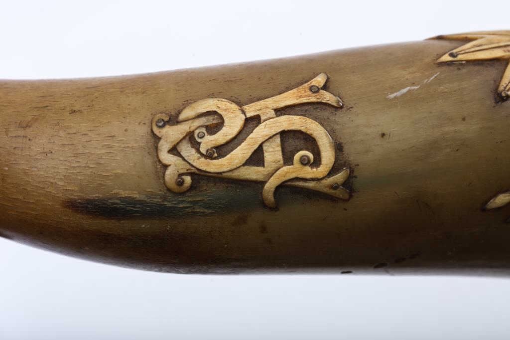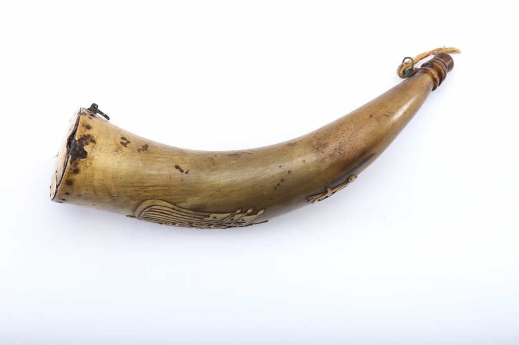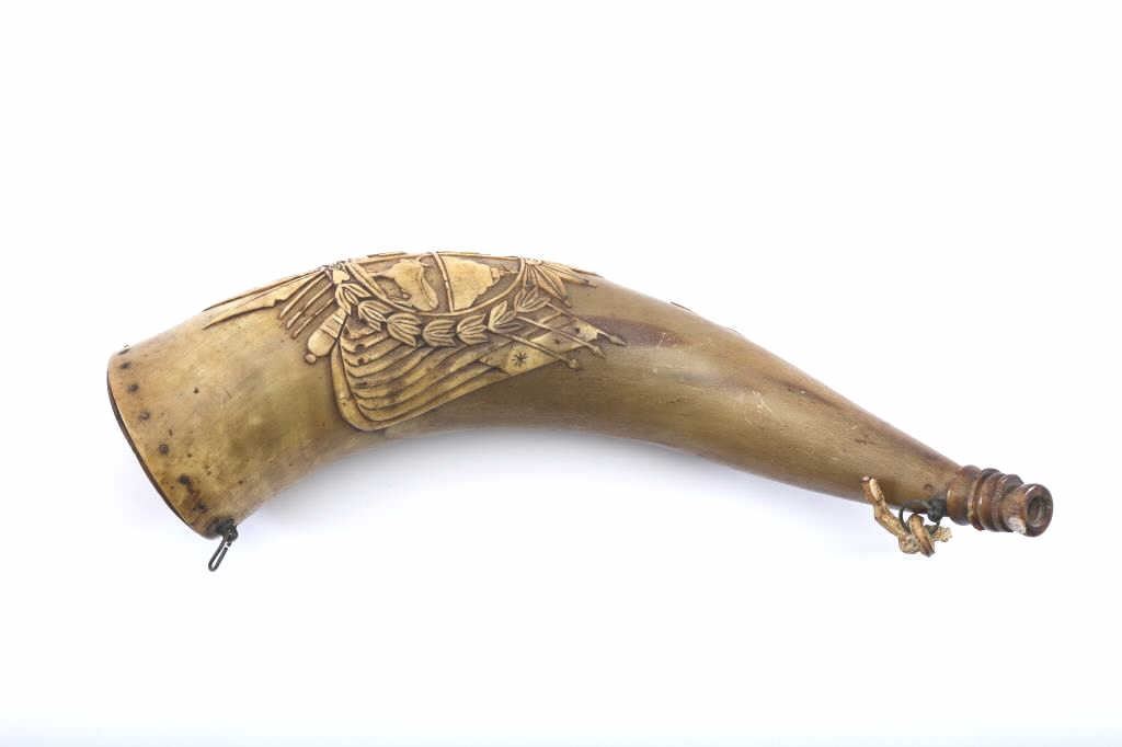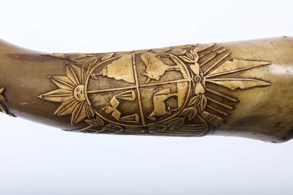 Finely relief carved Mexican powder horn with raised initials “S.A.”. The body of the horn shows a stand of arms and flags with crest at the center with Aztec style sun above. The crest is divided into 4 equal parts. Theleft shows scales of justice. The right shows flag on front resting on mountain top, bottom left shows horse with left hoof raised, and right shows bull. The horn is 15” across the curve and of generousproportions. Nice patina and dates early to Mid-19th century. Some breaks and small losses to the bottom and plug and some “Worm Holes” in the horn. From an old Northern California collector who purchased near SanAntonio about 50 years ago. Note: The crest should be researched as General Lopez de Santa Ana was affectations and known to fancy crests, regalia and finery. Est.: $500-1000