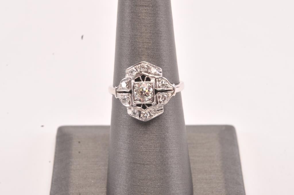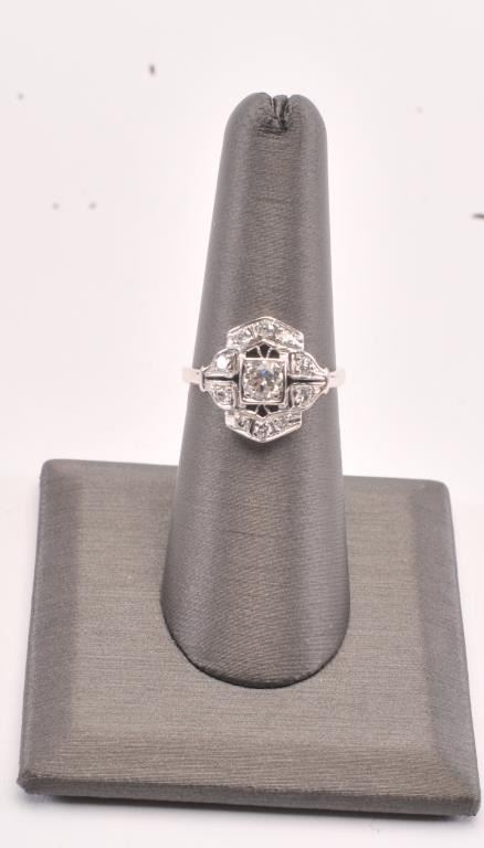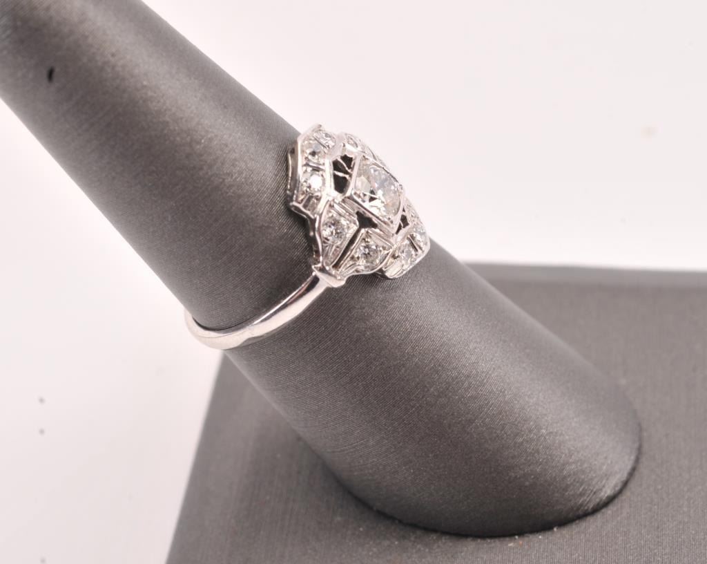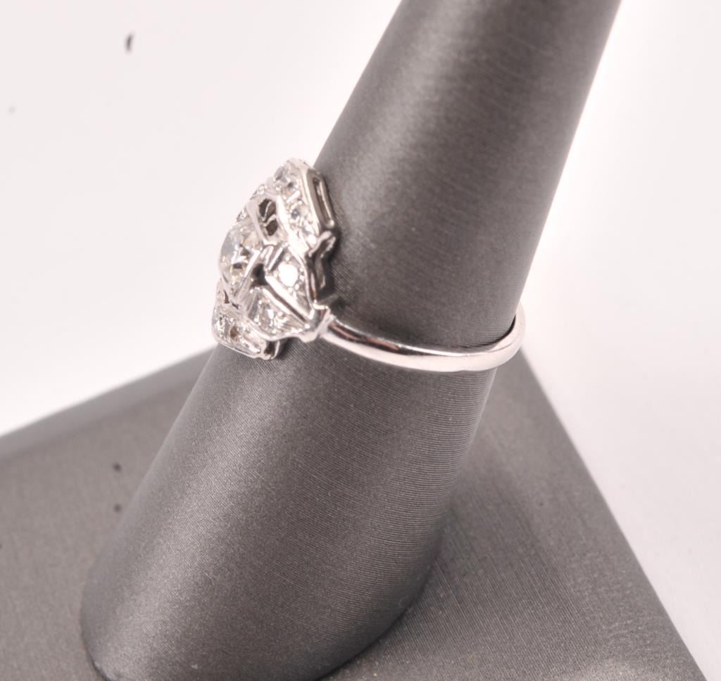 Vintage ring in platinum set with a fine round diamond and accent diamonds weighing approx 0.75ct Est:$750-1500