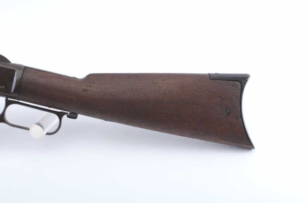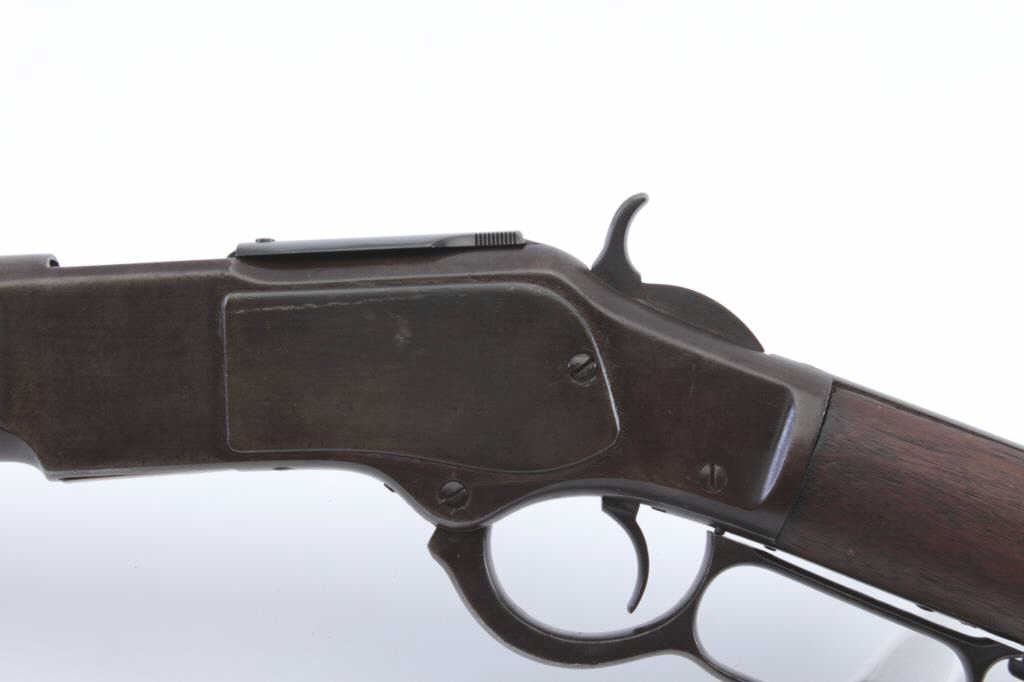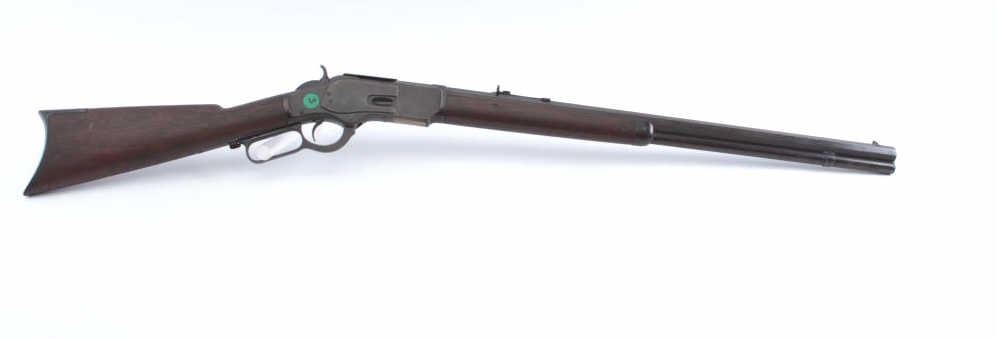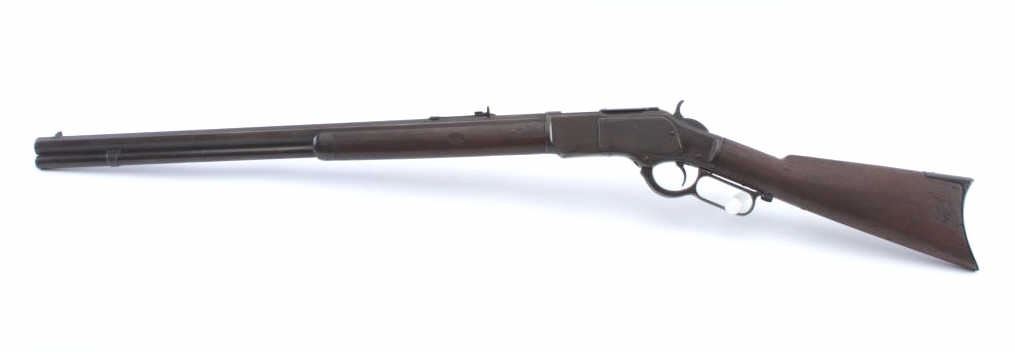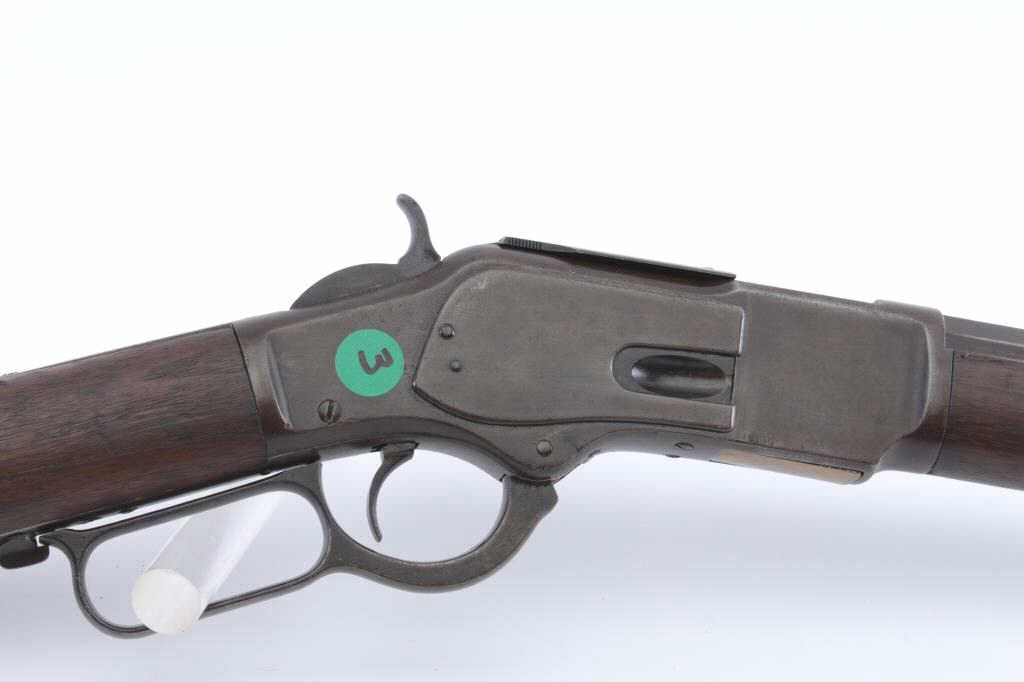 Frontier era Winchester Model 1873 Lever Action rifle in .44-40 caliber with a 24” octagon barrel, full mag, and rifle butt, S/N 99782A. Shows brown patina with some blue mixed in. Good address and markings. Thestocks have been cleaned and sanded. The dust cover is a glaring bright blued replacement and needs to be toned down to brown matching color. The action is good and the bore is fair. No marking on lifter. A 6-7 on a 1-10scale. Est.: $900-1800