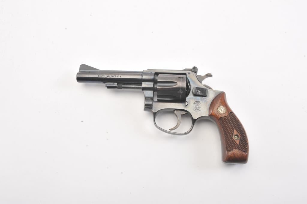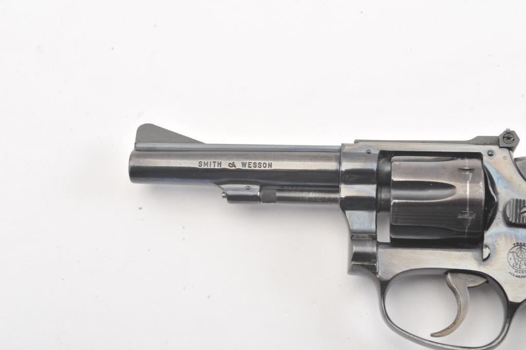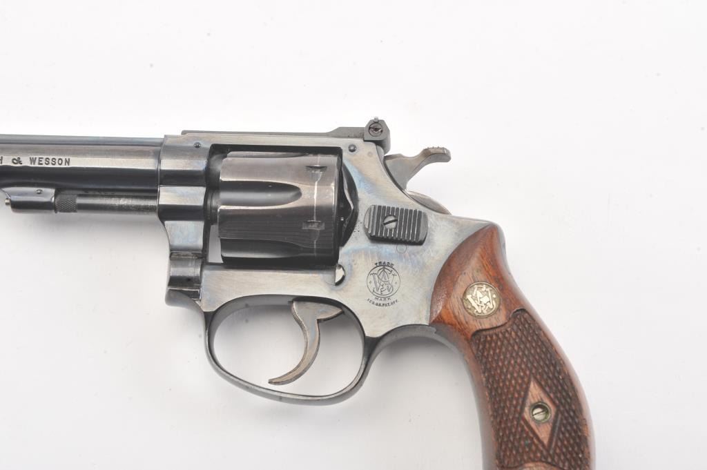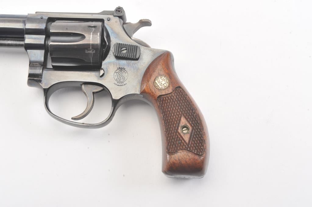 Smith & Wesson 22/32 Kit gun with a 4” barrel, Serial #20180 (Square Box) in correct period with correct end label, except marked for a round butt. The pistol retains approximately 90%-95% original blue showingnormal wear and use with an index line around the cylinder. The action is good, the bore is good and markings are sharp on this desirable kit gun. The Serial # on the bottom of the box in grease pencil alsomatches. Est.: $500-$1,000. (C+R).