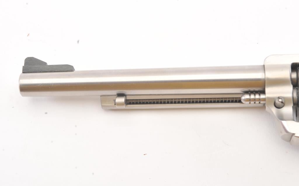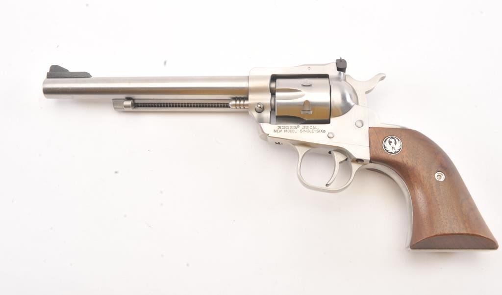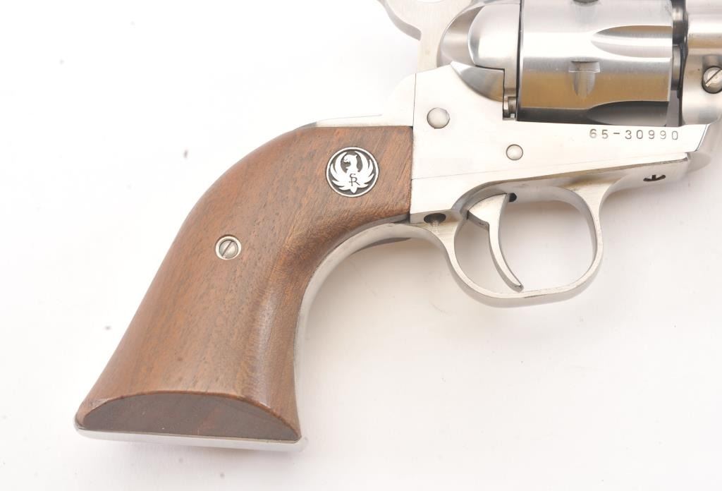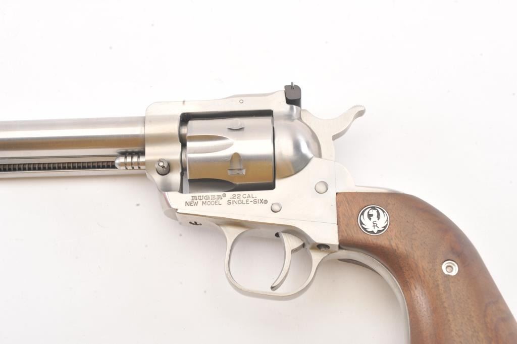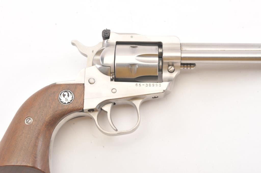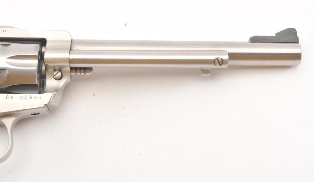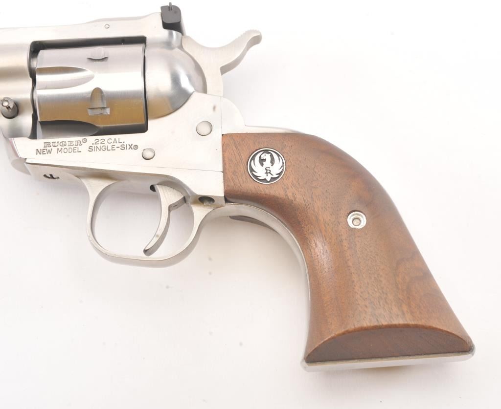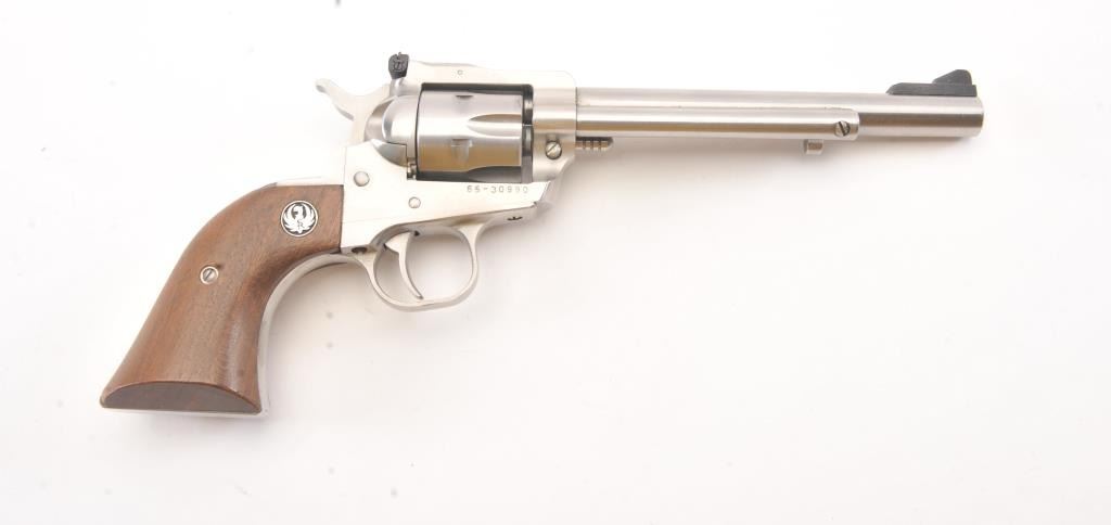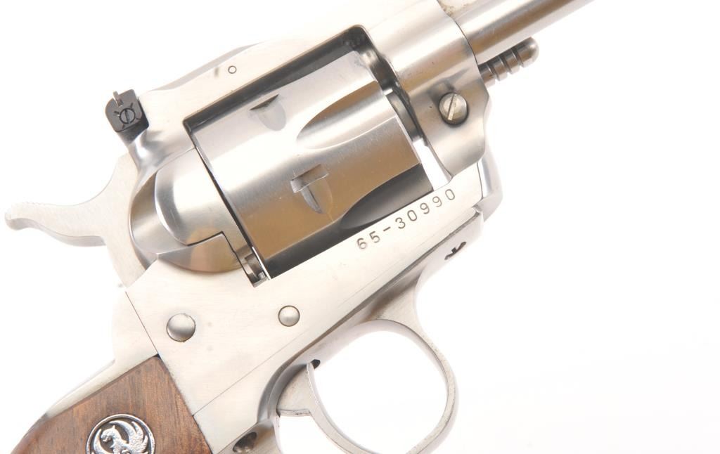 Ruger New Model Super Single Six SA revolver, .22 Long Rifle caliber, Serial #65-30990. The pistol is as new in the factory cardboard box with a 6 ½” barrel with a ramped blade front and adjustable rear sights. The pistol retains approximately 98%-99% of the stainless steel finish. The smooth wood medallion grips are in excellent condition. The lot includes the factory cardboard box, an extra .22 Winchester Magnum cylinder andall associated packaging materials. Est.: $250-$500. (Modern/PPT).