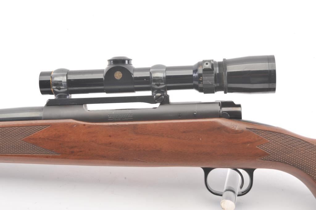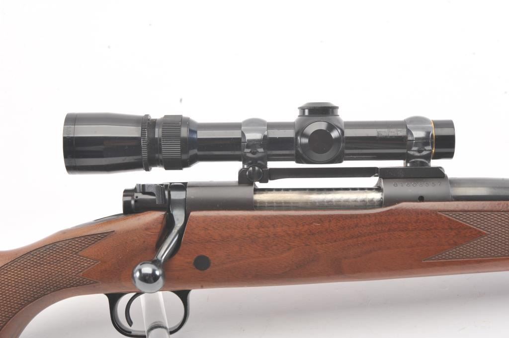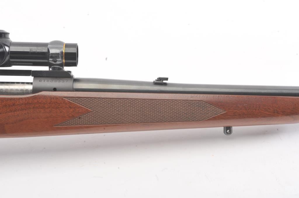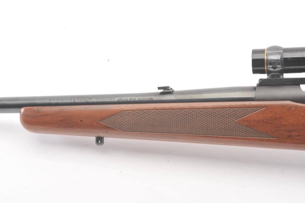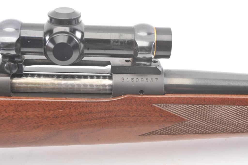 Post-64 Model 70 Westerner bolt action sporting rifle, 7mm Remington Magnum caliber, Serial #G1608557. The rifle is in nearly excellent overall condition with a 24” barrel with a ramped blade front and a folding rear sight. The rifle retains approximately 98%-99% of the blue finish with a jeweled bolt. The checkered wood stock is in very good condition with small mars and compressions. The butt stock ends with asolid rubber recoil pad providing a 13 ½” LOP. The rifle is topped with a one-piece Redfield mount and a Leupold VARI-X III 1.5 x 5 variable power rifle scope with clear, crisp optics. The bore is good and theaction is crisp on this nice Model 70. Est.: $350-$700. (Modern).