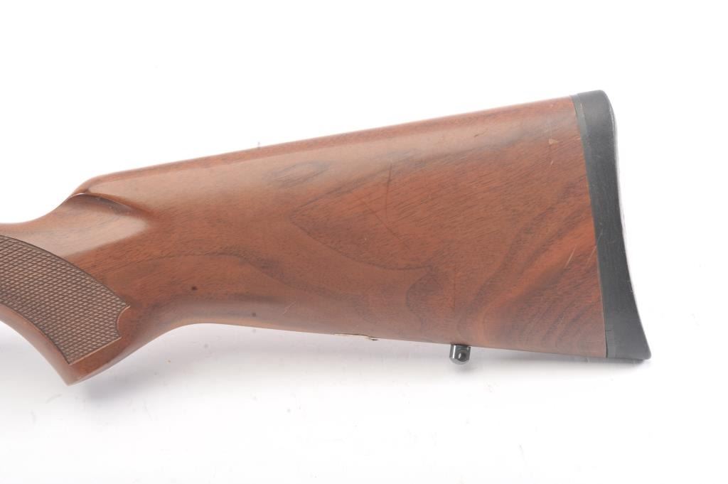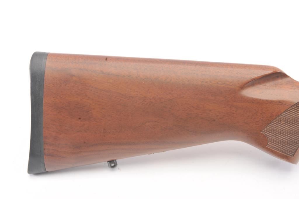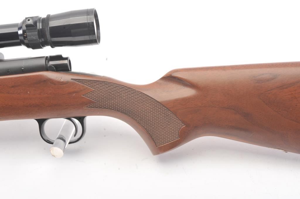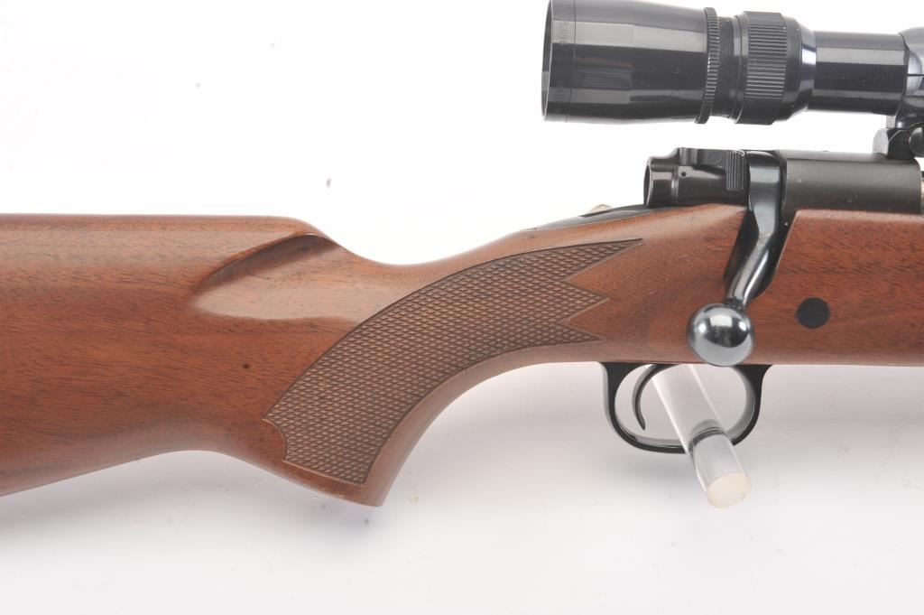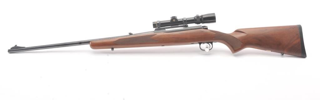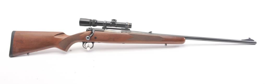 Post-64 Model 70 Westerner bolt action sporting rifle, 7mm Remington Magnum caliber, Serial #G1608557. The rifle is in nearly excellent overall condition with a 24” barrel with a ramped blade front and a folding rear sight. The rifle retains approximately 98%-99% of the blue finish with a jeweled bolt. The checkered wood stock is in very good condition with small mars and compressions. The butt stock ends with asolid rubber recoil pad providing a 13 ½” LOP. The rifle is topped with a one-piece Redfield mount and a Leupold VARI-X III 1.5 x 5 variable power rifle scope with clear, crisp optics. The bore is good and theaction is crisp on this nice Model 70. Est.: $350-$700. (Modern).