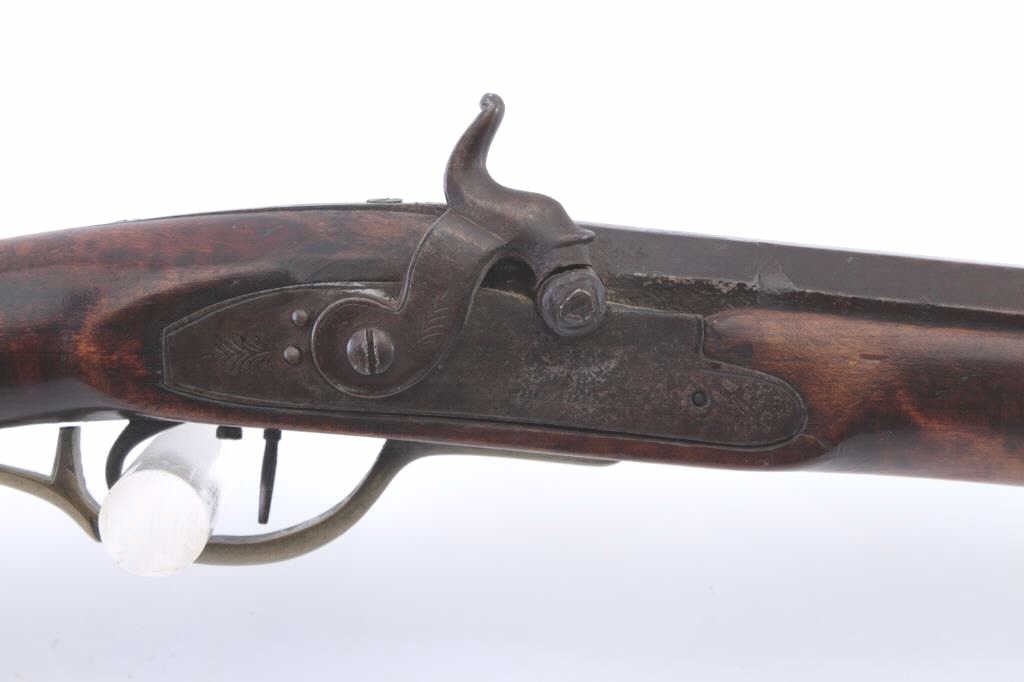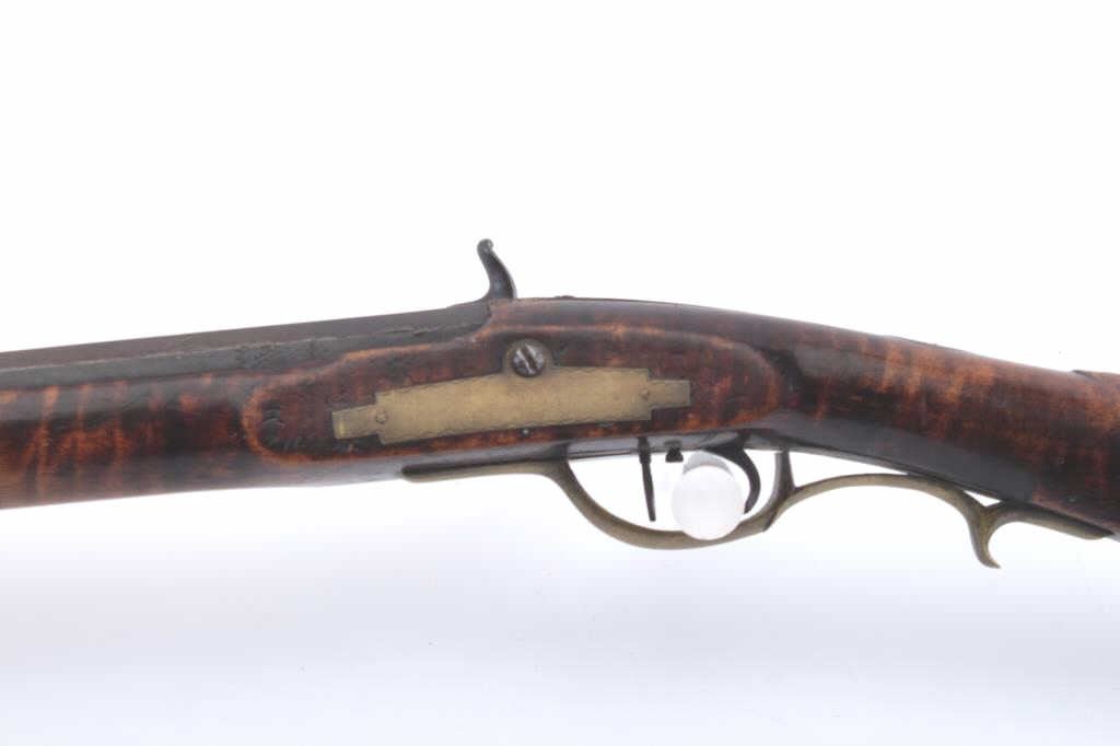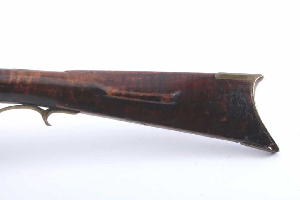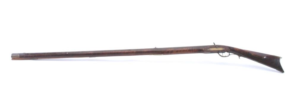 Full stocked percussion Kentucky rifle with barrel engraved “A.M.” in script. The lock is marked “Bird Bros, Philadelphia”. Measures 57” overall with a 43” barrel of .41 caliber rifled. Sleek styling with narrow buttmeasuring only 3 5/8” from top to the bottom of butt plate at heel. Set trigger with engraved patch box. The stock is fair to good and would have been very good except large sliver of wood missing at the top leftforward edge of the stock approximately 10” x ¼” also some damage to toe and blackening of stock which may hide damage or filled in wood on the left rear of buttstock (Sounds worse than it really is). The action workswell but the nipple is missing. From an old Northern California collection found between Clear Lake and Happy Camp. (Antique) Est.: $1000-2000