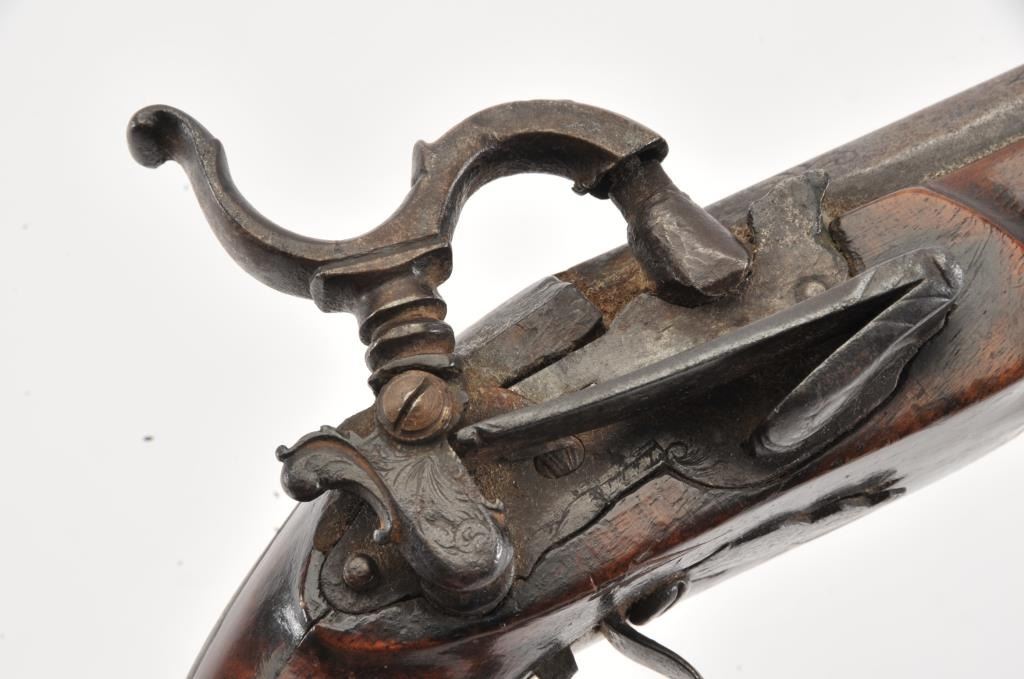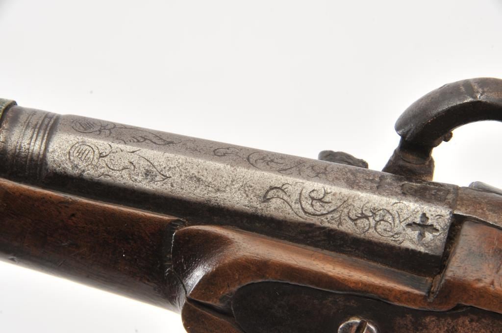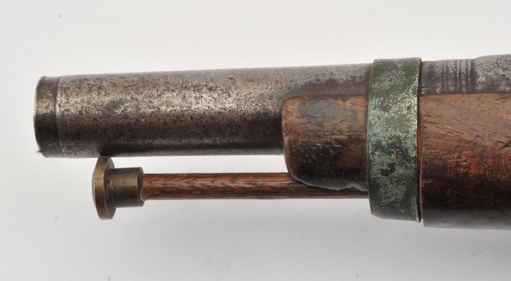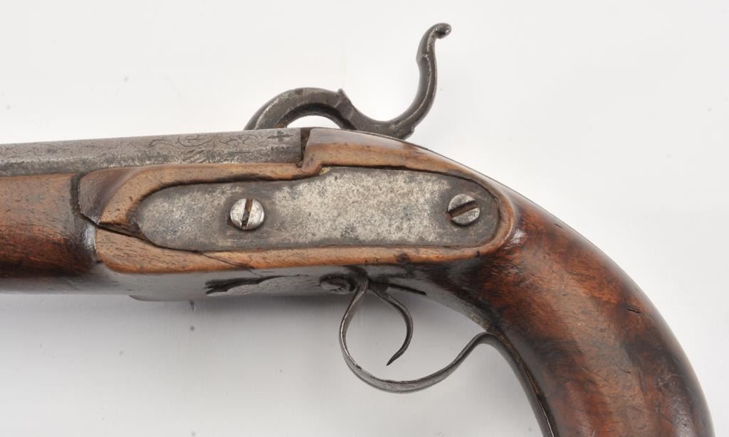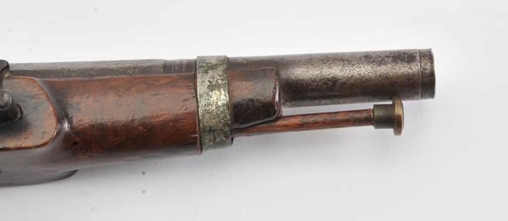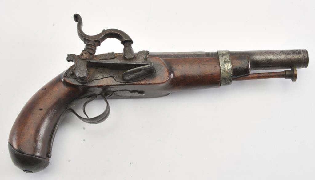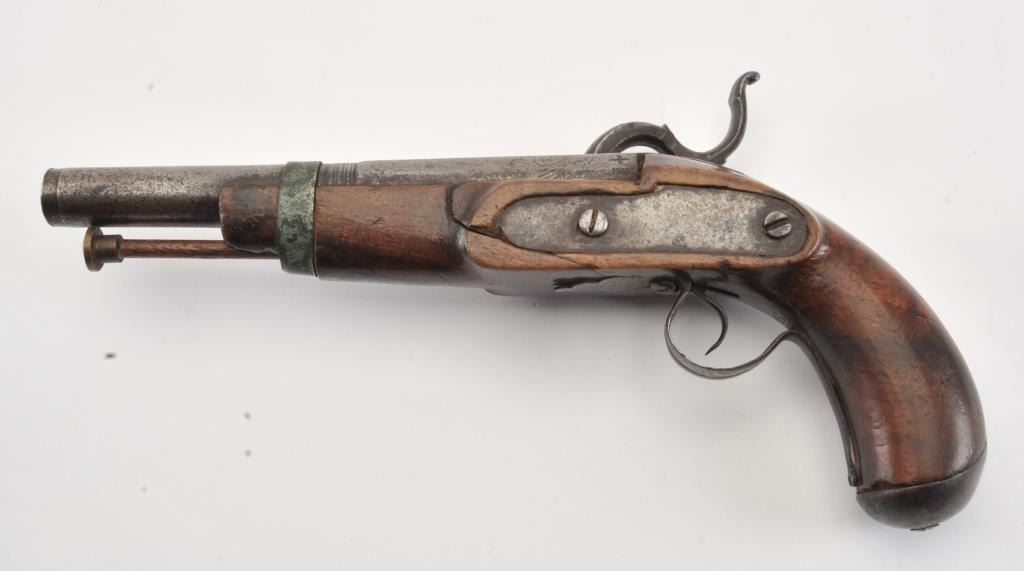 Spanish Miquelet pistol showing period conversion to percussion with maker’s mark at rear of barrel which is not legible. Good overall condition with minor pitting, erosion and dark patina. The wood is sound and fairto good with one split and normal aging. .60+ caliber smoothbore caliber and 11 ½” overall with a 7 ¼” barrel. Spanish colonial era with a very characteristic hammer. (Antique) Est.: $300-$600