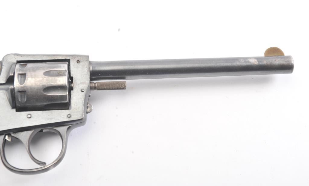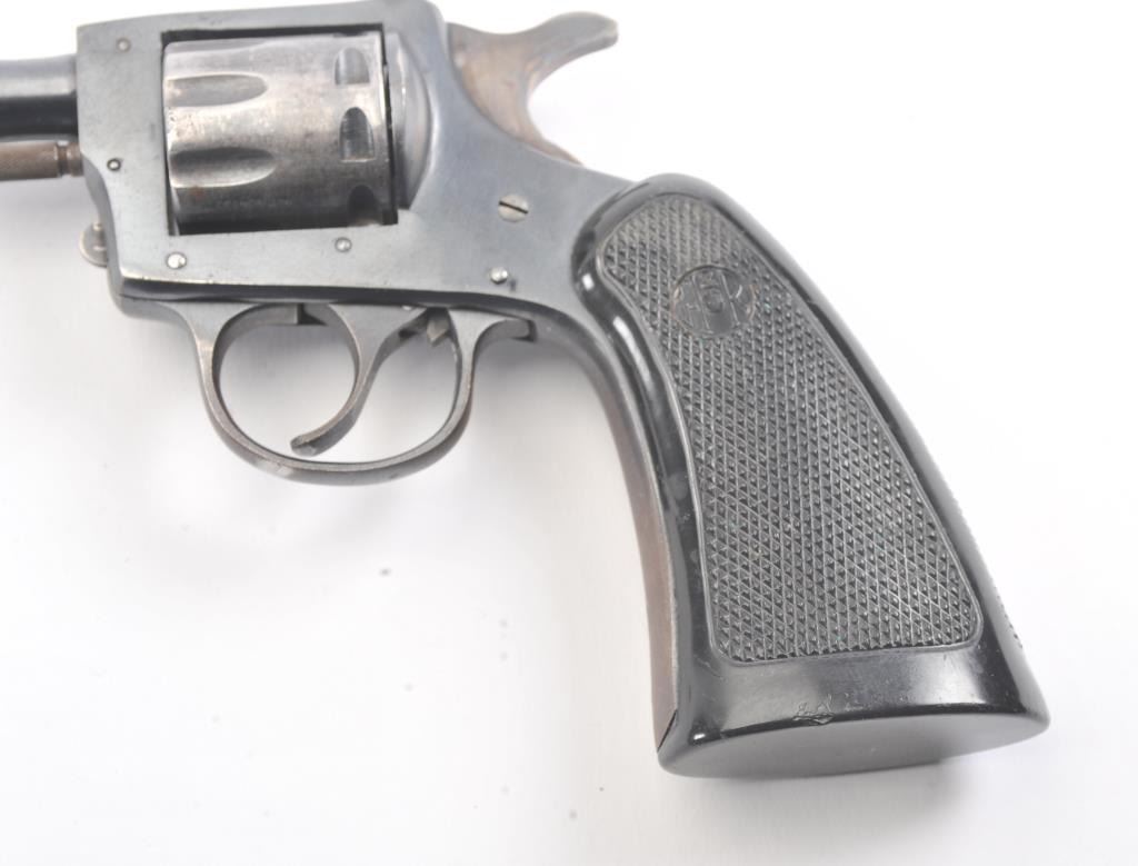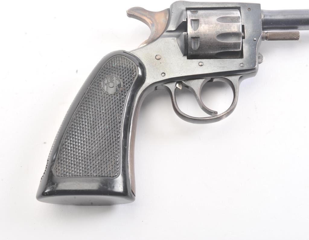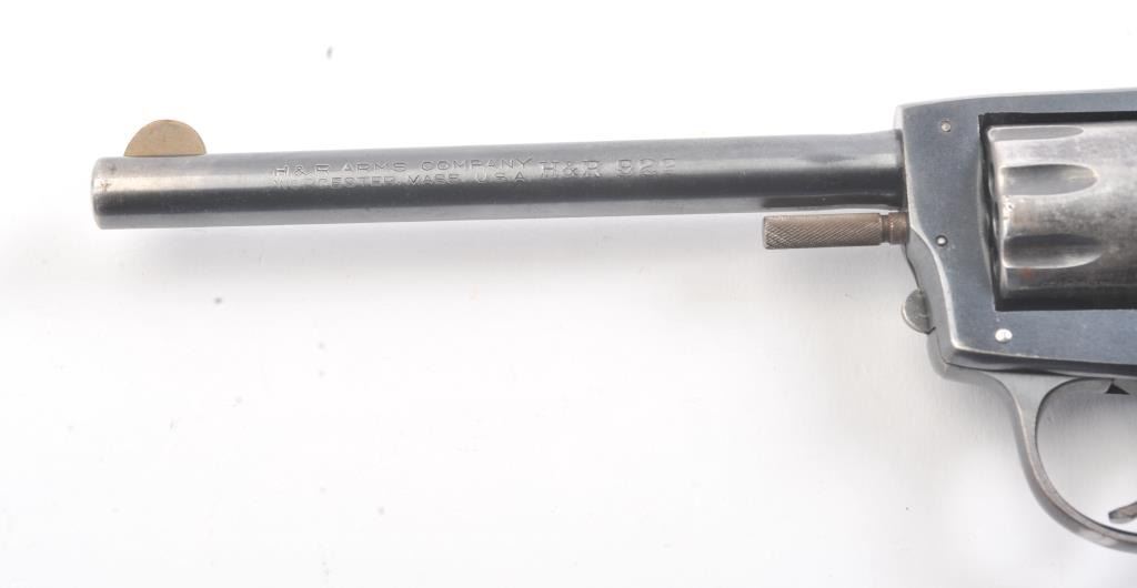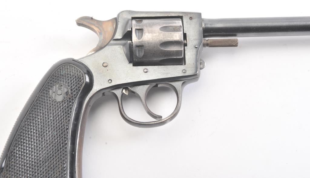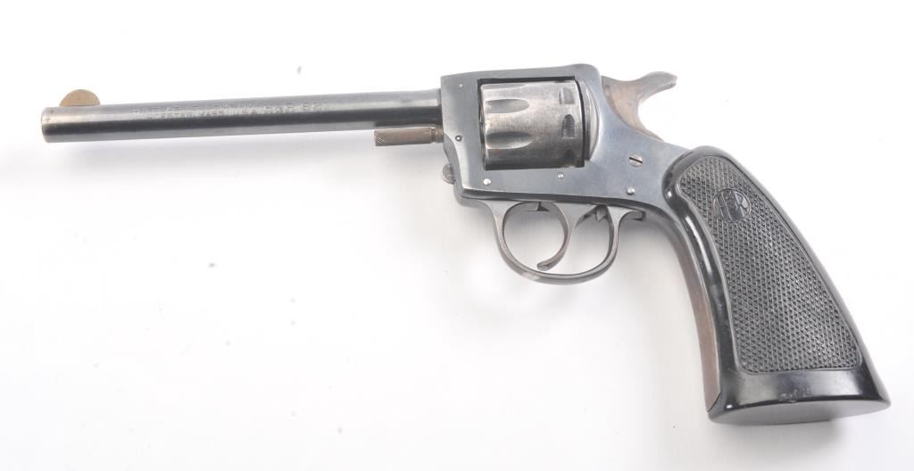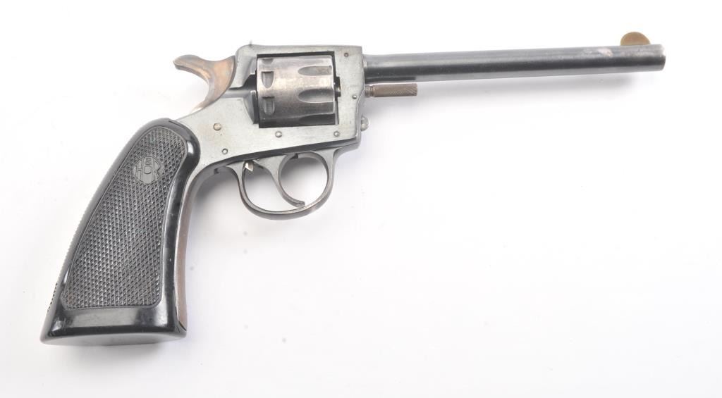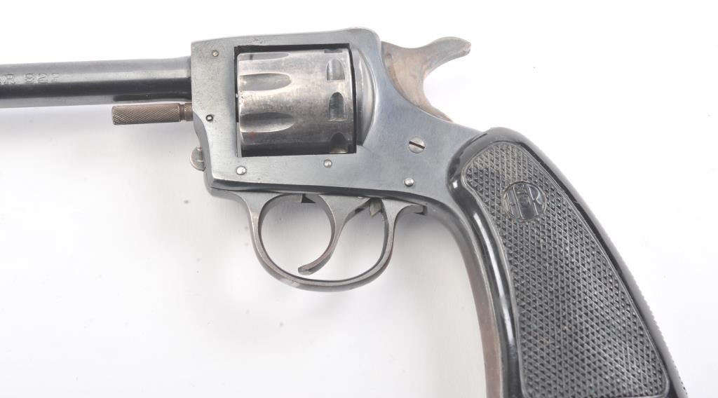 Harrington & Richardson Trapper Model 922 DA revolver, .22 caliber, Serial #A1067. The pistol is in very good condition with a 6” barrel with a brass blade front sight. The pistol retains a significant amount ofthinning blue finish with losses at the muzzle and on the cylinder. The checkered plastic grips are in good condition. The bore is good and the action functions on this nice H&R. Est.: $125-$250. (C+R/PPT).