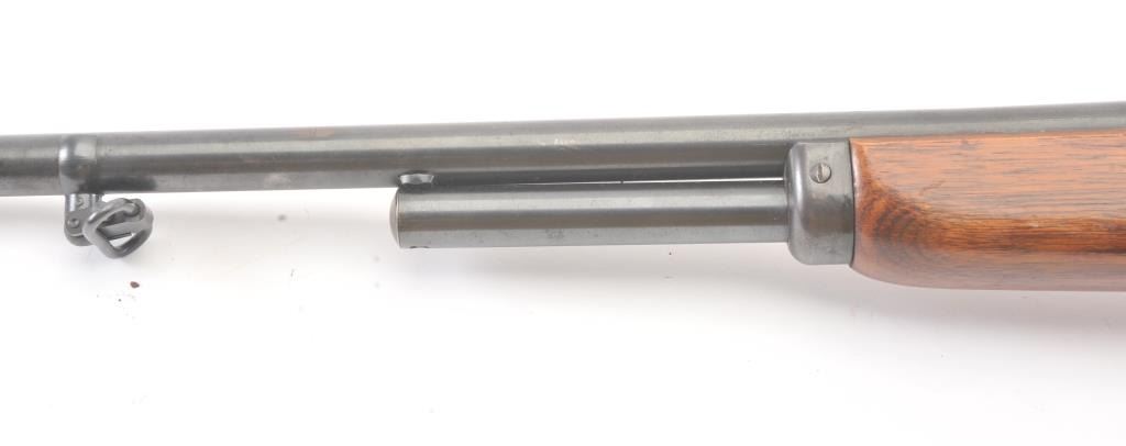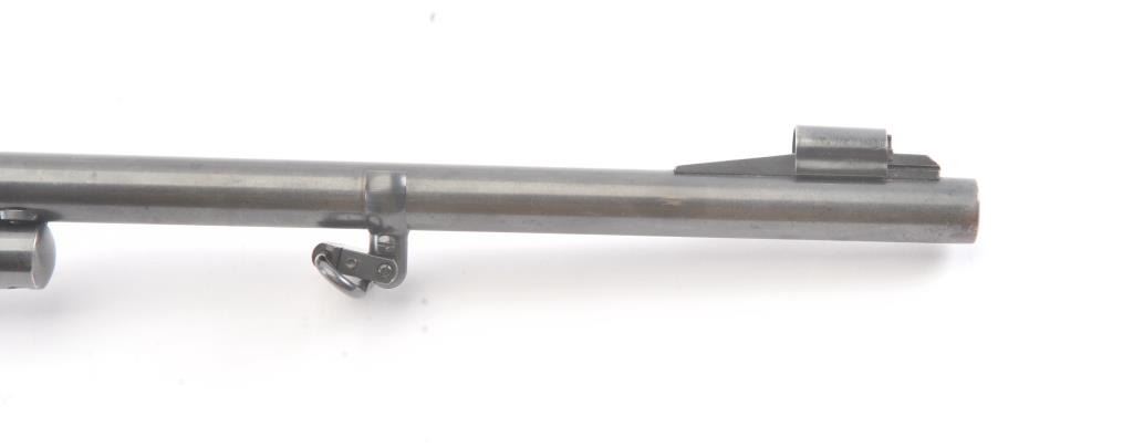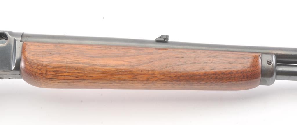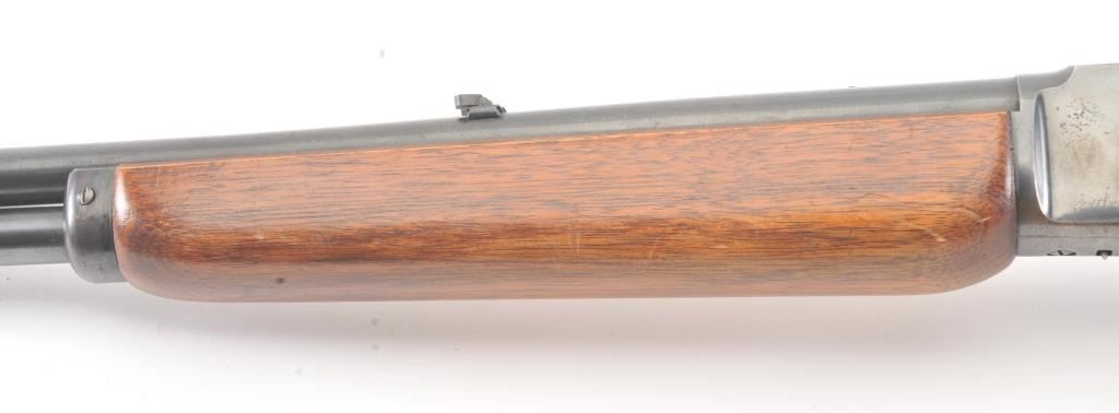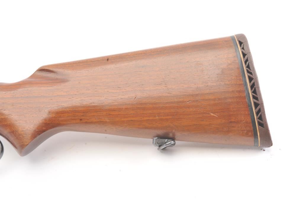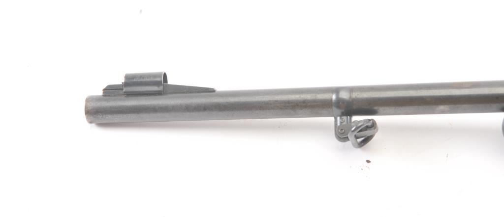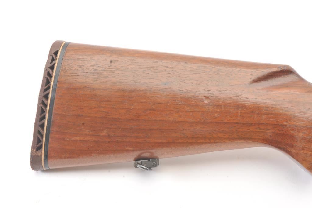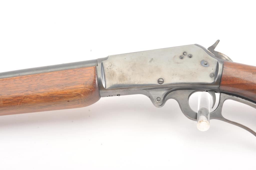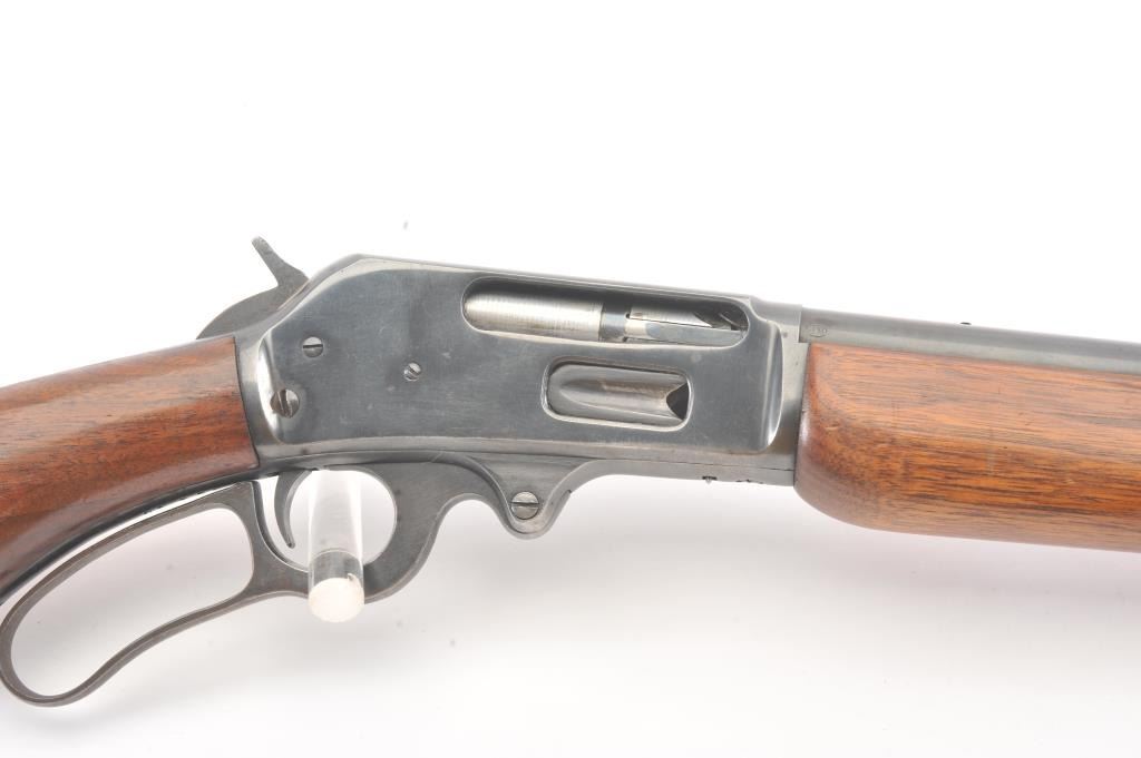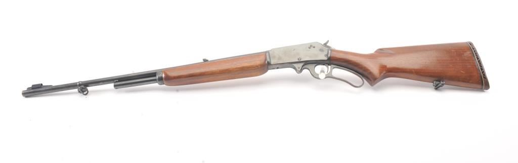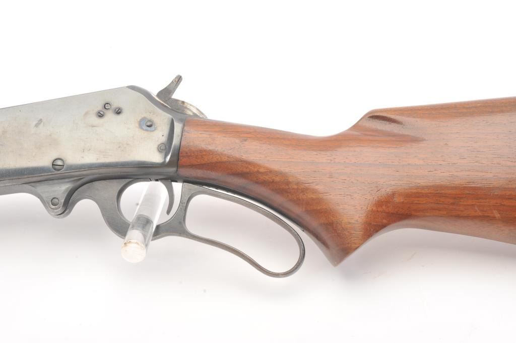 Marlin Model 336A lever action rifle, .30-30 caliber, Serial #F39430. The rifle is in very good overall condition with a 24” barrel and half magazine. The metal surfaces retain the majority of the blue finish withlight erosion on the barrel and on the receiver. The receiver has been drilled and tapped for a scope mount with an extra set of holes on the barrel. The smooth wood stock is in very good condition with a ventilatedrubber pad and sling swivels added. The bore is good, the action is crisp and the markings are sharp on this scarce variation. Est.: $300-$600. (Modern).