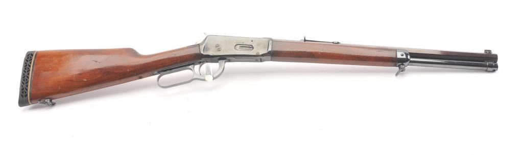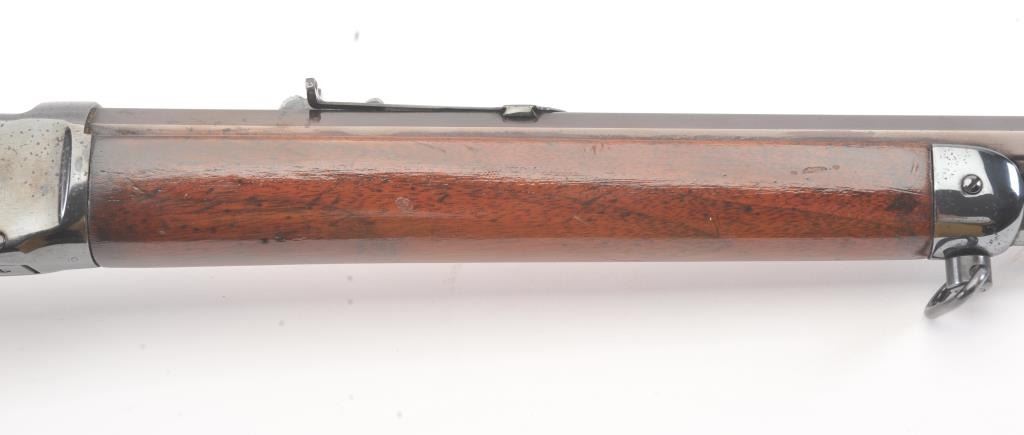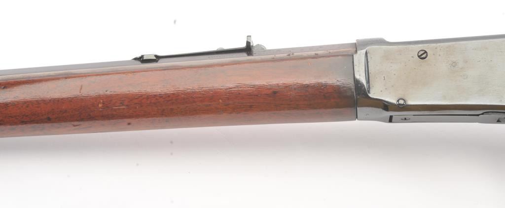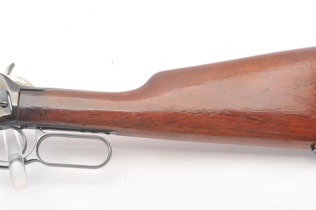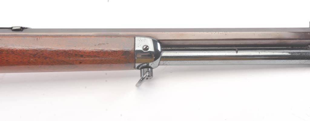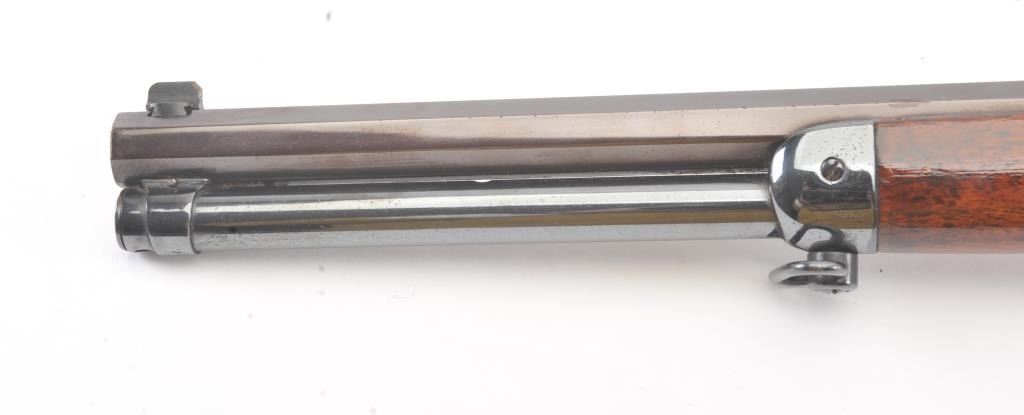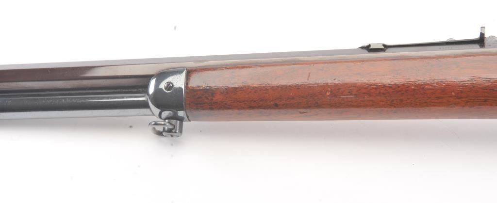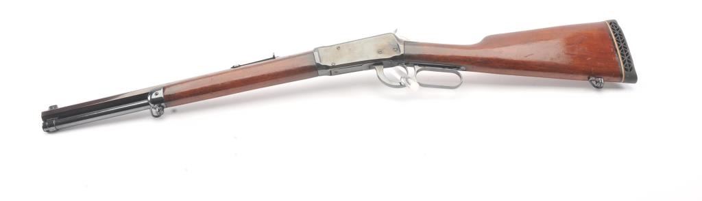 Custom Winchester Model 1894 lever action rifle, .30 WCF caliber, Serial #98164. The rifle is in very good condition as re-finished. The octagon barrel has been shortened to 18” with a full-length magazine. The metal has been redone and the smooth wood stocks re-finished. The hammer has been jeweled, sling swivels added and a ventilated rubber recoil pad added. The bore is fair, the action is crisp and themarkings are faint, but legible. Est.: $350-$700. (Antique).