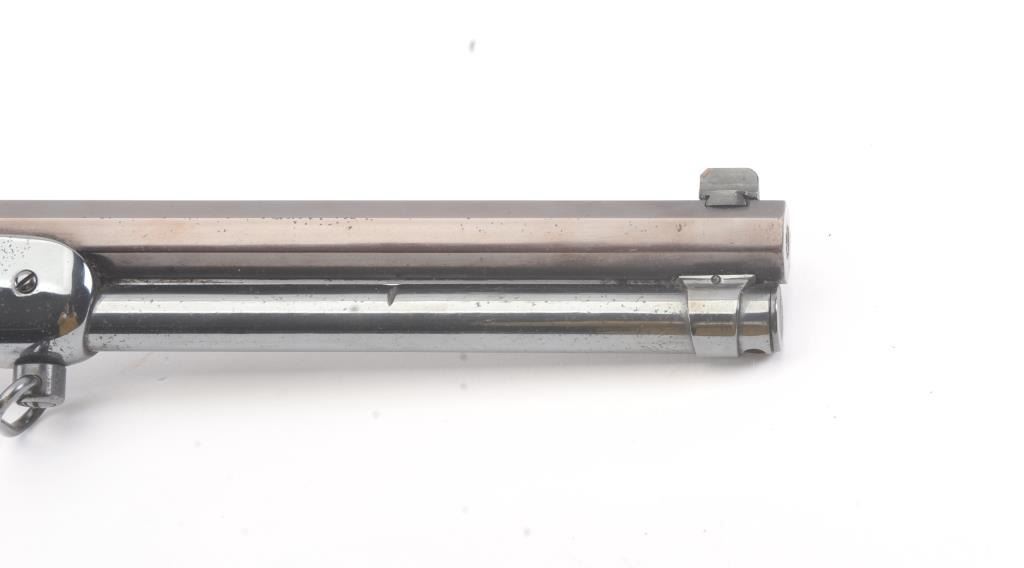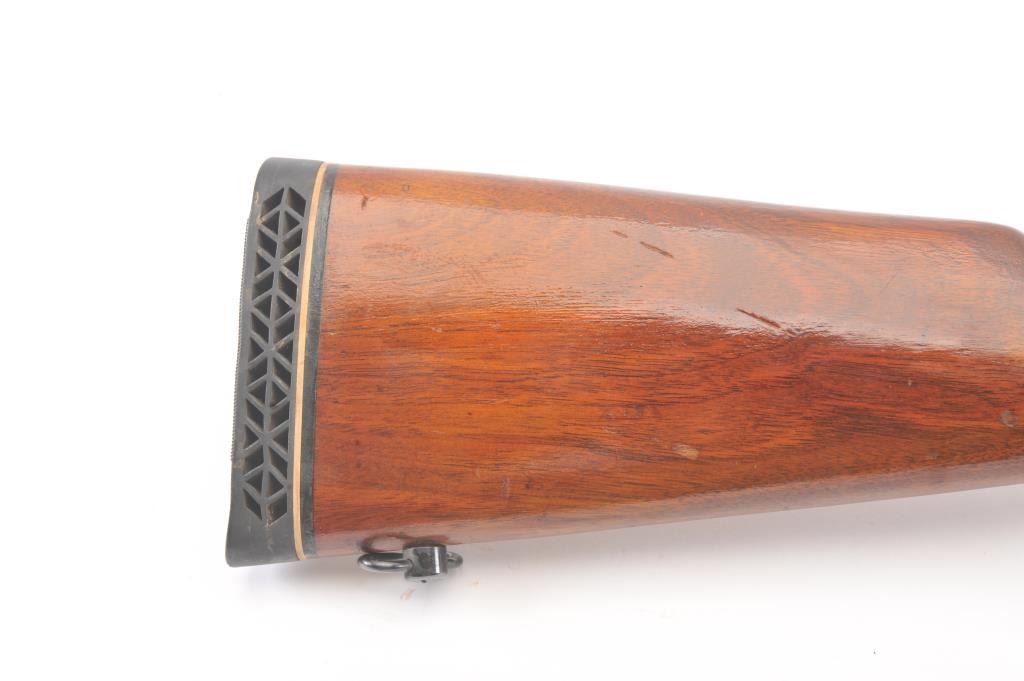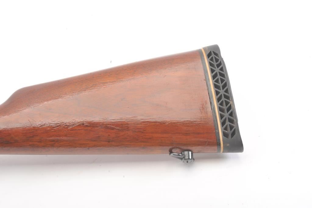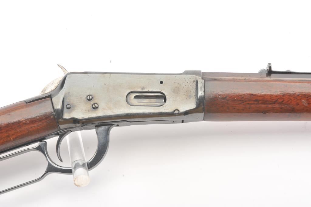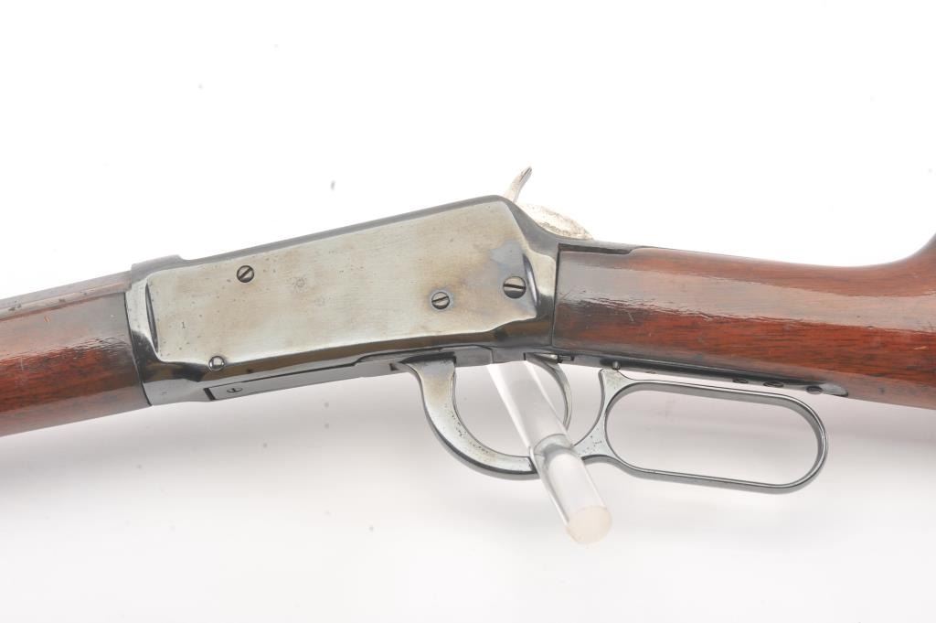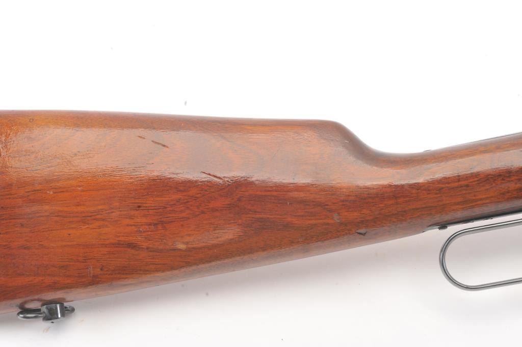 Custom Winchester Model 1894 lever action rifle, .30 WCF caliber, Serial #98164. The rifle is in very good condition as re-finished. The octagon barrel has been shortened to 18” with a full-length magazine. The metal has been redone and the smooth wood stocks re-finished. The hammer has been jeweled, sling swivels added and a ventilated rubber recoil pad added. The bore is fair, the action is crisp and themarkings are faint, but legible. Est.: $350-$700. (Antique).