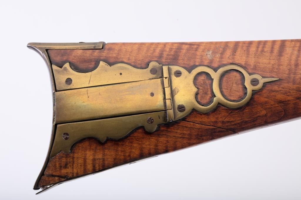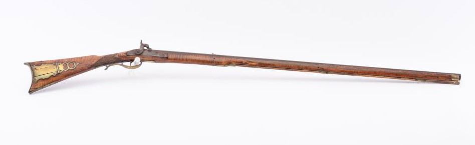 Full stock Percussion Kentucky rifled with pierced patch box marked “R. Sterling, Newburg” in Cumberland County (About 50 miles from Philadelphia). Measures 59” overall with a 42” barrel of medium weight inapproximately .46 caliber smoothbore (Bored Out). The barrel is full octagon with V notch and blade front sight. The wood has been lightly sanded ad refreshed with small repair to toe of the butt. The action is workingand a single trigger. Also old repair to area behind hammer regluing original piece and losses of wood behind hammer from firing. From an old Northern California collection. Est.: $800-1600