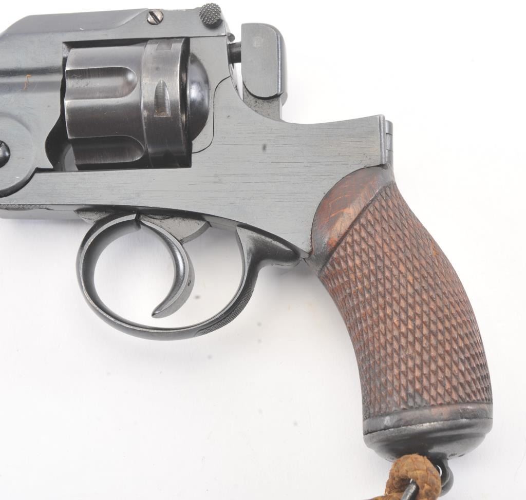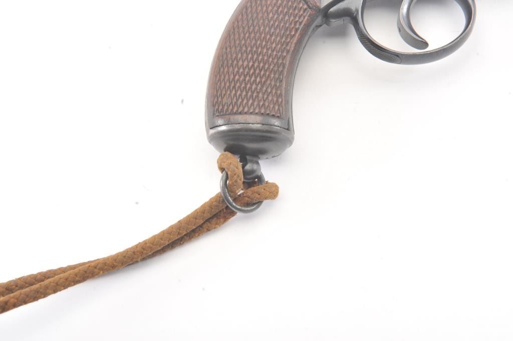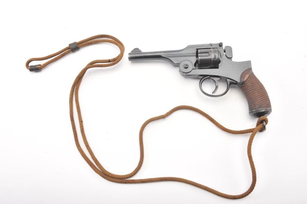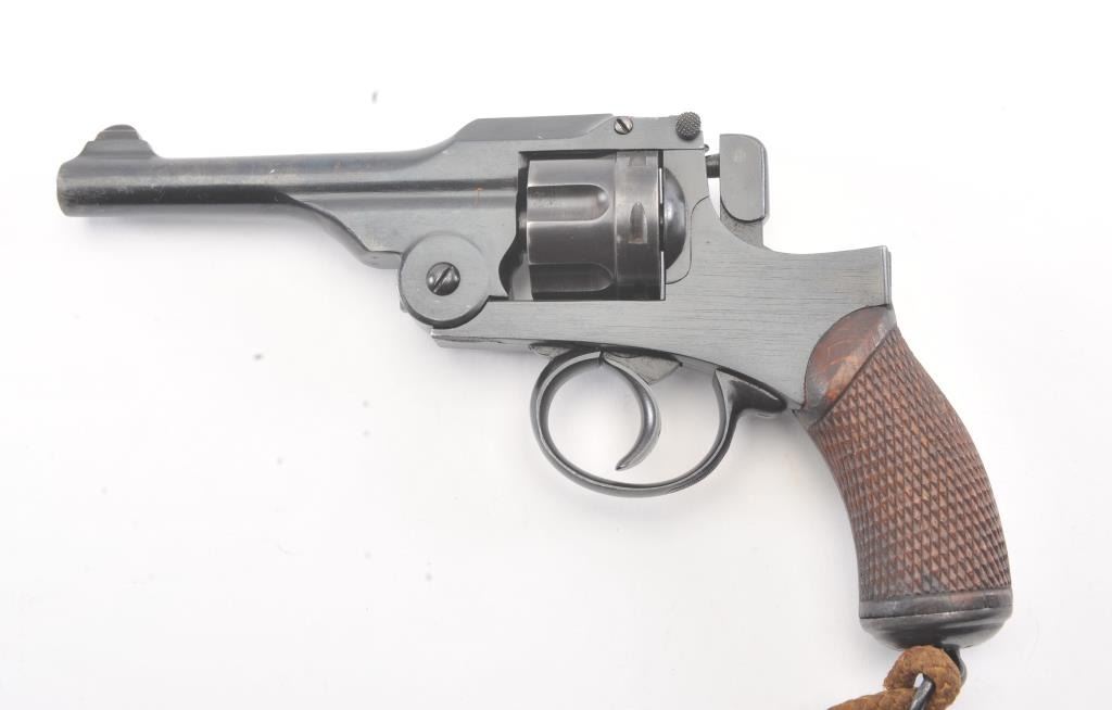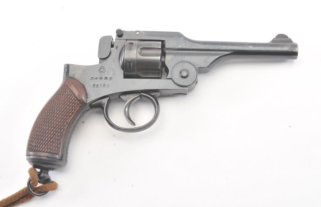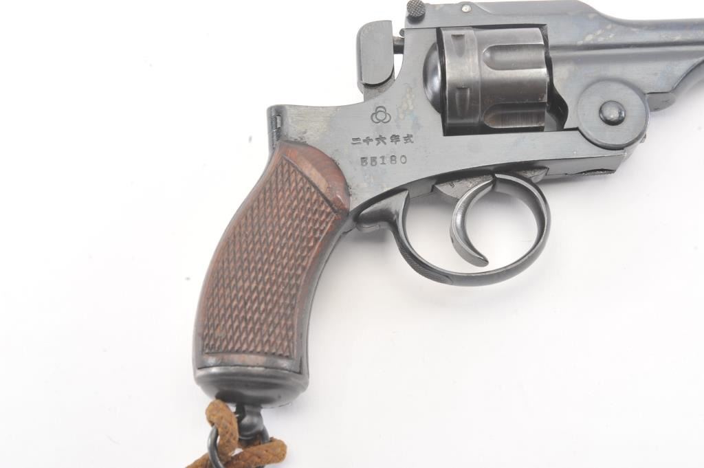 Type 26 Japanese revolver in 9mm, Serial #55180. The pistol is fully arsenal marked in fine overall condition retaining 90% plus original blue with minor spotting and small areas of erosion. The grips are excellentwith the lanyard cord attached. The interior is fine with a bright bore. Est.: $350-700 (C+R/PPT).