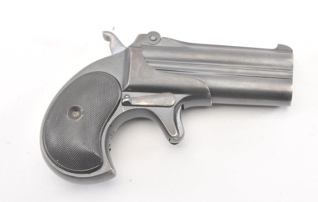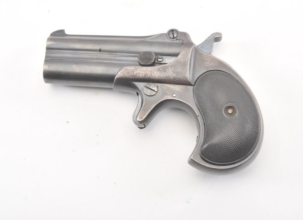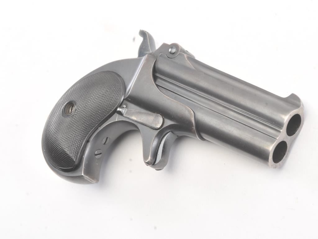 Remington Elliot’s Patent Over/Under derringer with a one-line address, “Remington Arm Co. Ilion, N.Y.” (Pre 98). The pistol shows 60%-80% toned original blue with some bare metal where the finish has lifted. Thegrips are slightly worn at the tops of the checkering. There is a small crack to the left hinge which is nearly imperceptible. The action is good with bright bores. Est.: $300-$600. (Antique).