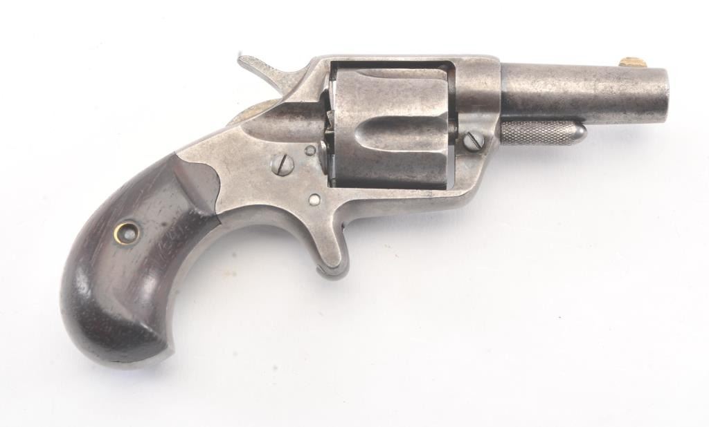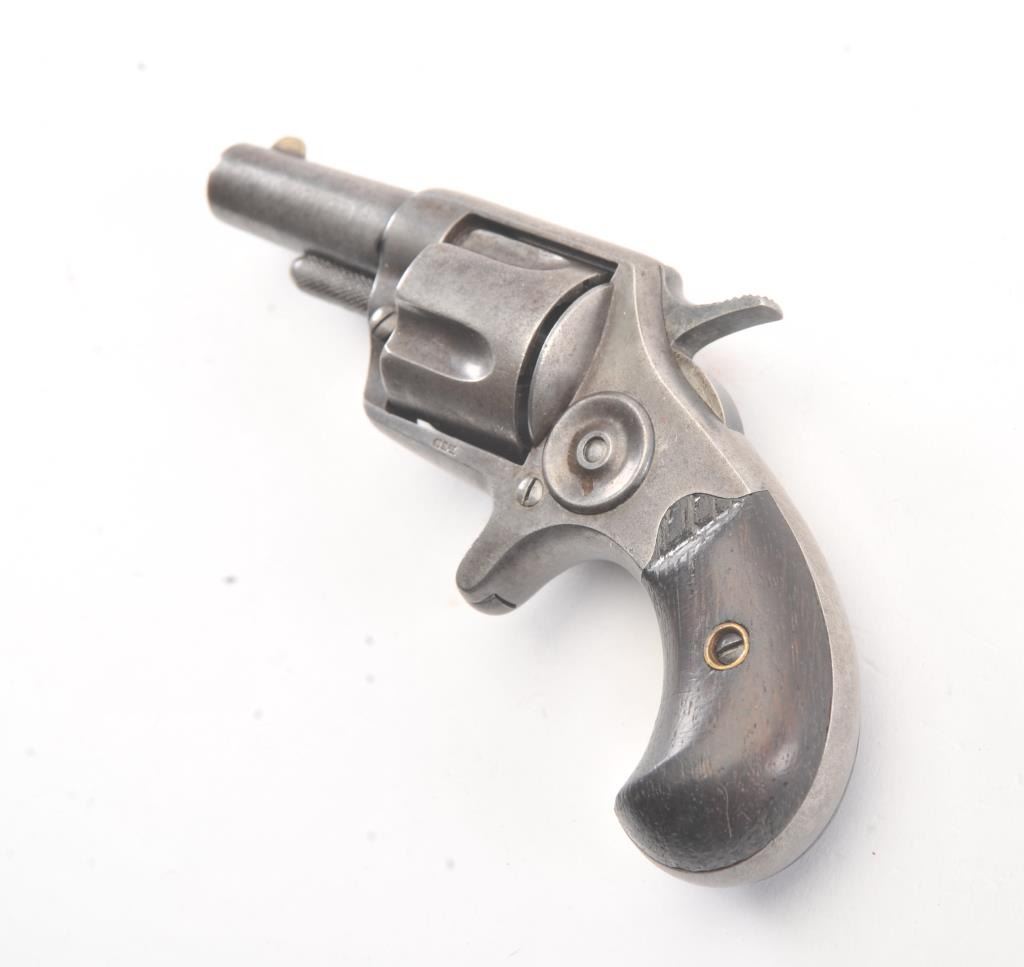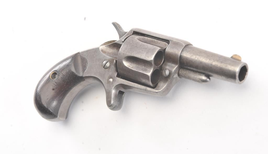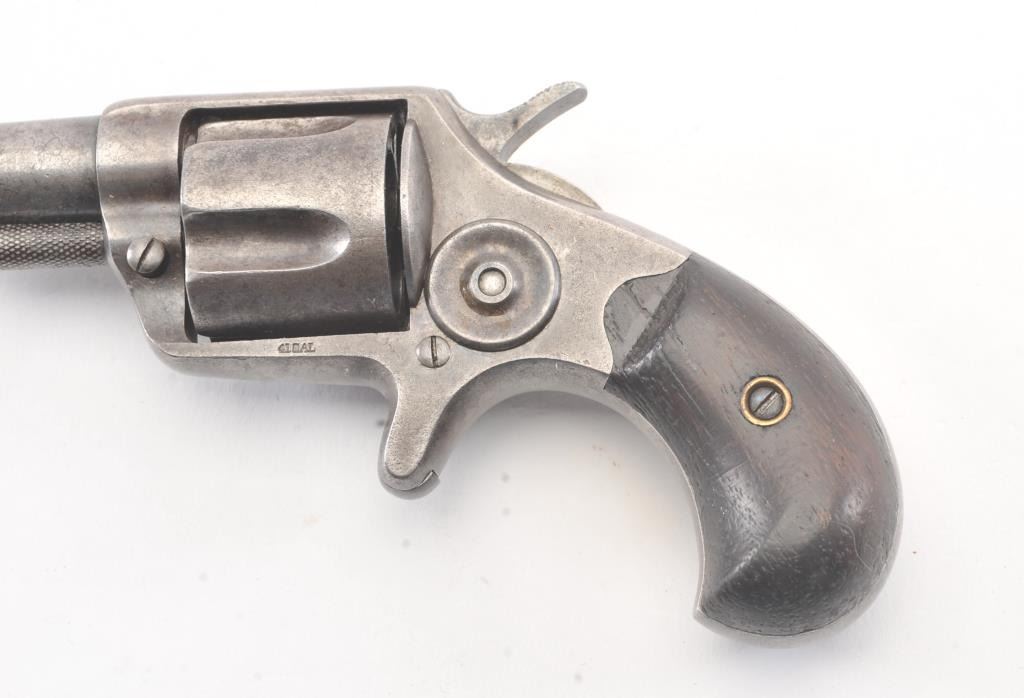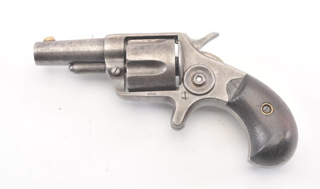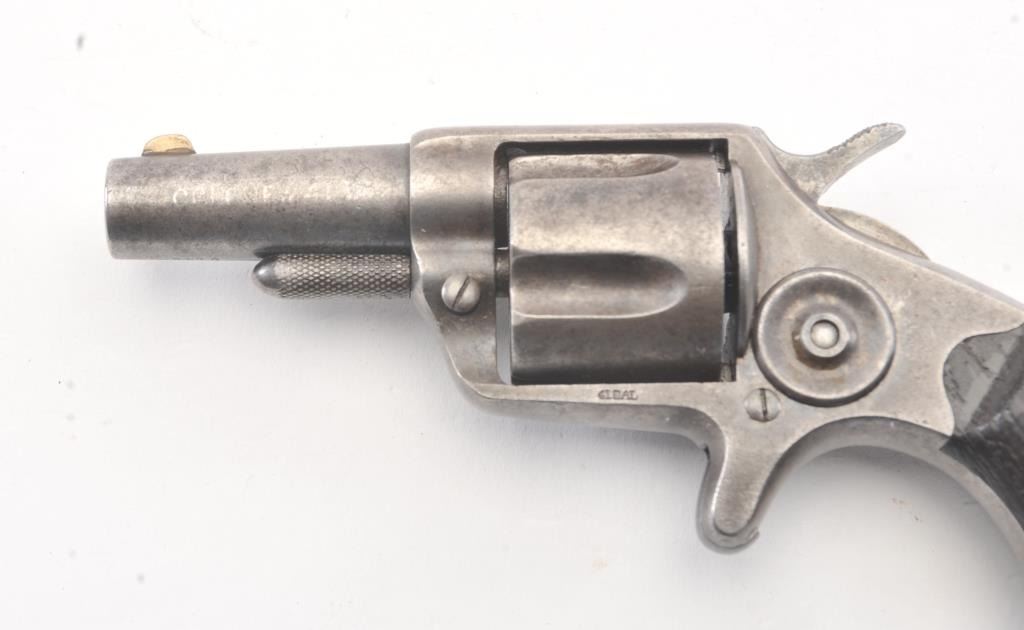 Colt New Line revolver, .41 caliber, Serial #5176. The pistol shows grey patina with blue and case colors mixed in with traces of the etched panel mostly visible. The pistol is well marked with the original pin andsmall parts and works well. Est.: $300-$600. (Antique).