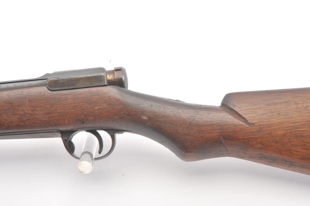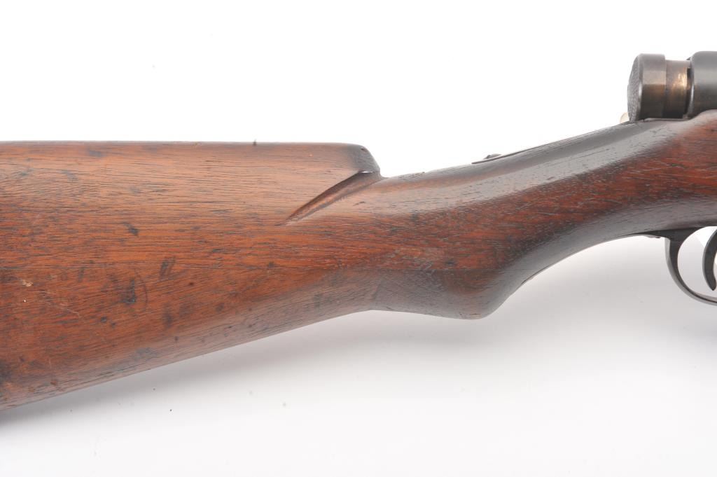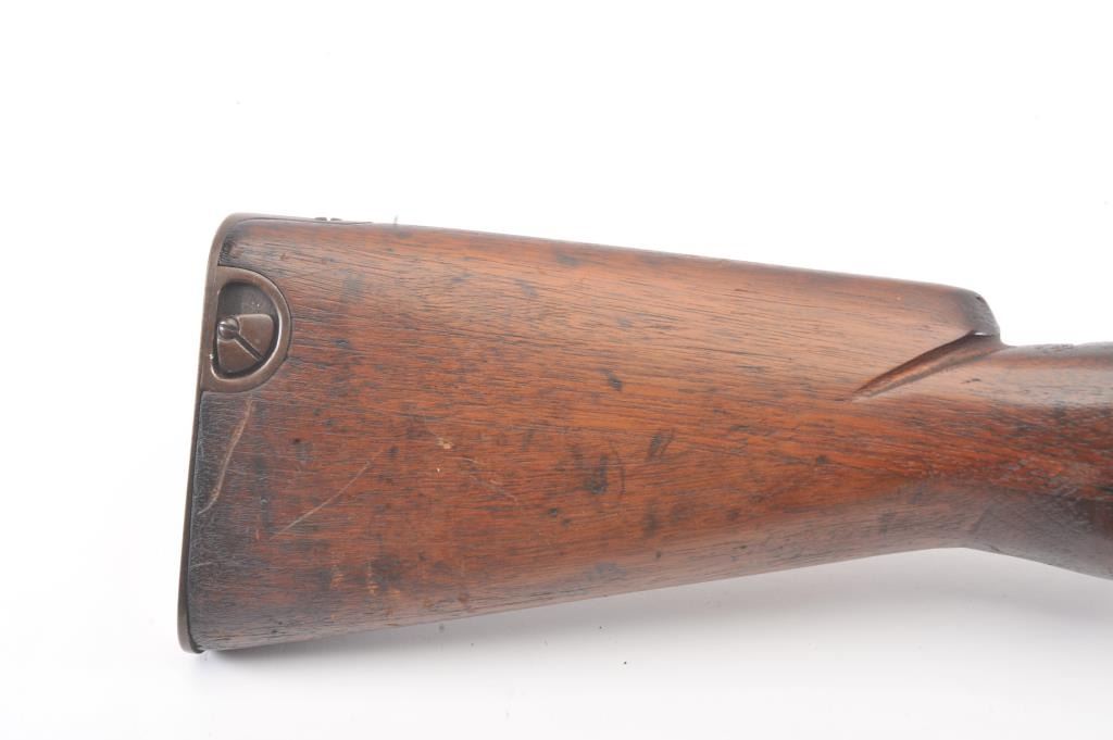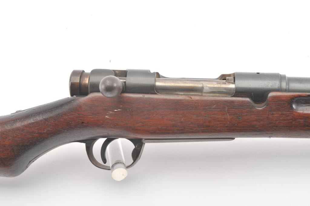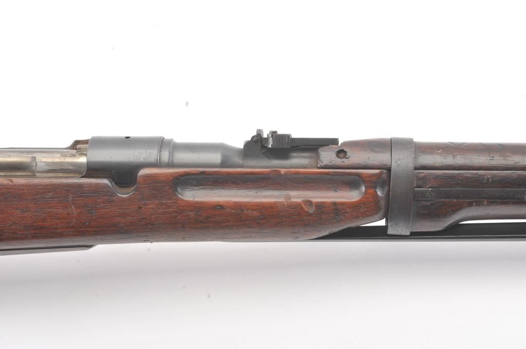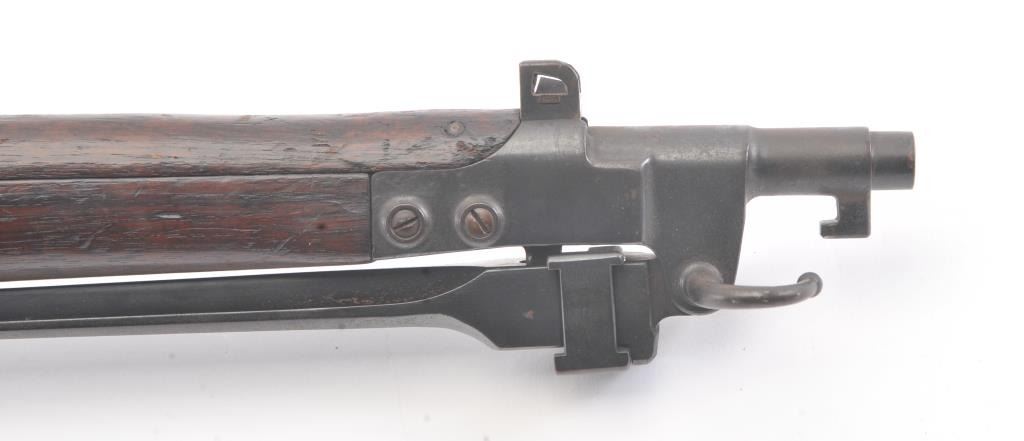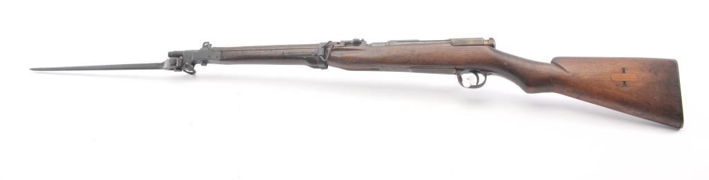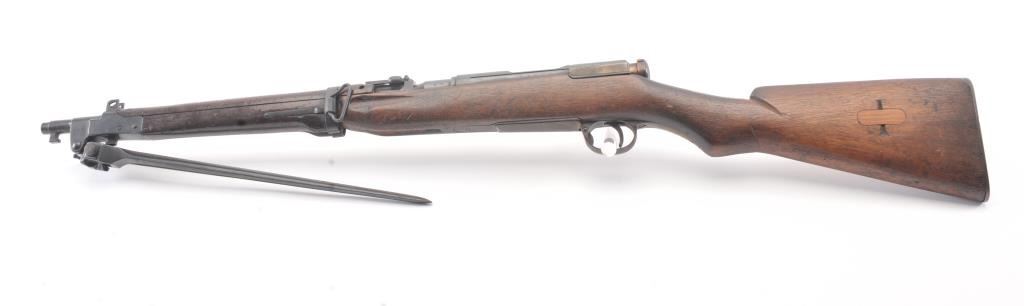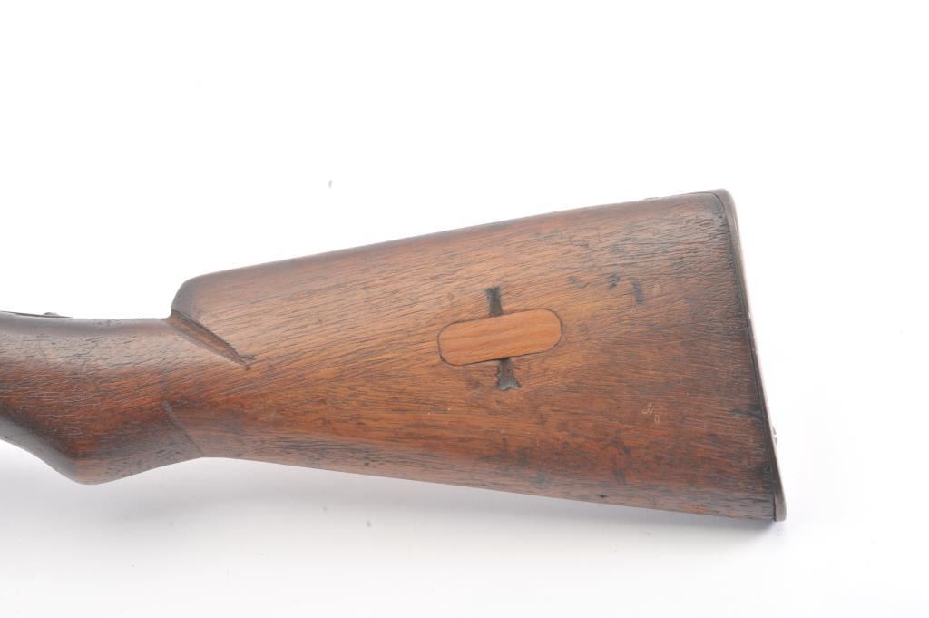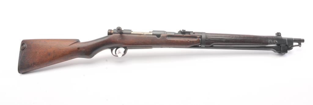 Japanese Type 44 Carbine in 6.5 caliber with folding bayonet, S/N 6154. The bolt is mismatched and the mum is ground. Good to very good condition with 70%-80% toned blue with some light rust and erosion withscattered light pitting. Soldier altered comb and sling port filled with wood block. The bore is dirty and a bit rough but may (At least to “Leonard clean”). (C&R) Est.: $300-600
