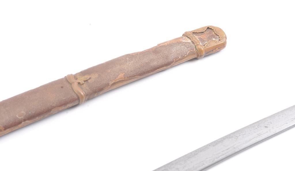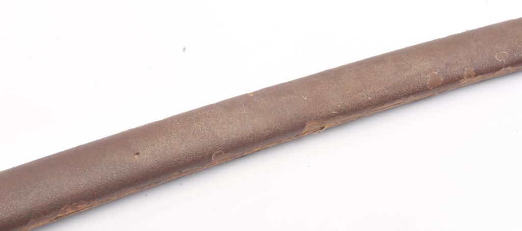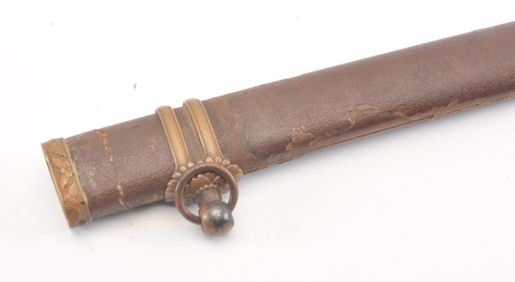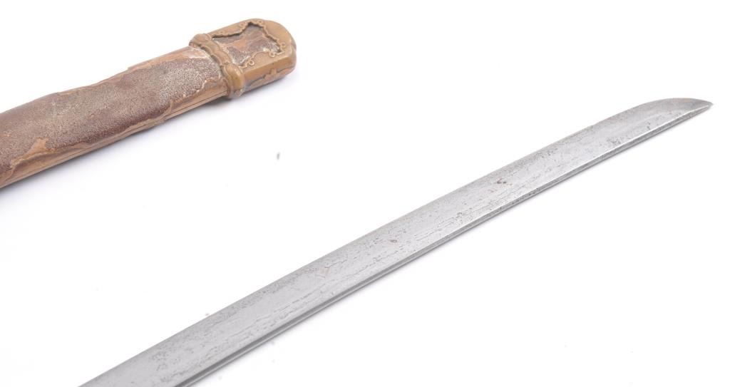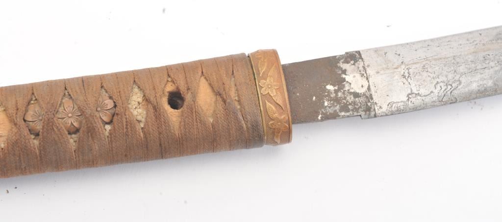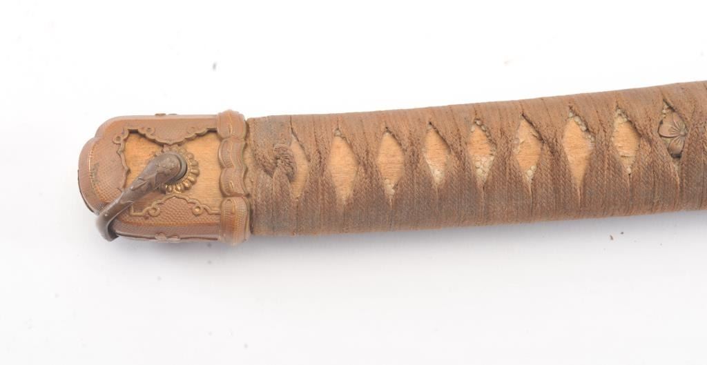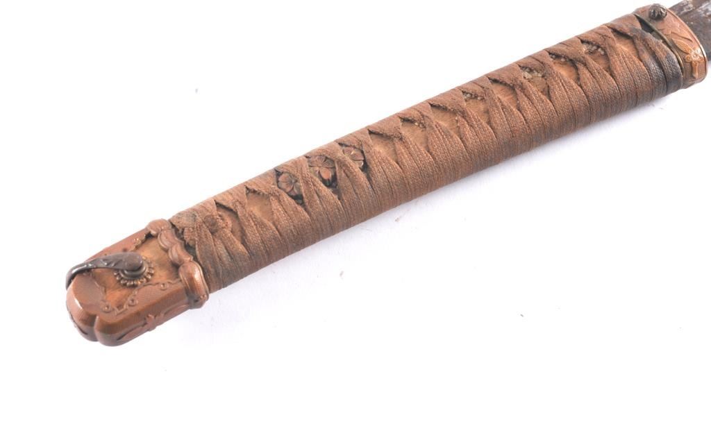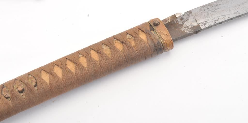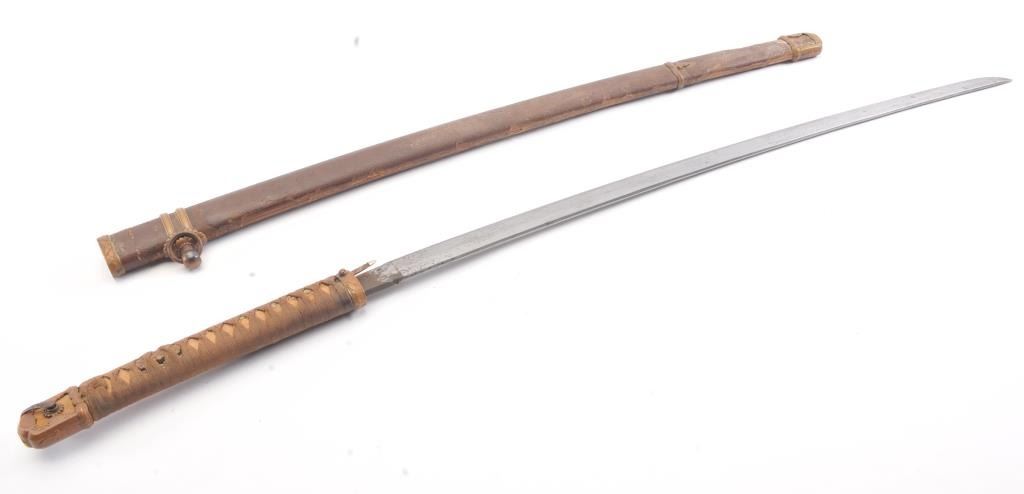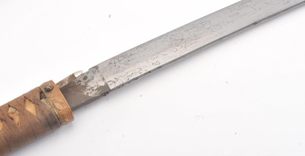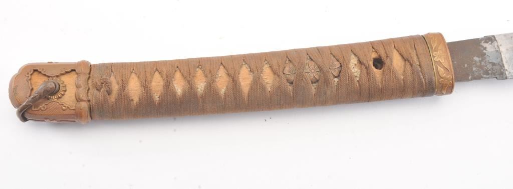 Japanese handmade old family sword in WWII mounts less the tsuba and small fittings. The sword has a 27 ½” blade with a one-hole tang, 8 ¾” in length from the Shinto to Koto era with no signature. The sword is in poorcondition and has been improperly cleaned with some openings in the lamination and the mounts are just fair. Est.: $200-400