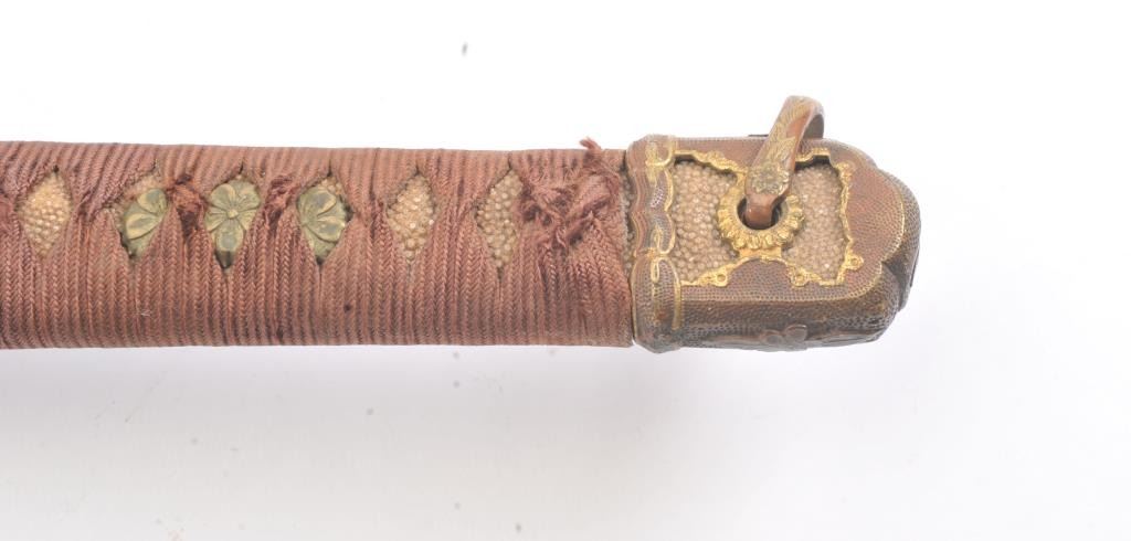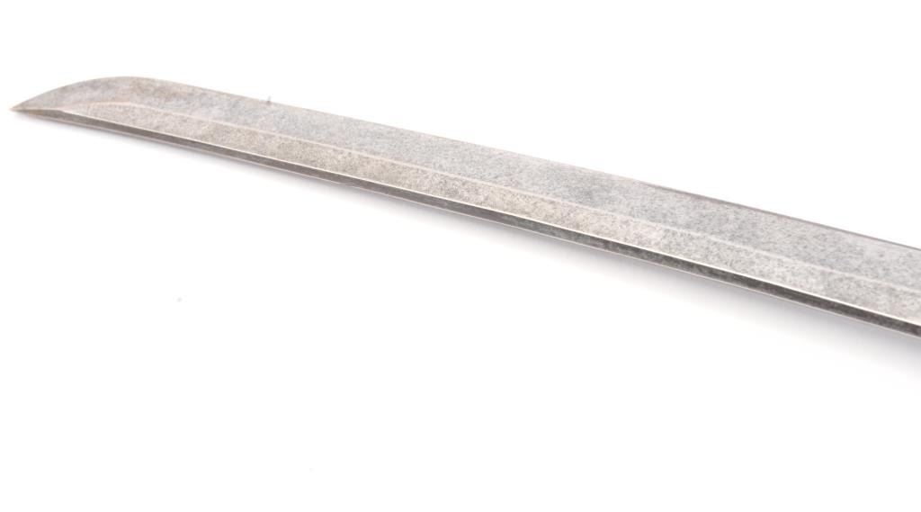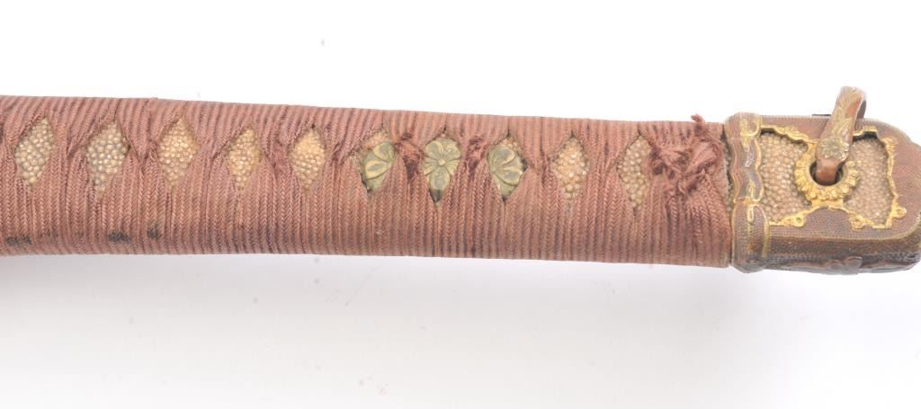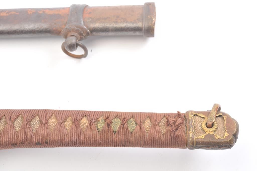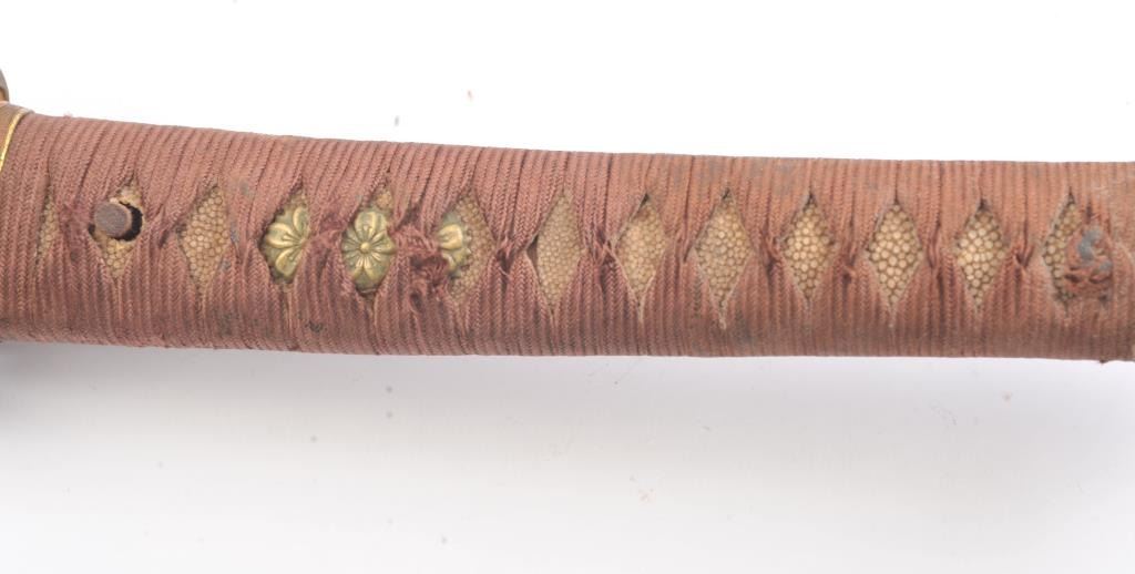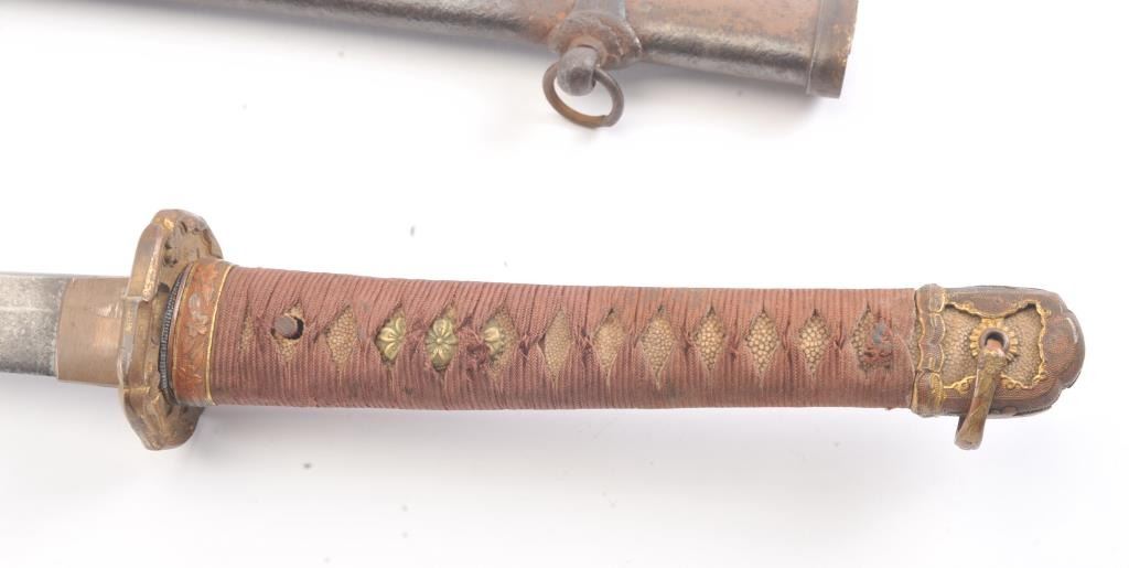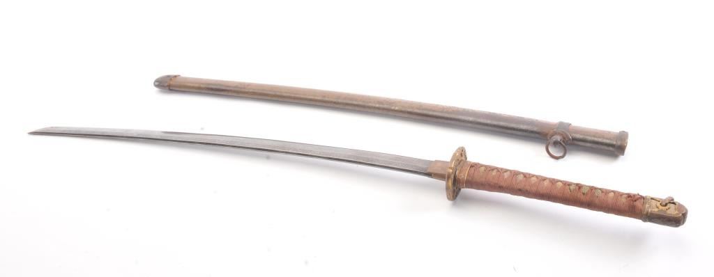 Japanese WW II era Officer’s sword in Samurai style with a signed machine made WW II era blade measuring 25 1/8” cutting edge. The sword is in fair condition with light erosion and pitting on the blade. The scabbardshows moderate to heavy pitting with good mounts and a re-tied grip which is good. Est.: $250-500