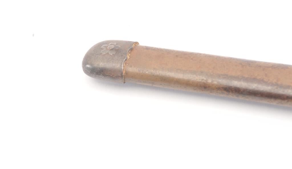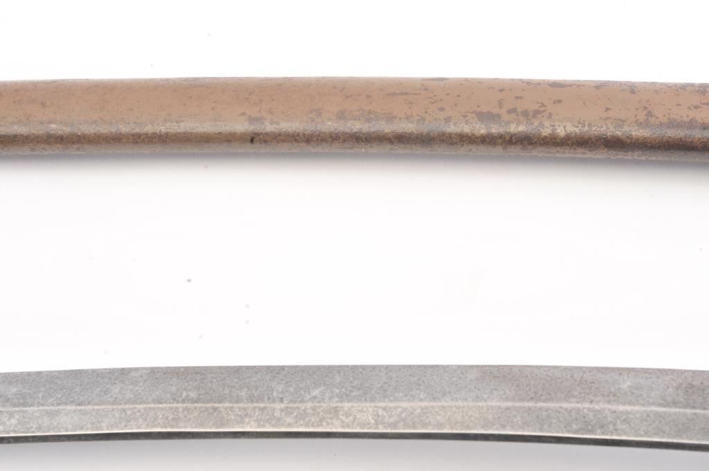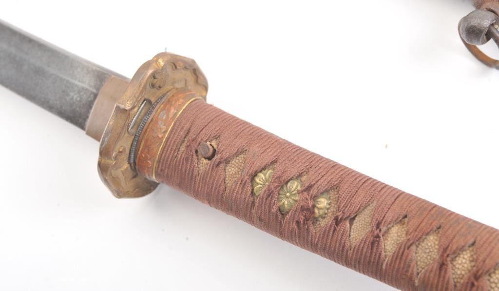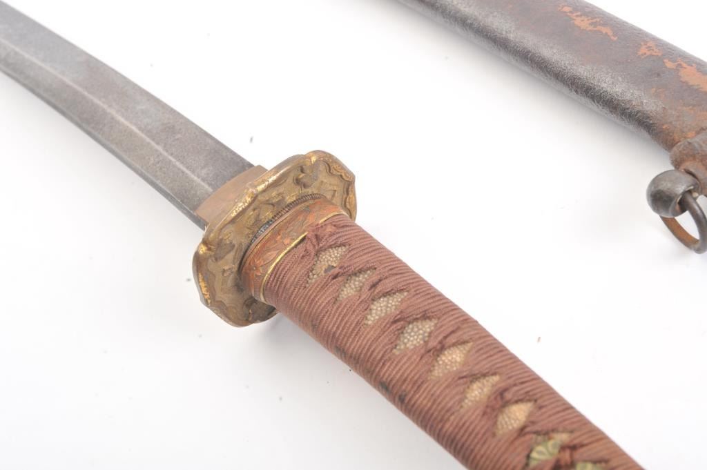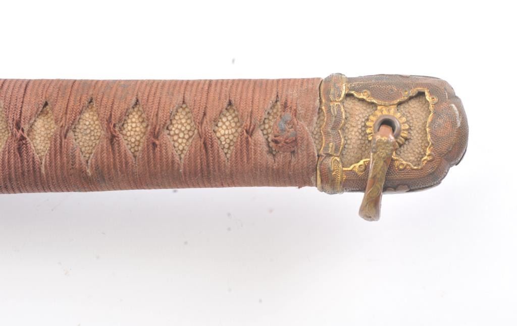 Japanese WW II era Officer’s sword in Samurai style with a signed machine made WW II era blade measuring 25 1/8” cutting edge. The sword is in fair condition with light erosion and pitting on the blade. The scabbardshows moderate to heavy pitting with good mounts and a re-tied grip which is good. Est.: $250-500