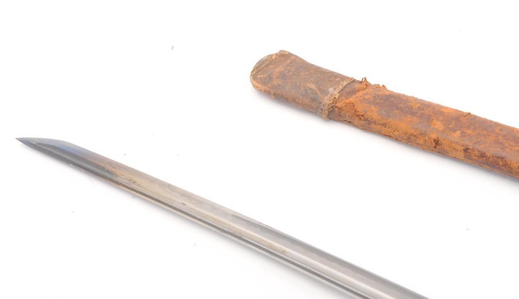 Sino-Soviet war era D Guard Officer’s sword with an arsenal made blade of 25” showing a “bumpy” oil temper line. The sword is in good condition with minor rust and erosion that would clean. There is damage to theleather on the scabbard. The sword is in good to very good overall condition with a nice grip wrap. These are becoming scarce. Est.: $350-700