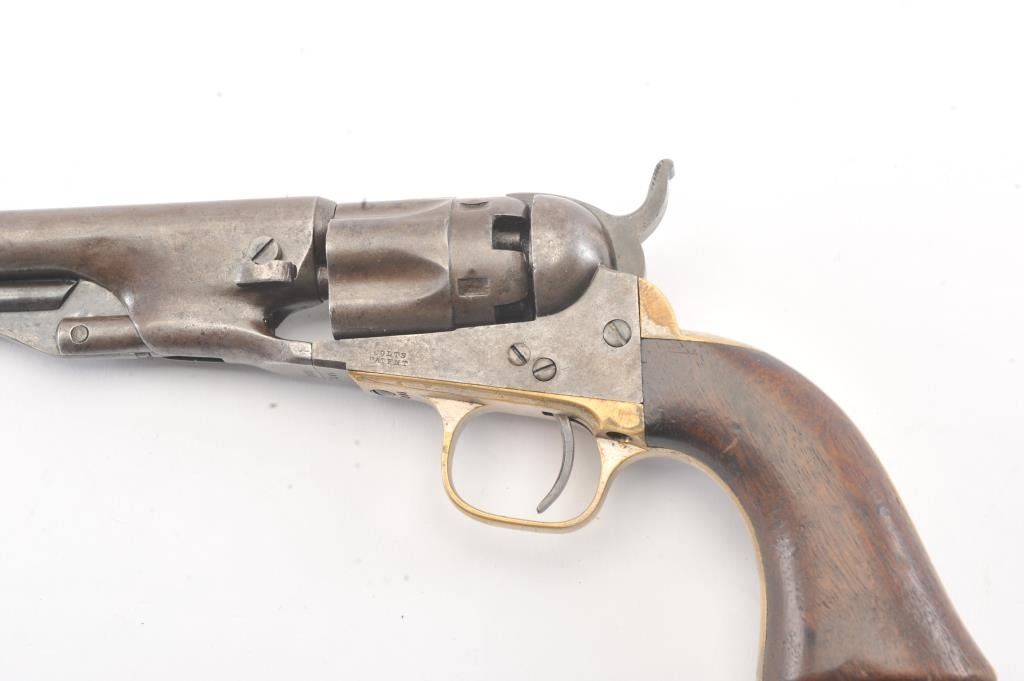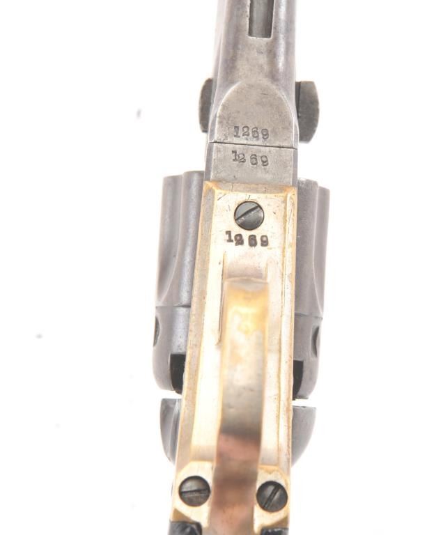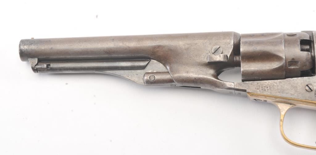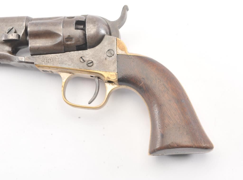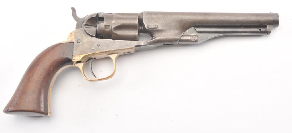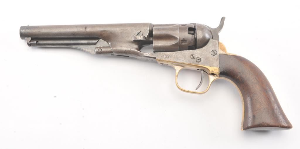 Colt 1862 Police percussion revolver, .36 caliber, Serial #1269. The pistol has the early Hartford barrel address with a 5 ½” barrel in good plus overall condition showing patina with traces of finish. The strapshave traces of silver, the grips are good with small losses at the toe. The pistol has good markings, all matching visible serial numbers and a tight action. Est.: $600-$1,200. (Antique).