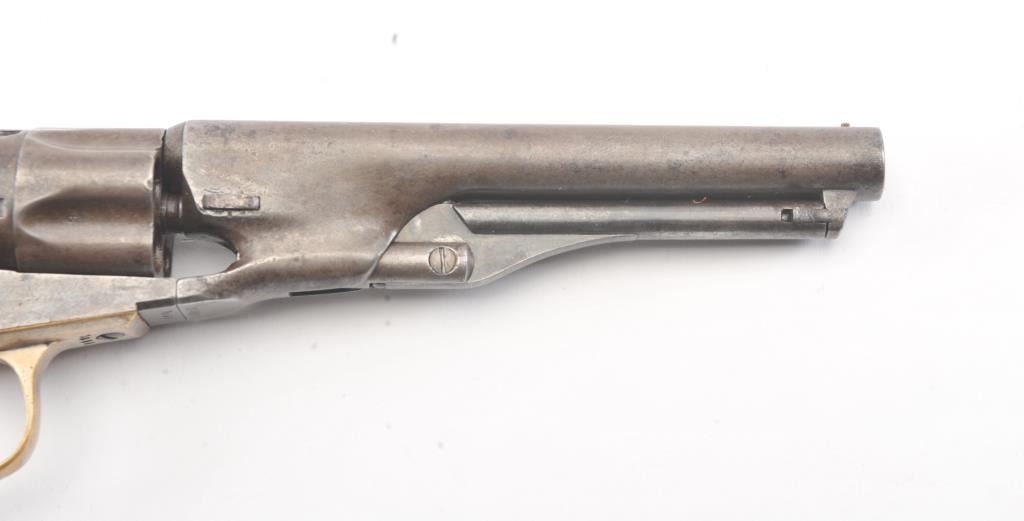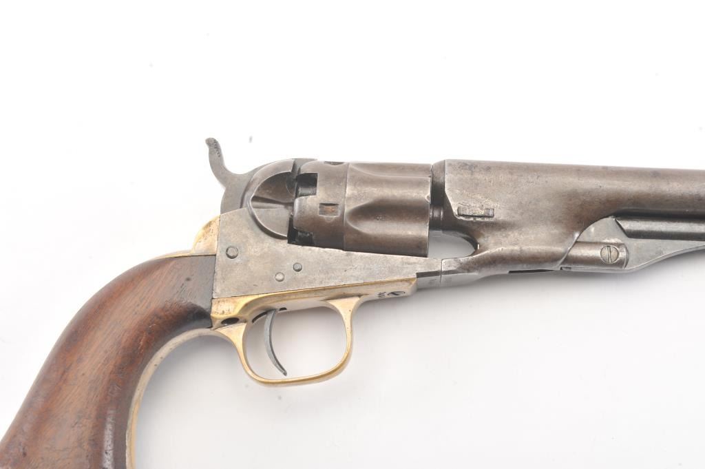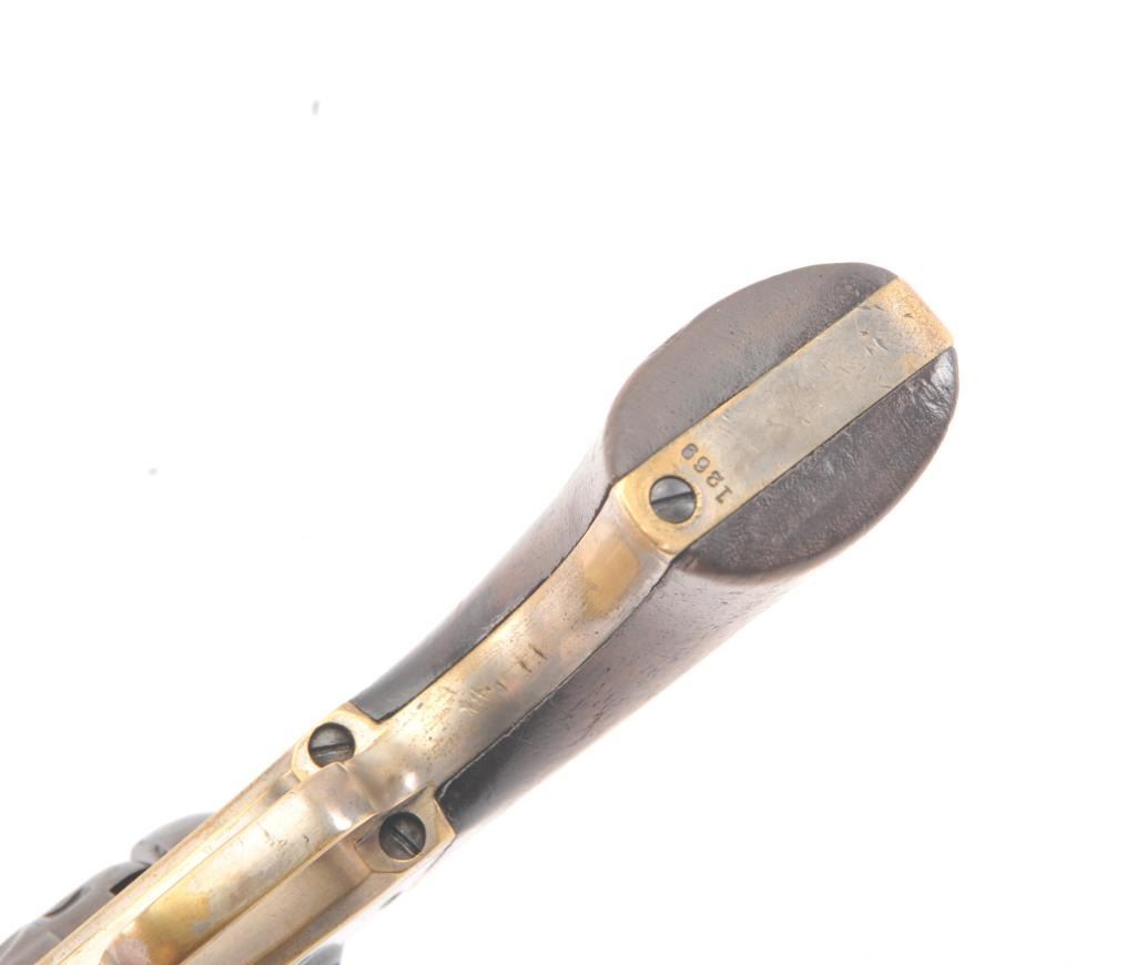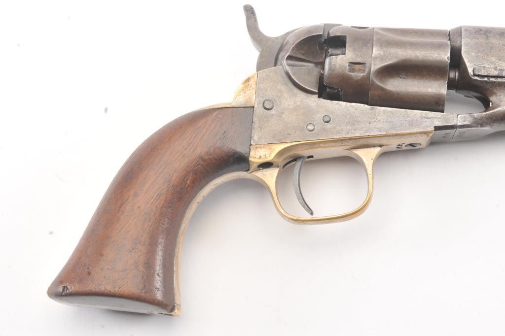 Colt 1862 Police percussion revolver, .36 caliber, Serial #1269. The pistol has the early Hartford barrel address with a 5 ½” barrel in good plus overall condition showing patina with traces of finish. The strapshave traces of silver, the grips are good with small losses at the toe. The pistol has good markings, all matching visible serial numbers and a tight action. Est.: $600-$1,200. (Antique).