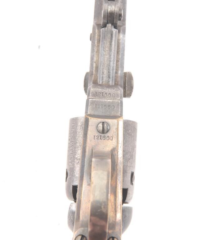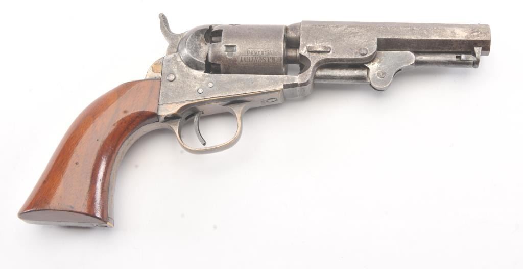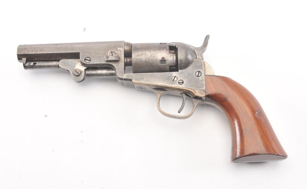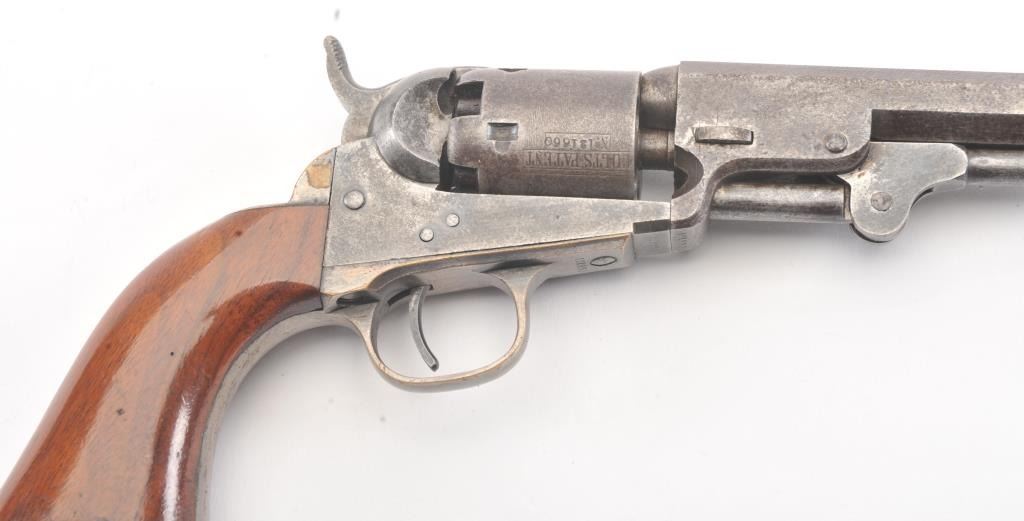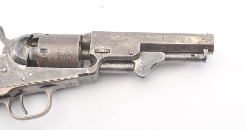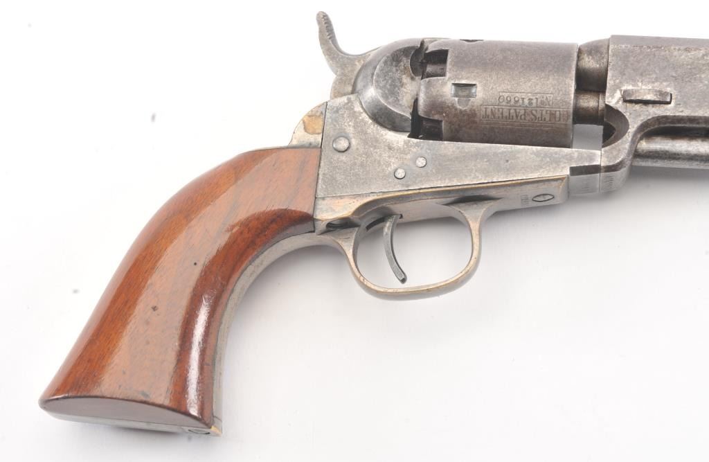 Colt 1849 Pocket Model percussion revolver, .31 caliber, Serial #121660. The pistol has the two line New York address and five shot cylinder with strong traces of finish remaining in patina. The pistol shows goodmarkings, 30%-60% of the cylinder scene, and 30%-60% darkening silver on the straps. The grips a have 90% of the original varnish with large dents or would be fine. The action is tight and crisp with good color on thetrigger. Est.: $600-1200 (Antique).