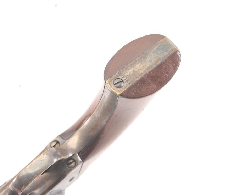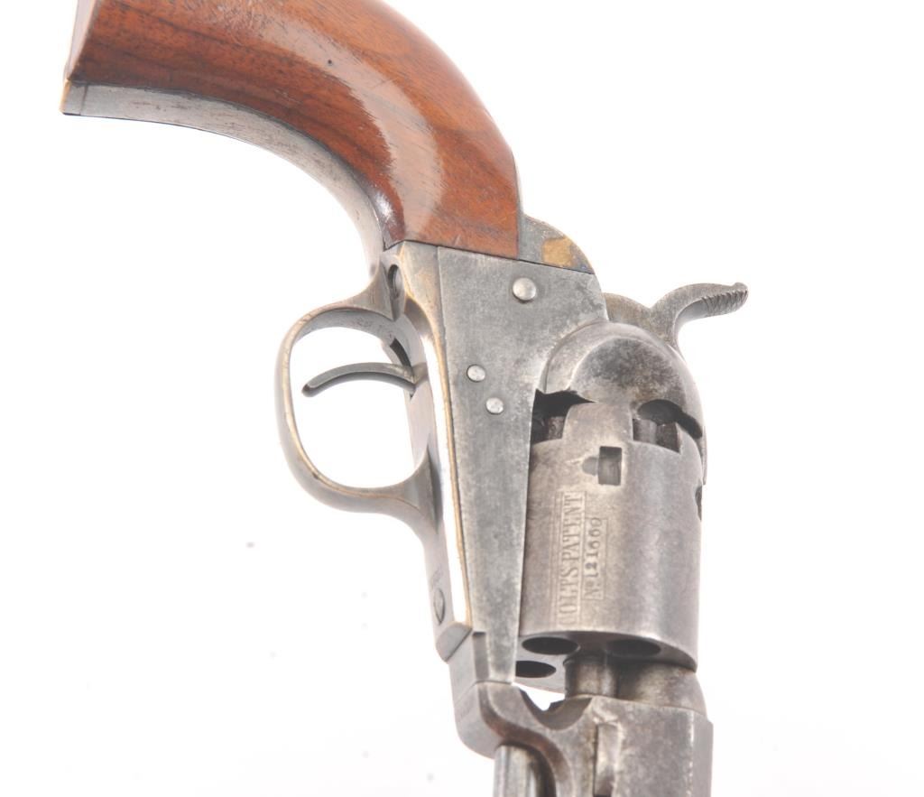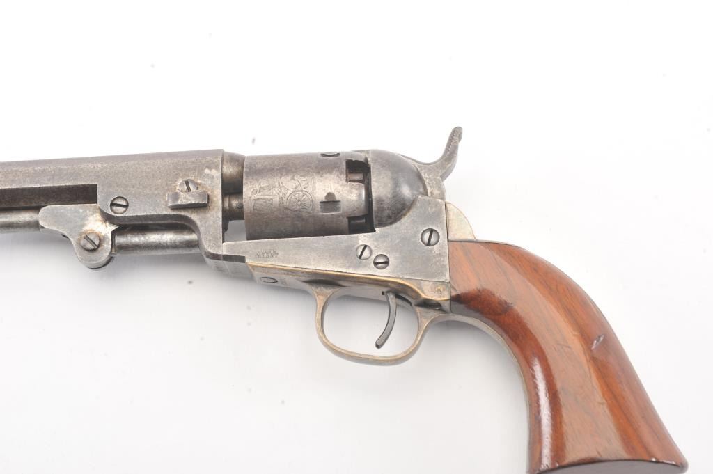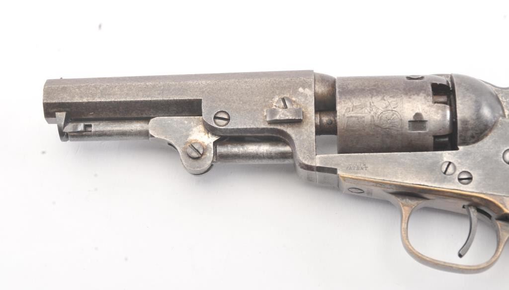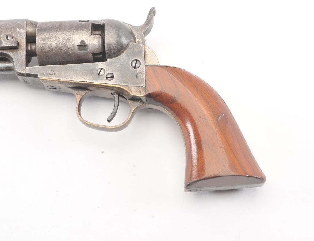 Colt 1849 Pocket Model percussion revolver, .31 caliber, Serial #121660. The pistol has the two line New York address and five shot cylinder with strong traces of finish remaining in patina. The pistol shows goodmarkings, 30%-60% of the cylinder scene, and 30%-60% darkening silver on the straps. The grips a have 90% of the original varnish with large dents or would be fine. The action is tight and crisp with good color on thetrigger. Est.: $600-1200 (Antique).