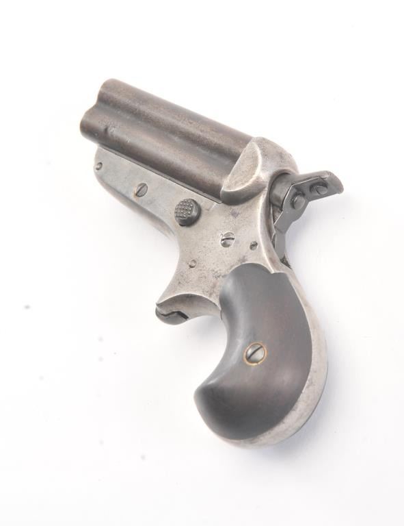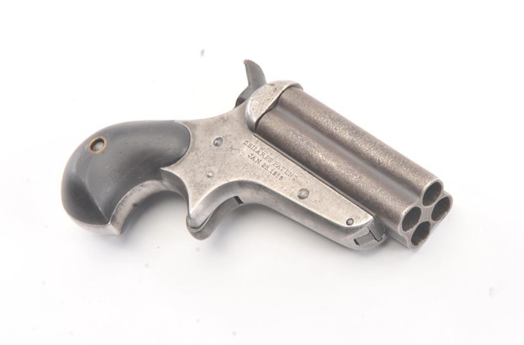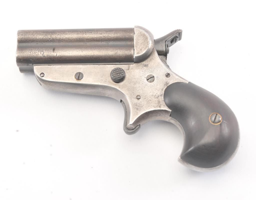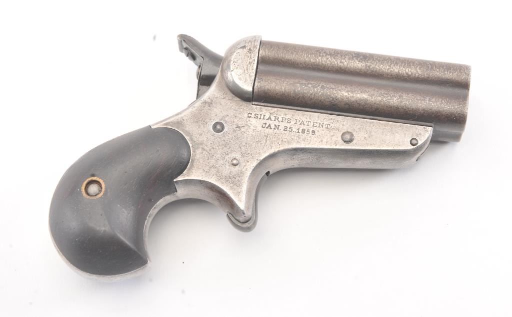 Sharps & Hankins “Bulldog” four barrel derringer, .32 Rimfire caliber, Serial #1969. The pistol shows 20-40% original blue on the barrels. The frame is well marked but drifted to grey metal with slight surfacepitting. The pistol is good and tight with a working action and good grips. Est.: $600-1200. (Antique).