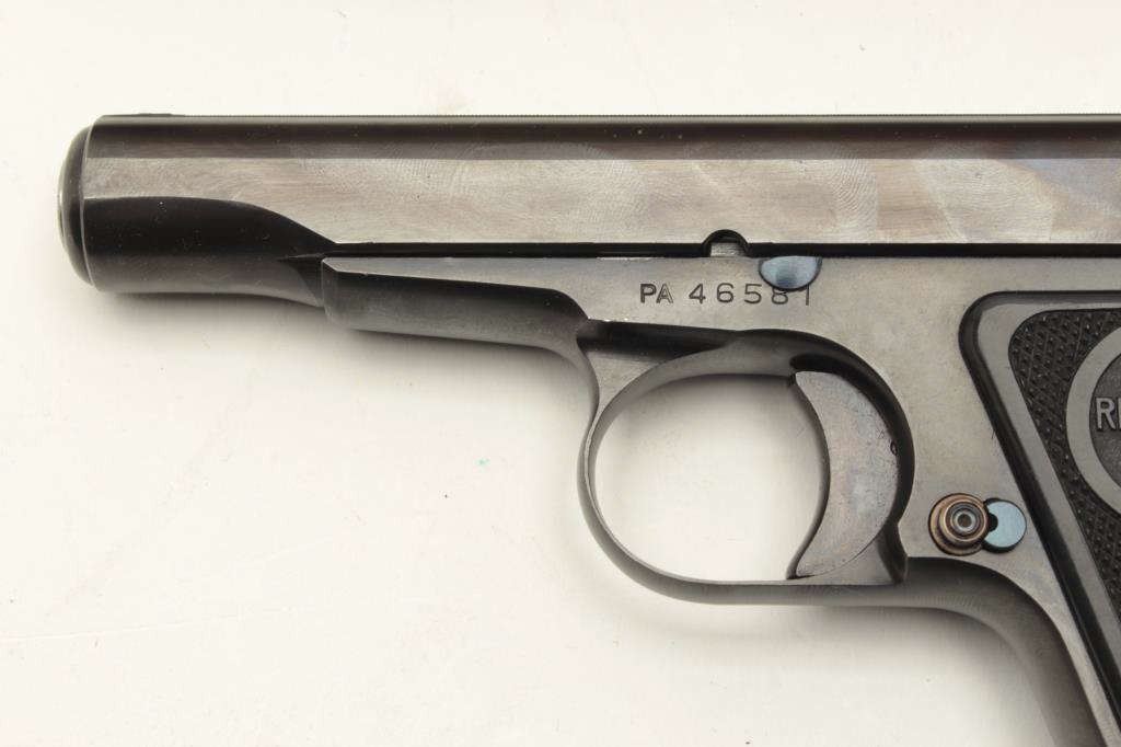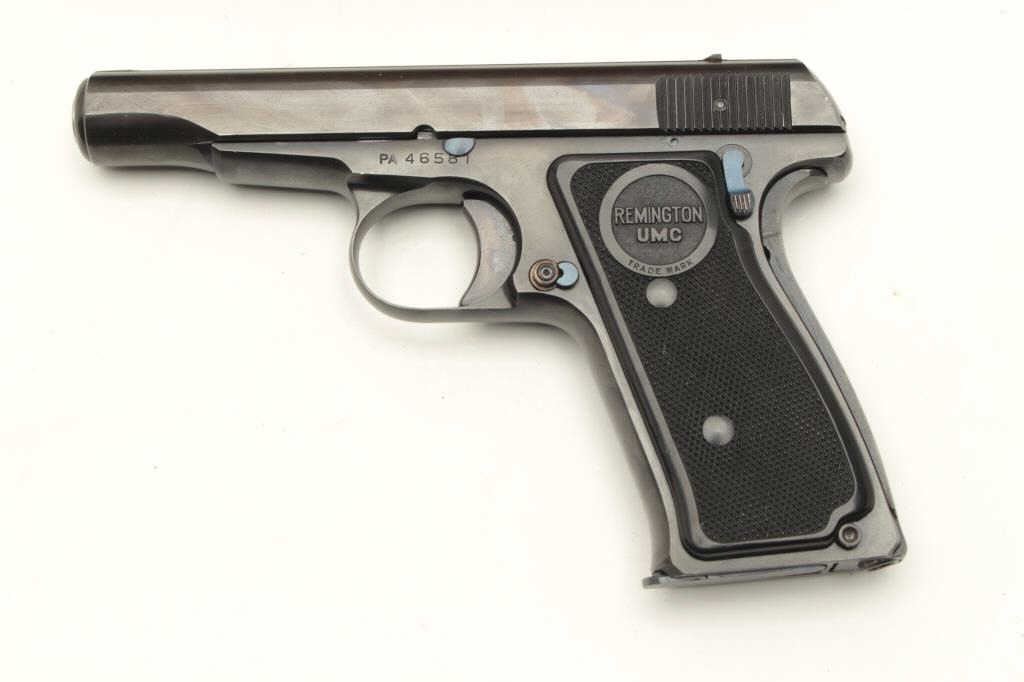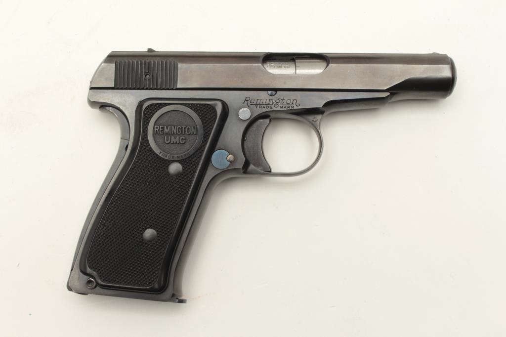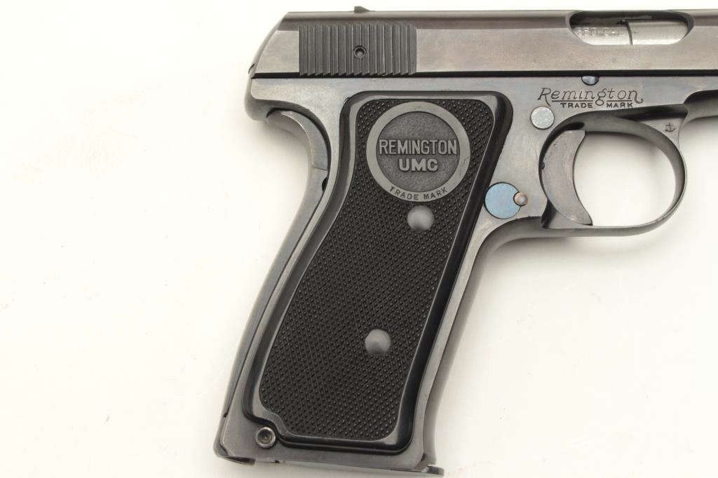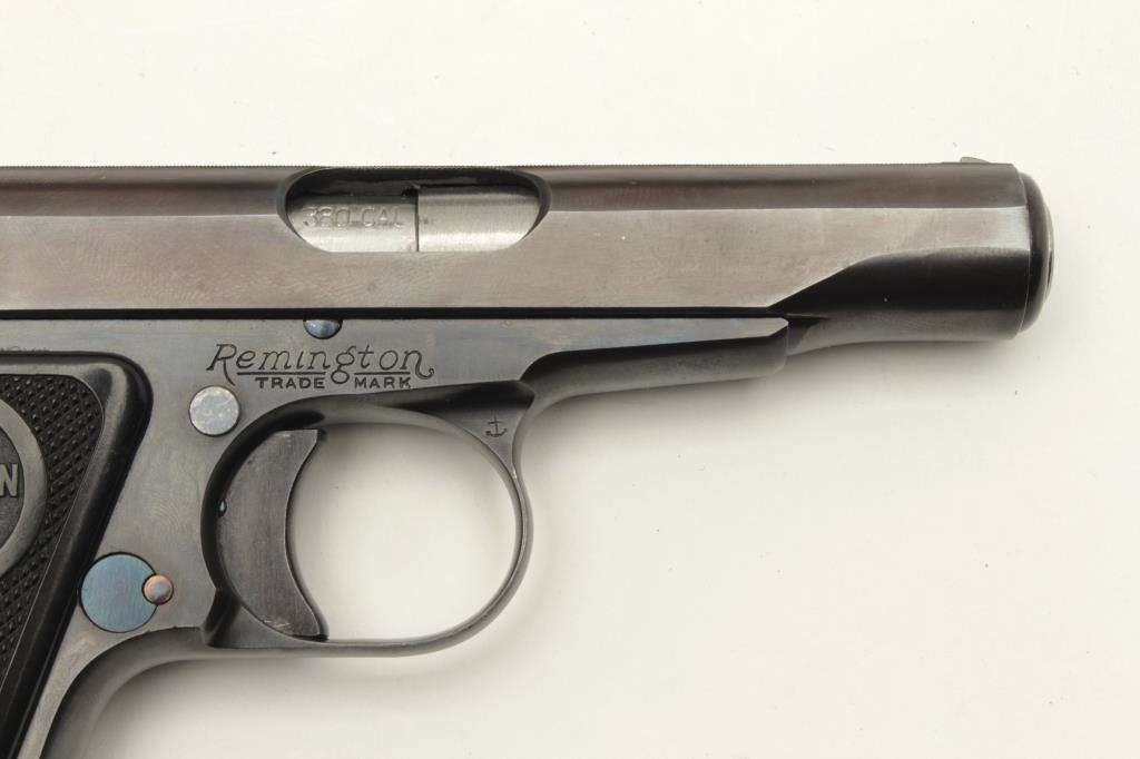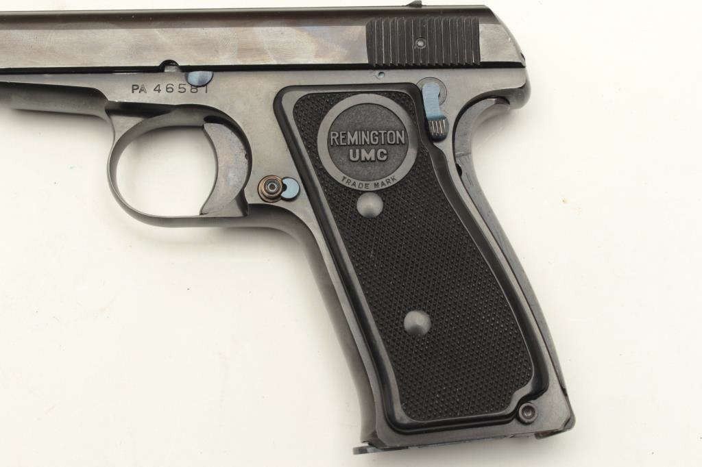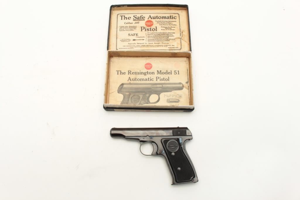 Remington Model 51 semi-automatic pistol, .380 caliber, 3.25” barrel, blued finish, checkered black grips, S/N PA46581, in overall excellent condition showing minimal use or handling, fine bore, crisp action fine grips; accompanied by factory cardboard box displaying minor repair and with instructions sheet. (C&R). Est.: $2,000-4,000