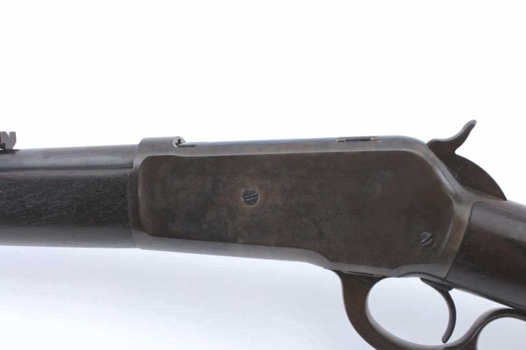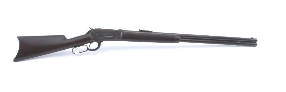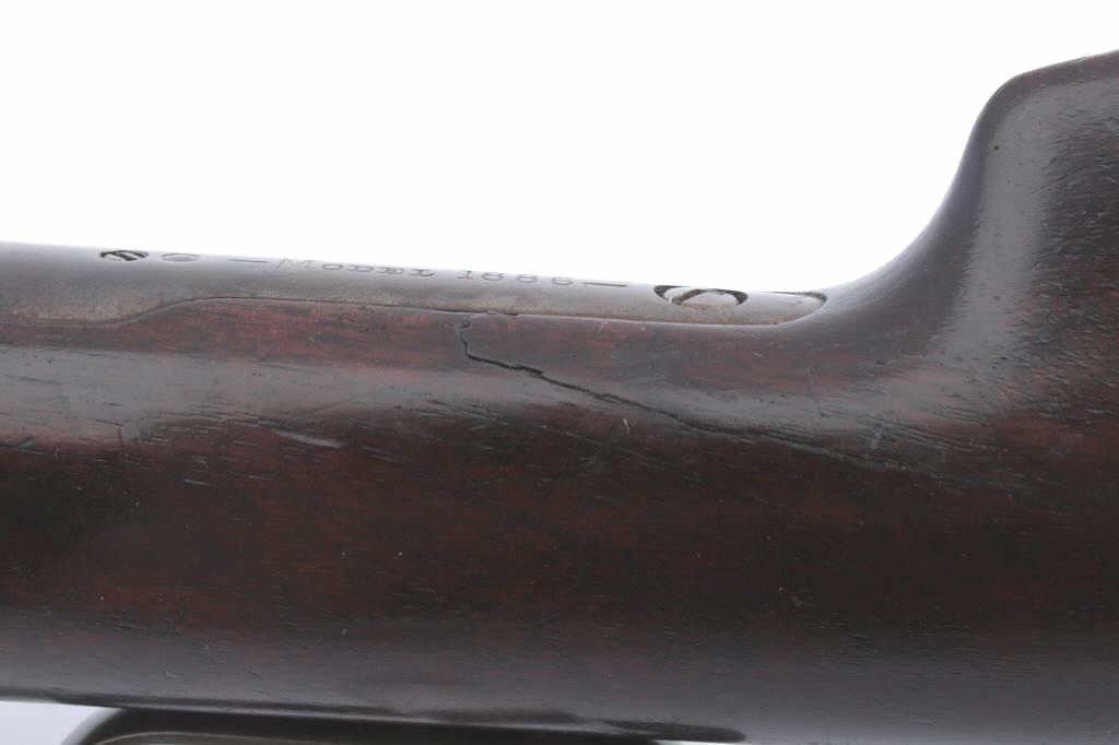 Winchester Model 1886 Rifle in .45-70 caliber with 26” round barrel, express type folding rear sight, full mag, and crescent butt, S/N 17013. The metal surfaces retain 50%+ blue and dulled case hardening within a smoky type dark patina. There are some colorful hues partially visible and bright blue on the bolt and loading gate almost 100%. This is the type patina found on guns hanging over a fire place. The stocks are good other than ahairline crack extending from tang backwards 2 ¼” that is tight and not in danger of opening. The markings are sharp and the edges are crisp. Bright bore with strong rifling and interior shows very little wear or use.(Antique) Est.: $1400-$2800