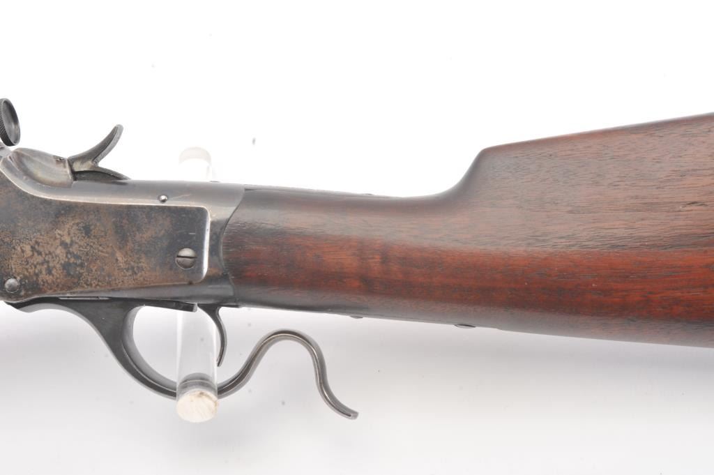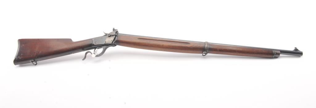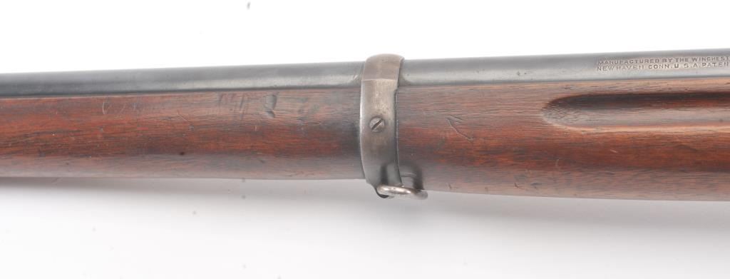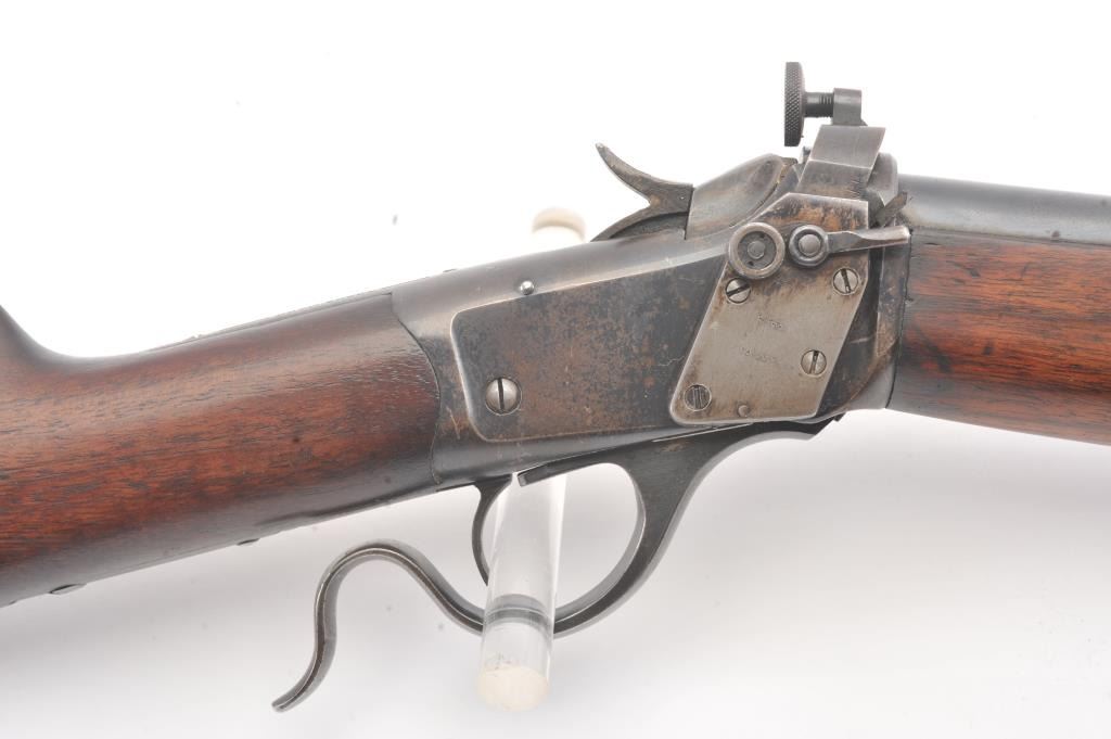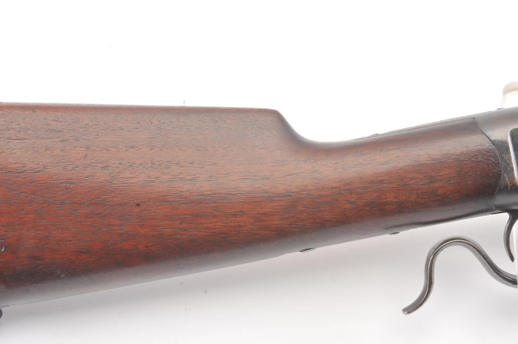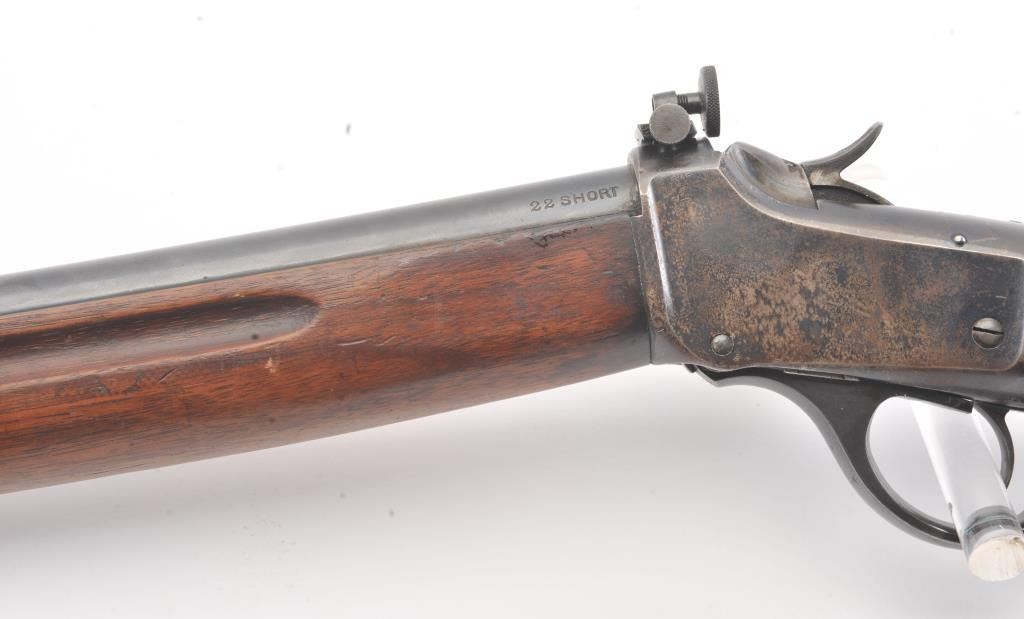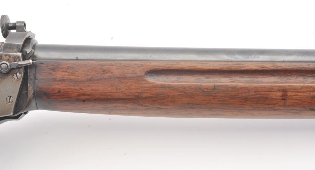 Winchester Low Wall “Winder” musket, .22 Short caliber with U.S. and “Fire Bomb” proof on the tang. The Lyman receiver sight as proper on this variation, Serial #126874. The musket is in very good plus conditionwith 90-95% of the blue on the barrel and 2030% drifting blue on the frame, very good stocks that need cleaning, good action and good to very good bore that should clean up. Est.: $700-1400 (C+R).