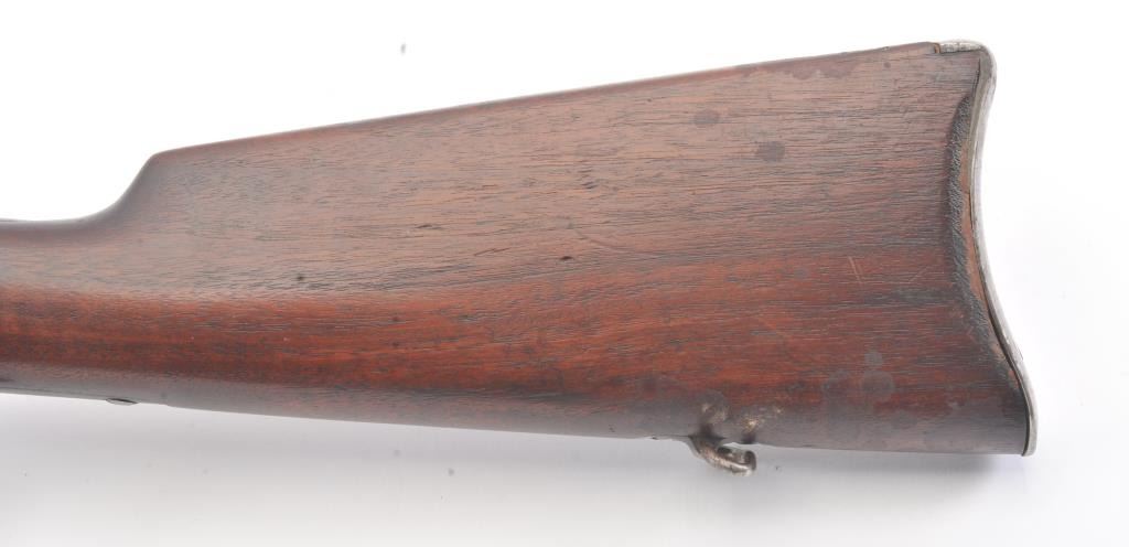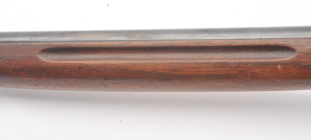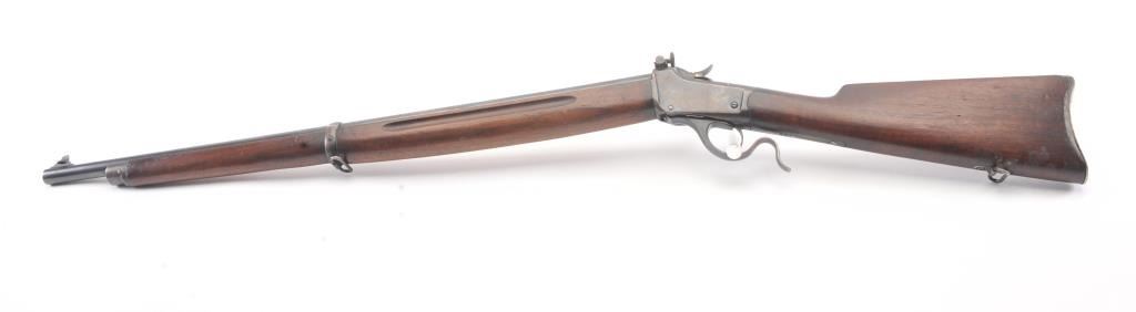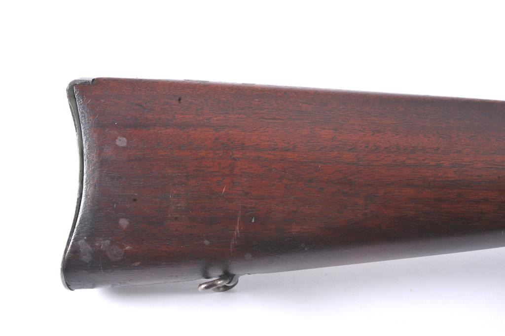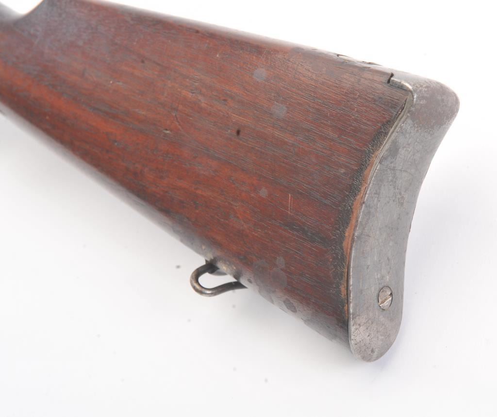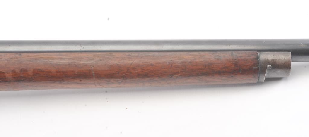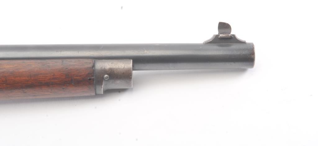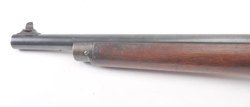 Winchester Low Wall “Winder” musket, .22 Short caliber with U.S. and “Fire Bomb” proof on the tang. The Lyman receiver sight as proper on this variation, Serial #126874. The musket is in very good plus conditionwith 90-95% of the blue on the barrel and 2030% drifting blue on the frame, very good stocks that need cleaning, good action and good to very good bore that should clean up. Est.: $700-1400 (C+R).