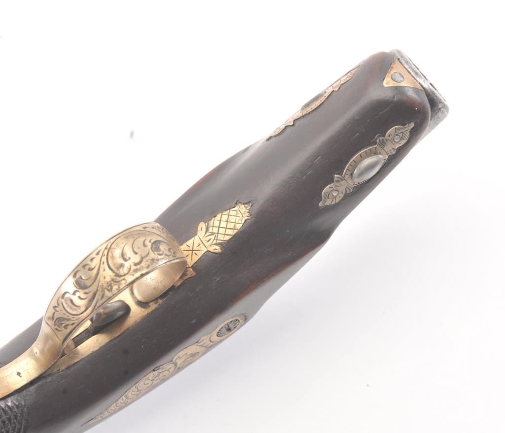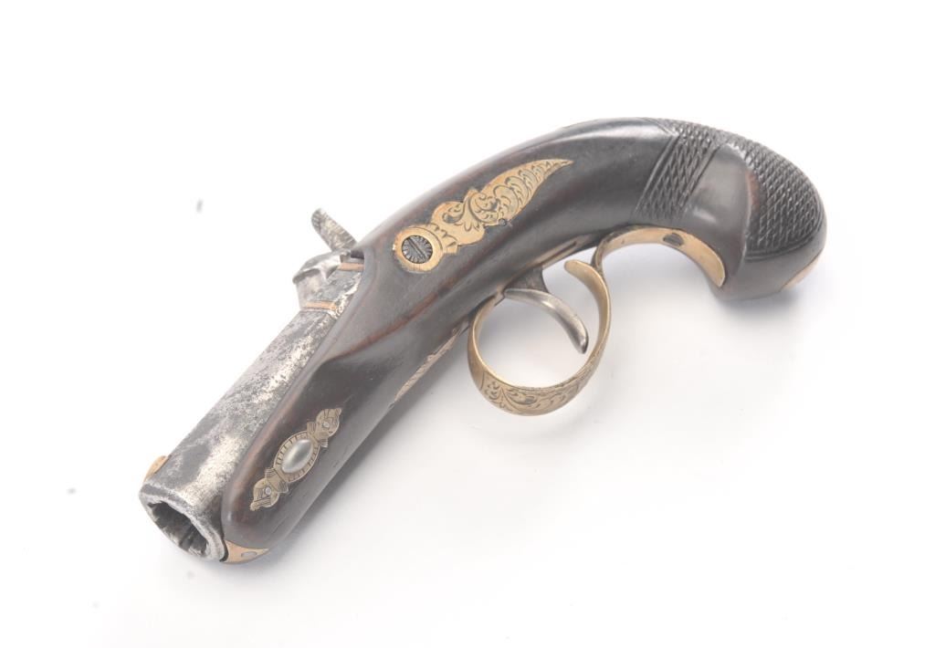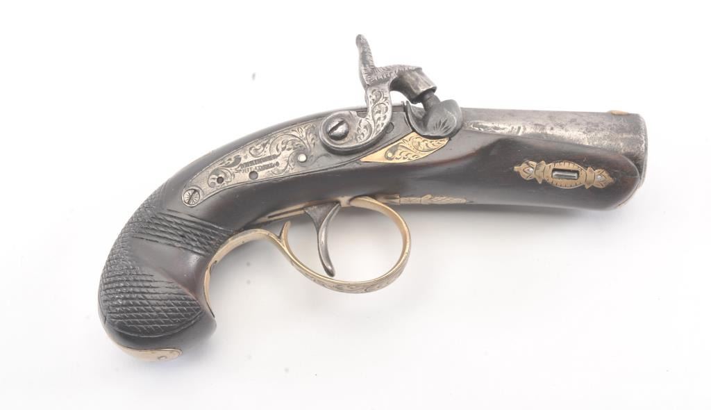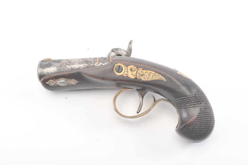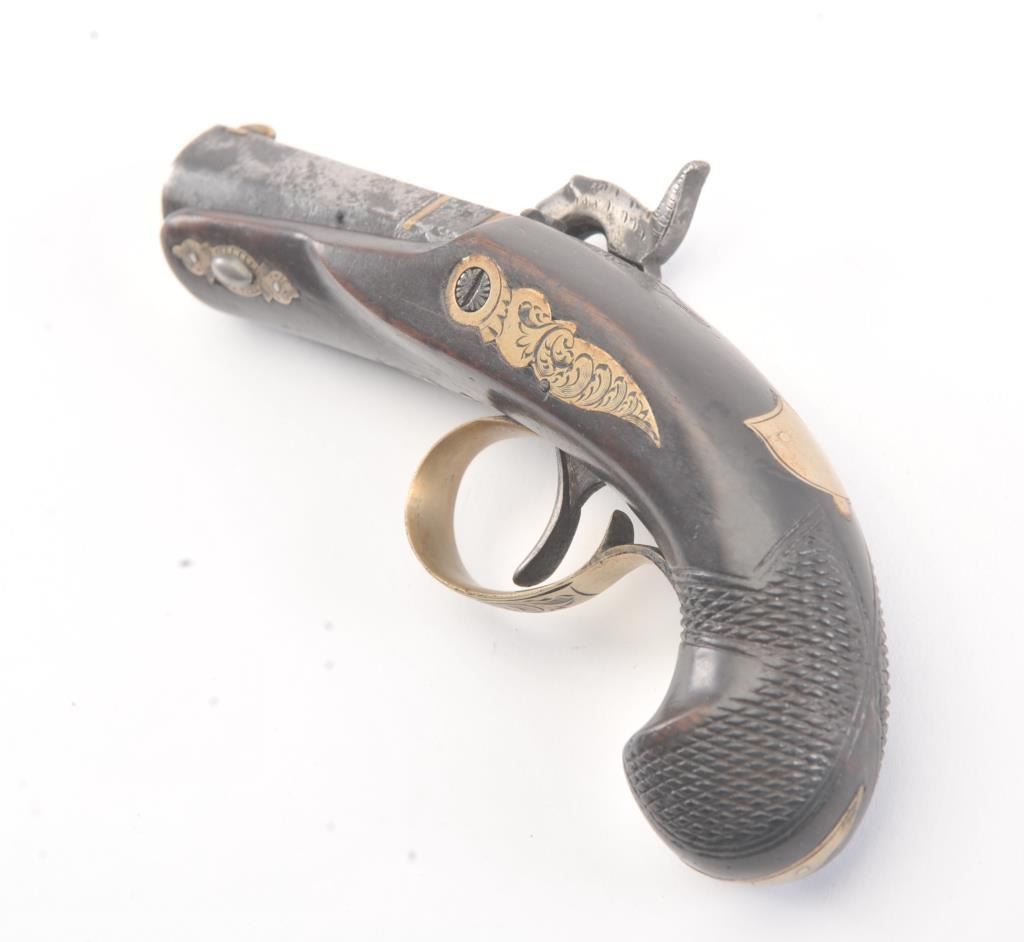 Philadelphia Derringer by Henry Deringer showing double bands at the breech and engraved German silver mounts. The pistol has an overall length of 6” with a 2 ½” barrel of approximately .50 caliber with 7groove rifling. The pistol has gone to patina finish with minor erosion and pitting. The wood grips are good, the pistol is working with correct markings and proofs for manufacture by Henry Deringer himself. Thepistol is unusually small for a .50 caliber! Est.: $750-$1,500. (Antique).