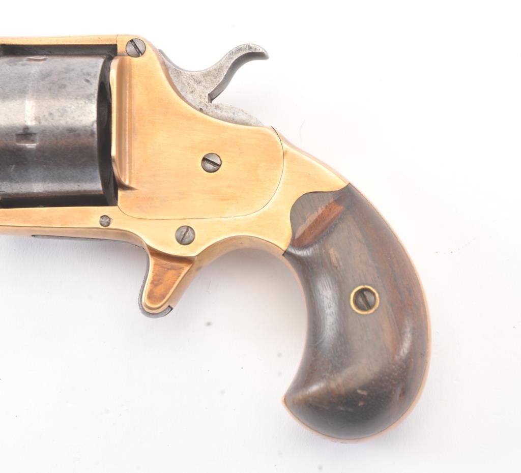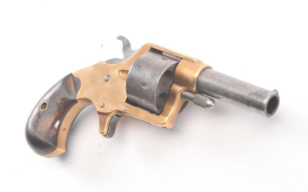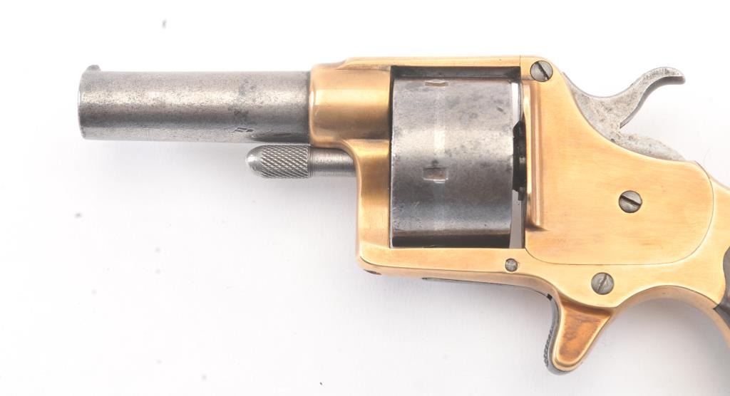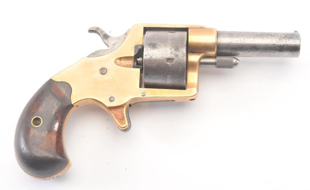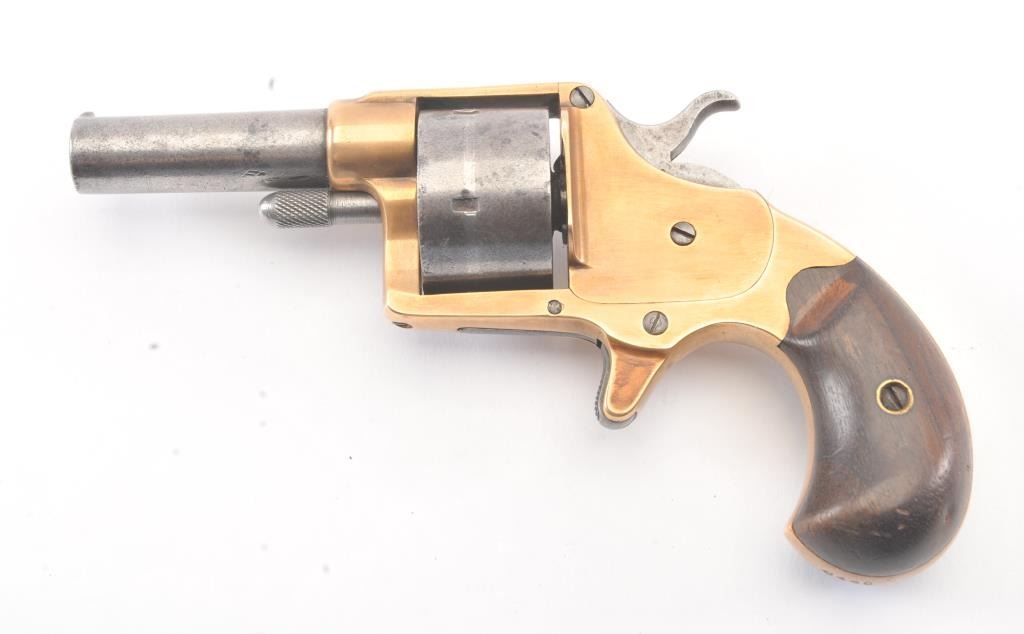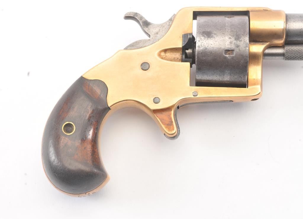 Colt Model 1871 House pistol with round cylinder, .41 caliber, Serial #9446. The pistol shows a grey patina finish with a good, uncleaned brass frame with a correct cylinder pin and small parts. The pistol has good grips, minor pitting and erosion which is mostly on the cylinder. The pistol has good markings and a tight action. Est.: $700-$1,400. (Antique).