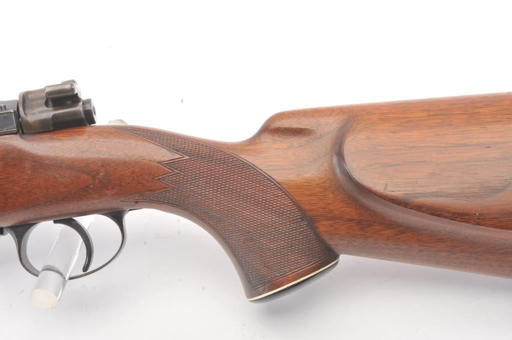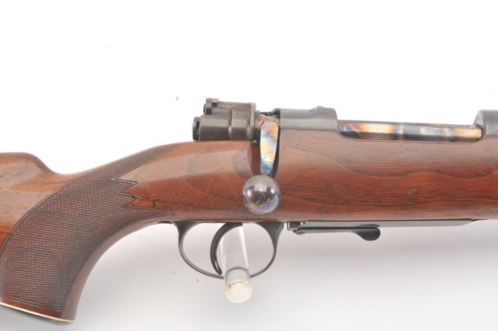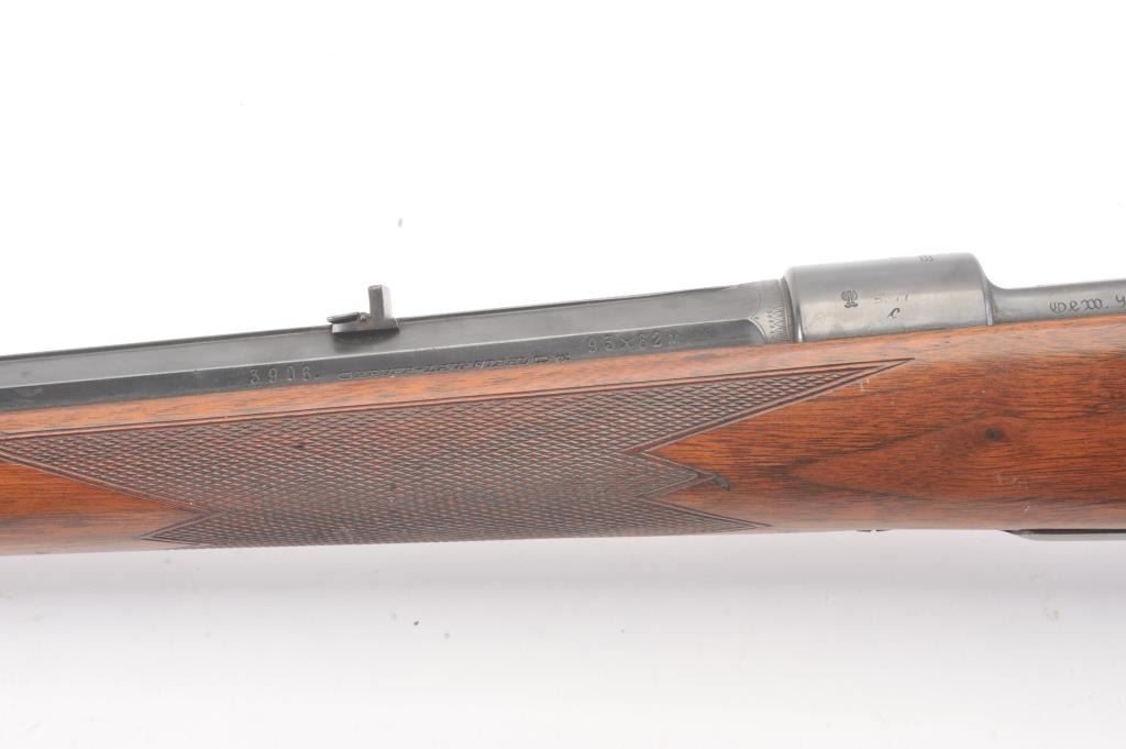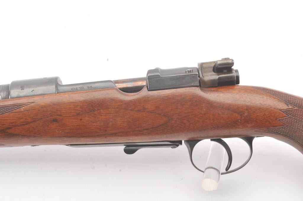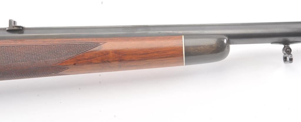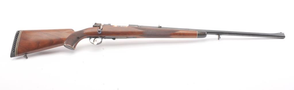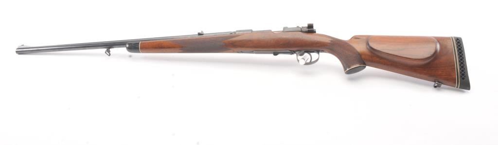 J.P. Sauer & Sohn Mauser bolt action sporting rifle, 9.3 x 62 caliber, Serial #15717. The rifle is in very good overall condition with a 26” octagon to round barrel with a full-length filed rib, ramped blade frontsight and two-leaf folding express sight. The barrel address is marked J.P. Sauer & Sohn, Berlin. The rifle retains a significant amount of toning blue finish with high point edge wear and a barrel mountedsling swivel. The WWI military action is marked GEW 98 on the left wall and Spandau on the front ring, which is dated 1911. There are multiple German proofs and acceptance marks on the front ring. The magazine has alever release and the bolt has been case colored, modified and knurled. The finely checkered wood stock is in good condition with mars and compressions consistent with field use. The fore end cap is horn as isthe pistol grip with a beaded cheek piece and ventilated rubber recoil pad providing a 14” LOP to a single trigger. The bore is good and the action functions well on this nice J.P. Sauer. Est.: $600-$1,200. (C+R).