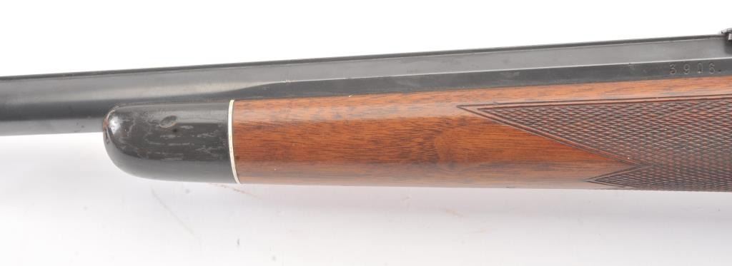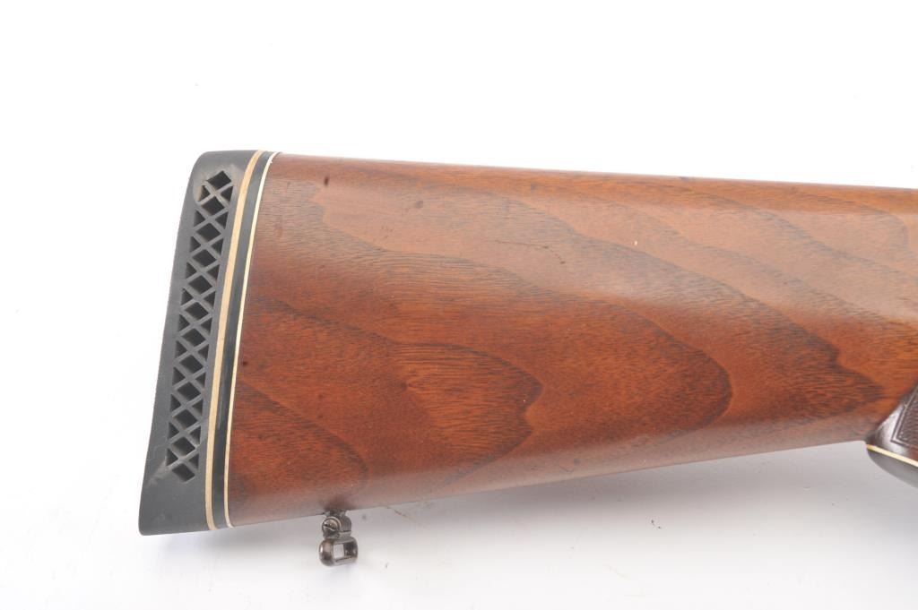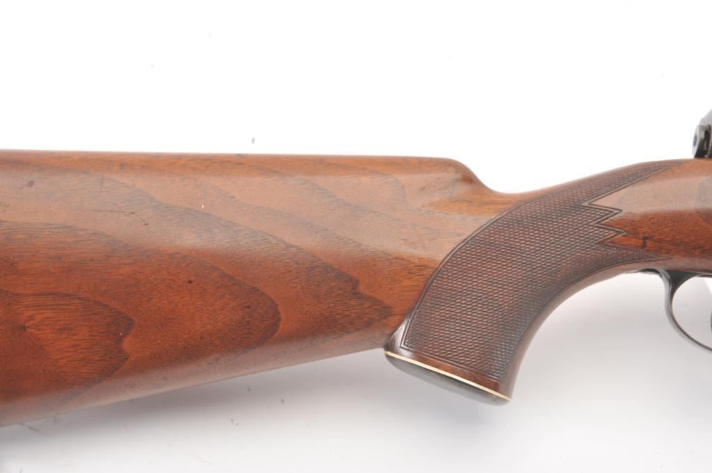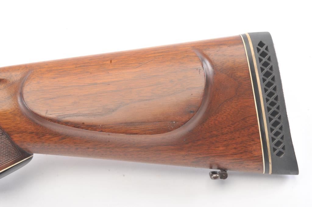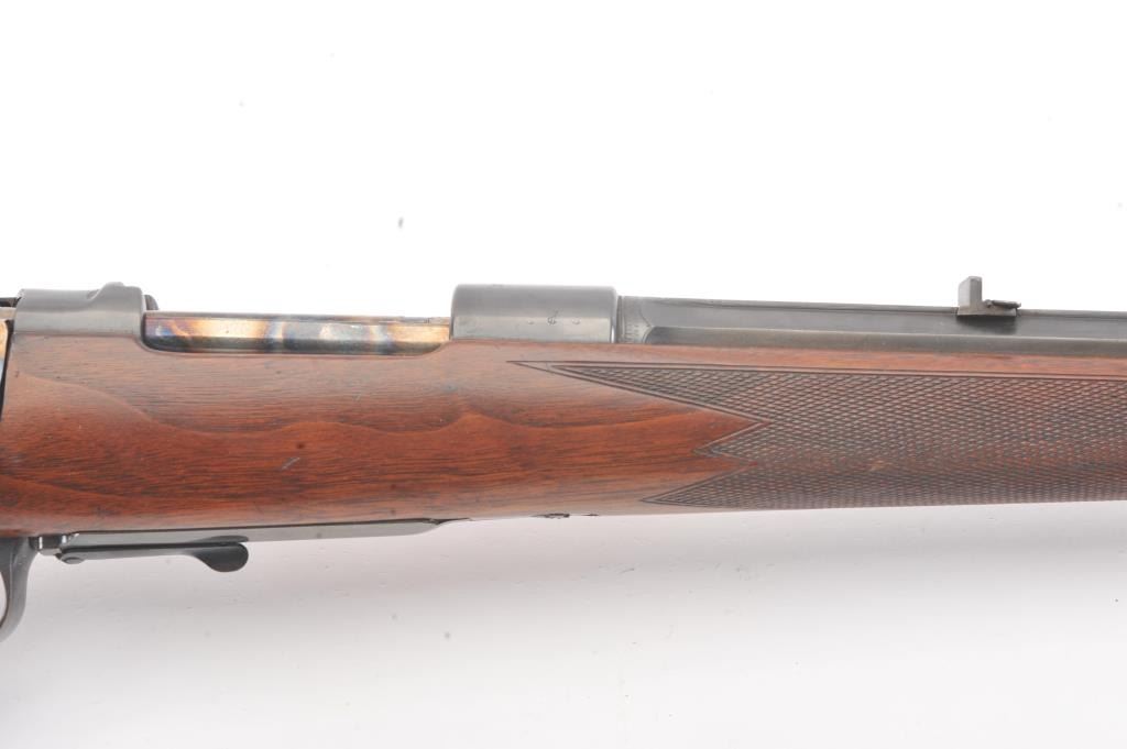 J.P. Sauer & Sohn Mauser bolt action sporting rifle, 9.3 x 62 caliber, Serial #15717. The rifle is in very good overall condition with a 26” octagon to round barrel with a full-length filed rib, ramped blade frontsight and two-leaf folding express sight. The barrel address is marked J.P. Sauer & Sohn, Berlin. The rifle retains a significant amount of toning blue finish with high point edge wear and a barrel mountedsling swivel. The WWI military action is marked GEW 98 on the left wall and Spandau on the front ring, which is dated 1911. There are multiple German proofs and acceptance marks on the front ring. The magazine has alever release and the bolt has been case colored, modified and knurled. The finely checkered wood stock is in good condition with mars and compressions consistent with field use. The fore end cap is horn as isthe pistol grip with a beaded cheek piece and ventilated rubber recoil pad providing a 14” LOP to a single trigger. The bore is good and the action functions well on this nice J.P. Sauer. Est.: $600-$1,200. (C+R).