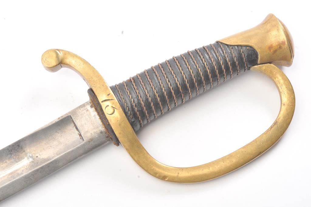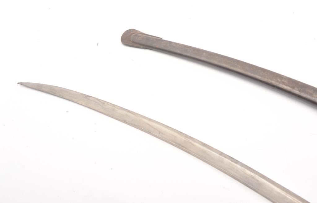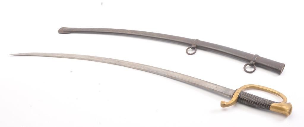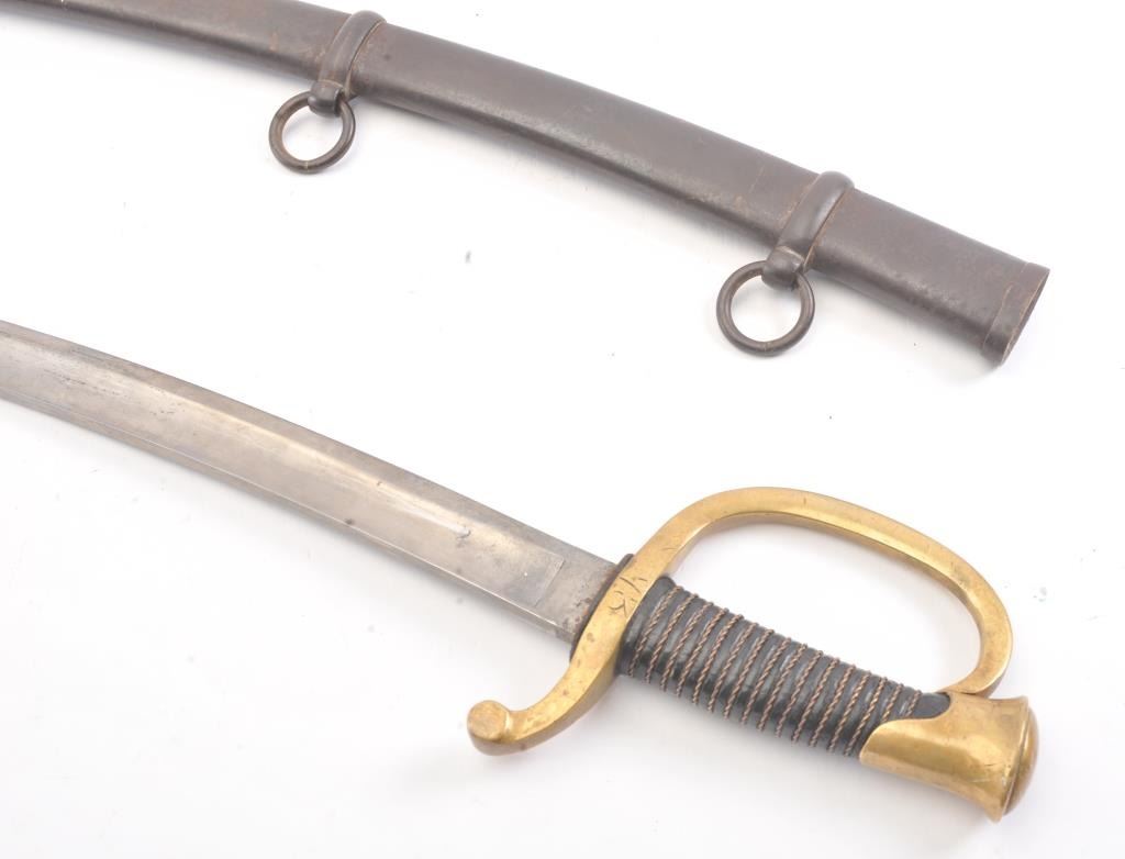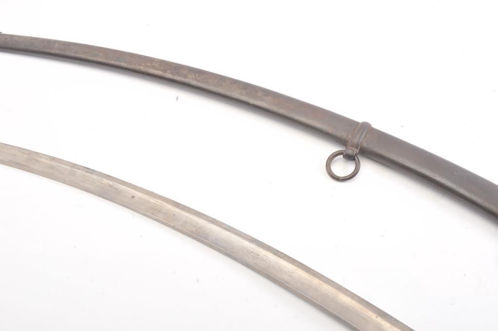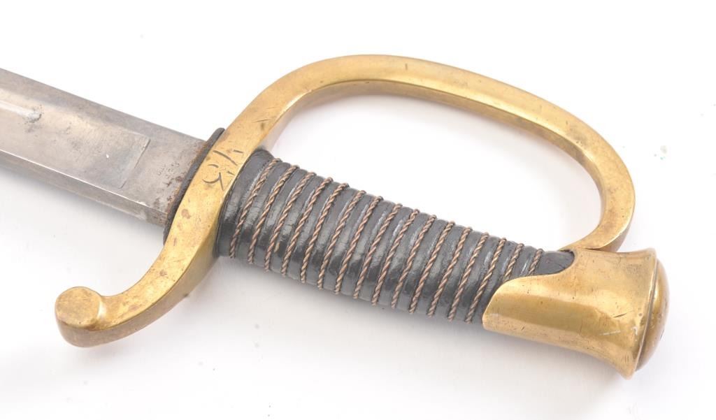 Model 1840 Artillery sabre with steel scabbard. The sabre is marked, Ames and dated 1863. The sabre is 37 ½” in total length with a 32” blade. The blade is in very good condition showing significantoriginal polish, a few small dents in the cutting edge and no sharpening, marked D.R and dated 1863 at the ricasso with a faint Ames marking on the reverse. The brass handguard has taken on a pleasing taffypatina marked, “73” rack marks on both sides and “DR”. The grip is wire wrapped leather and in very good condition with the brass pommel marked, “52”. The scabbard is a dark patina with a couple of small dents and thehangers are retained. A nice Civil War era sabre with a good look to it. Est.: $400-$800.
