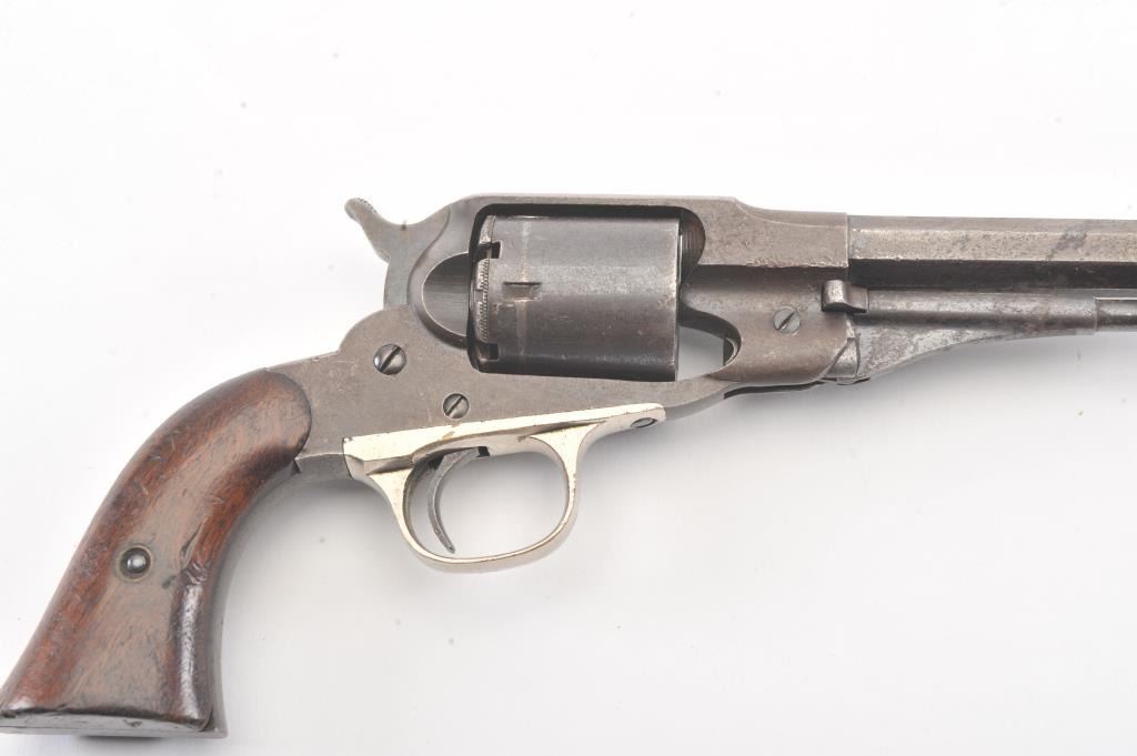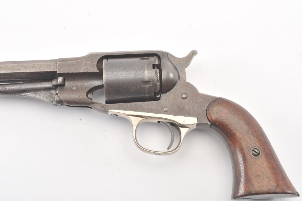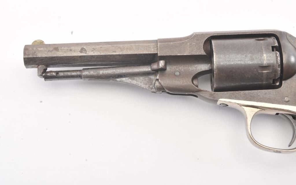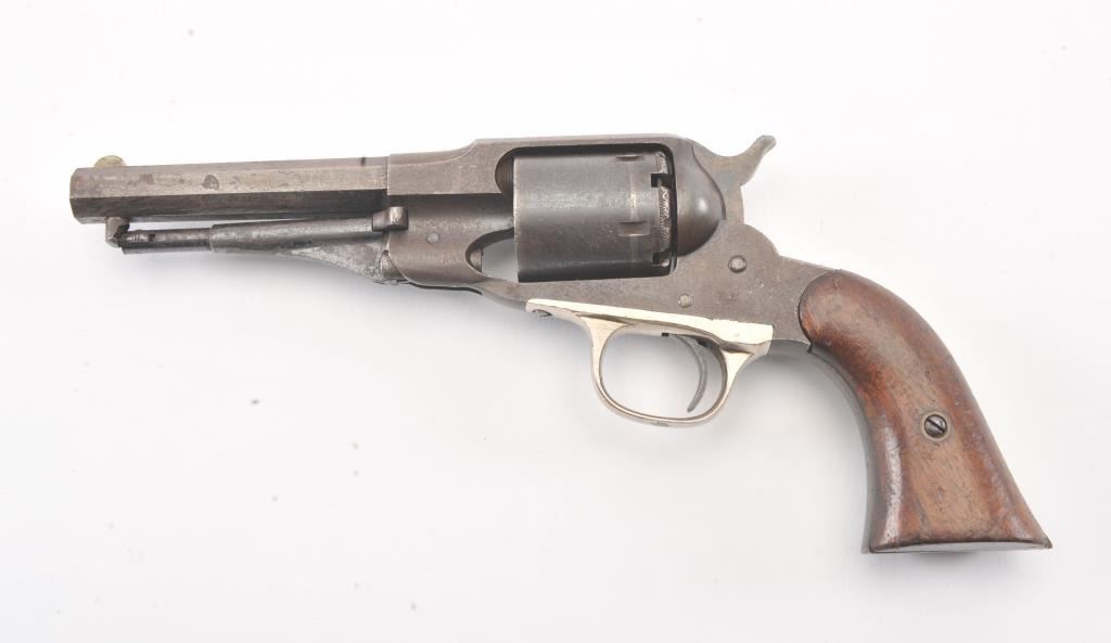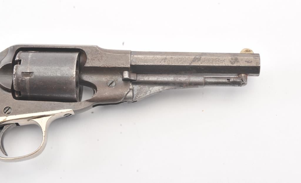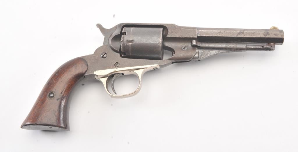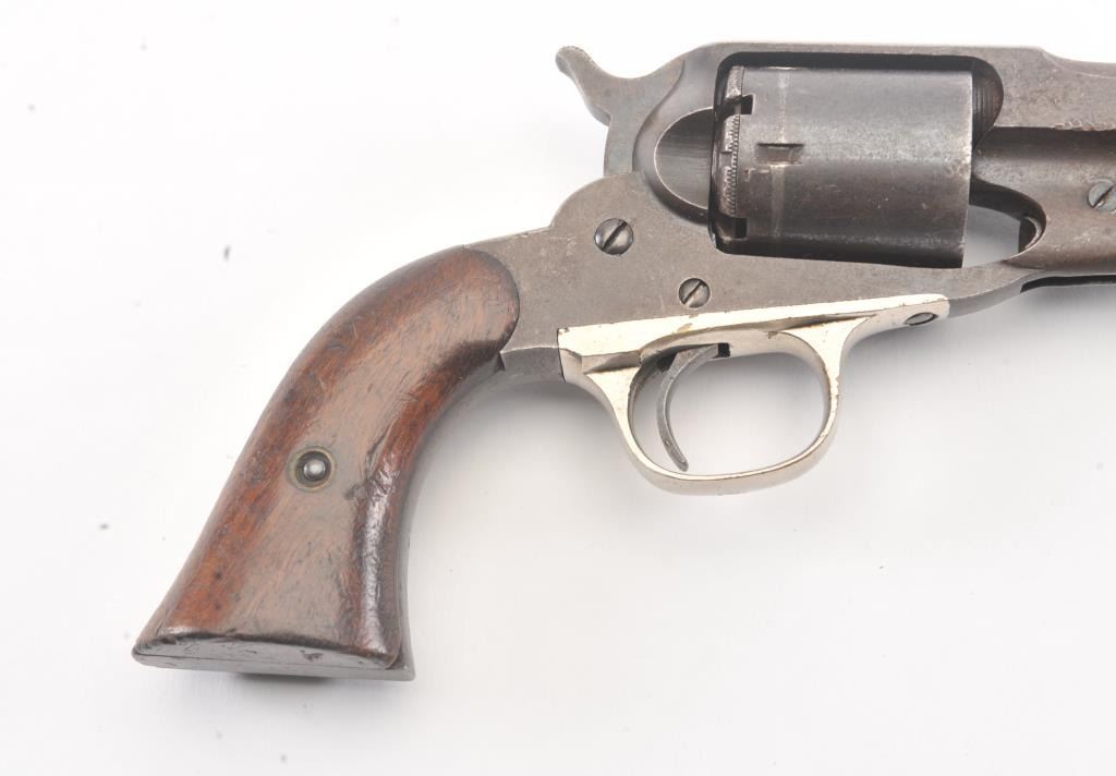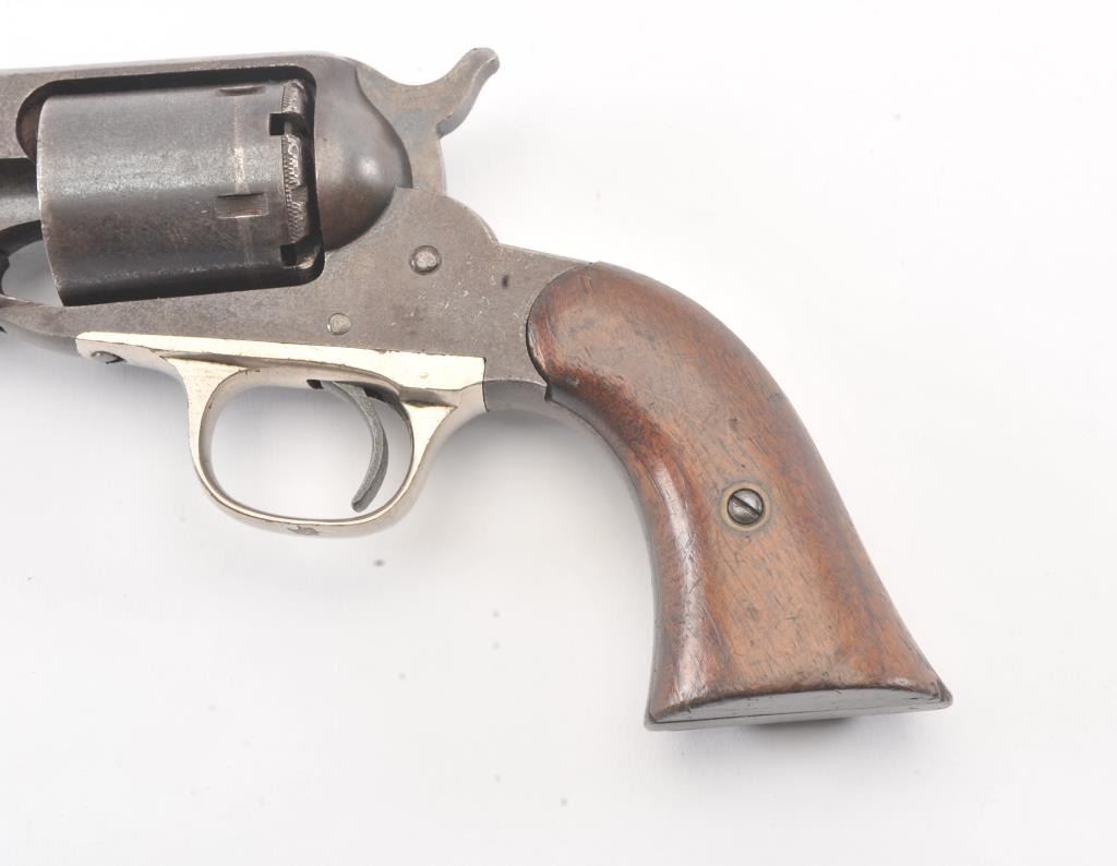 Remington New Model Police Conversion revolver, .36 caliber, Serial #NSNV. The pistol is in good overall condition with a 4 ½” octagon barrel. The pistol retains some muted blue finish on the loading lever,unfluted cylinder on the underside of the barrel in the protected areas with the remainder going to dark patina. The hammer shows strong old case colors and the trigger guard retains the majority of the silverfinish. The smooth wood grips are in good condition with mars and dents from carry and use with significant original finish. The bore is fair and the action works well on this desirable Remington conversion. Est.:$400-$800. (Antique).