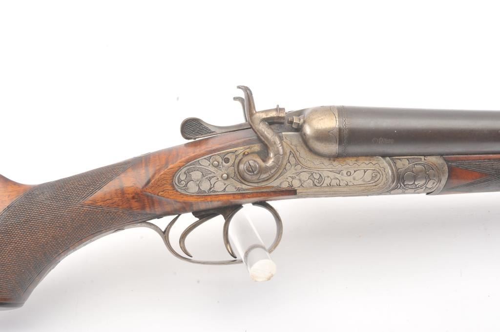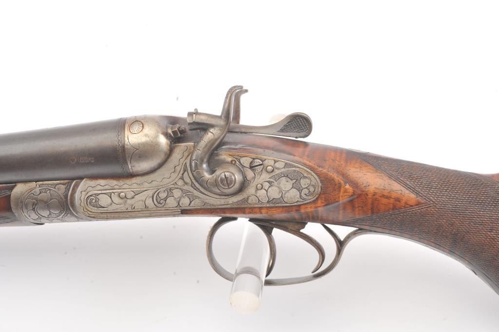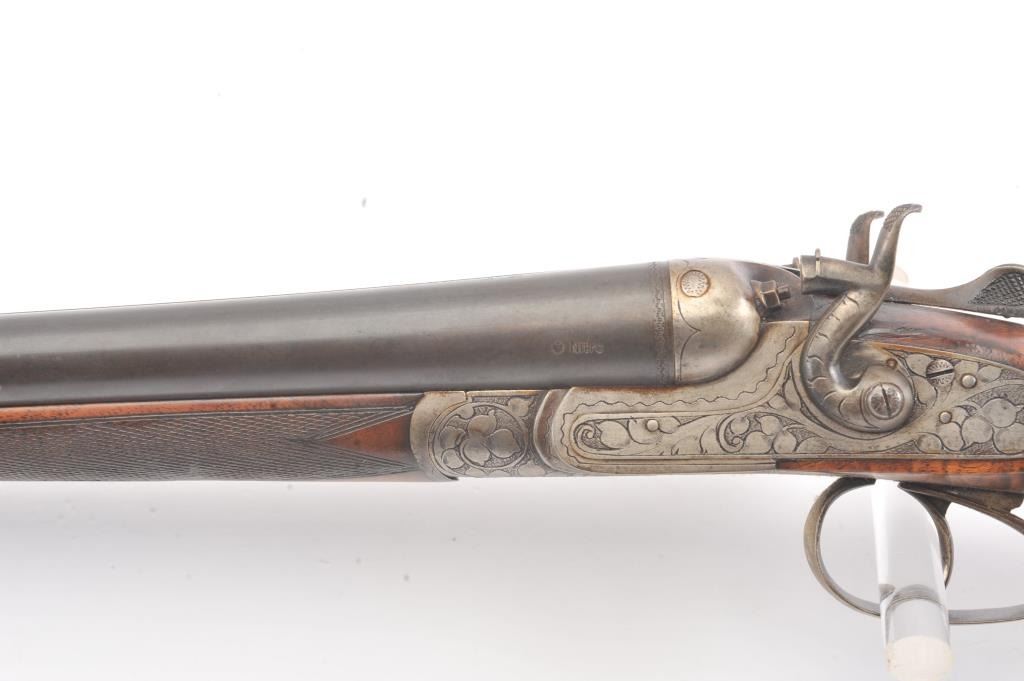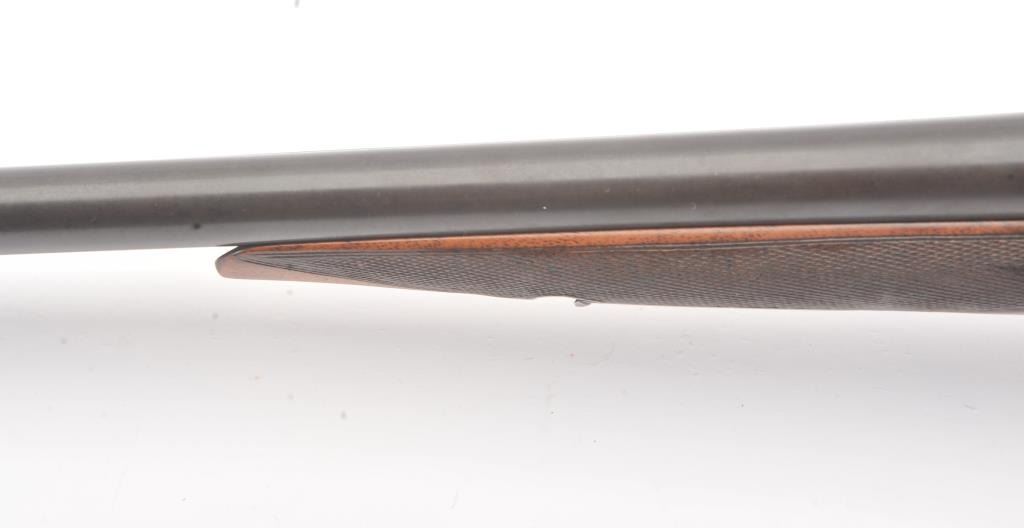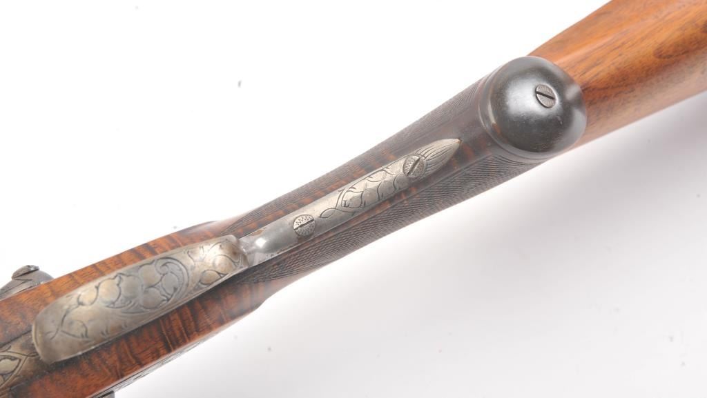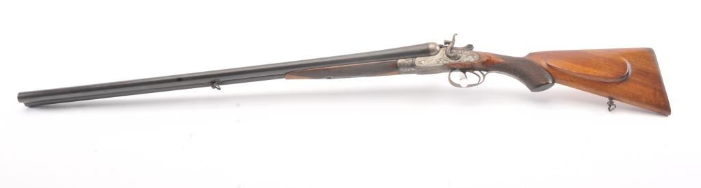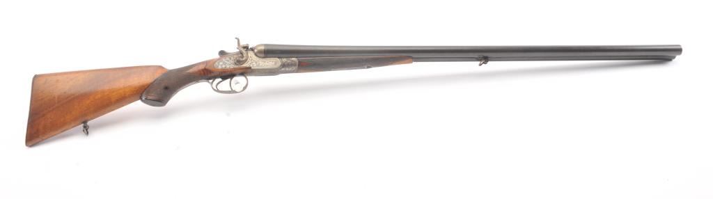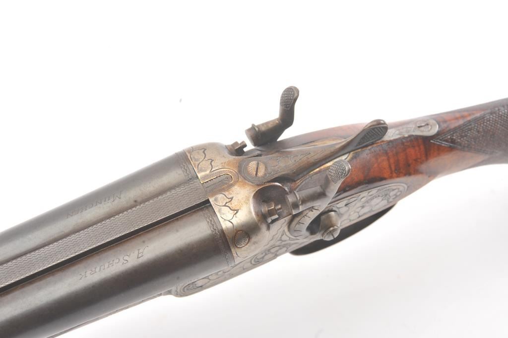 Pre-War German A. Schurk of Munchen Side by Side hammer shotgun, 12 gauge, Serial #4624. The shotgun is in fine overall condition with 29 ¾” barrels with a full-length hand filed rib. The chopper lump barrels areKrupp Steel marked and have gone to dark patina showing numerous proofs on the water table. The barrels are maker marked, A. Schurk on the right and Munchen on the left. The receiver is silvered case hardeningwith sharp relief engraving of a floral motif. The finely checkered stocks are in good condition with a Deeley fore end release, pistol grip with horn cap and a beaded cheek piece. The butt stock ends with a steel butt plate with light to moderate surface rust due to poor storage, providing a 13 ½” LOP to the front trigger. The bores are fair and action works well on this desirable Pre-War shotgun from the Munichregion. Est.: $250-$500. (C+R).