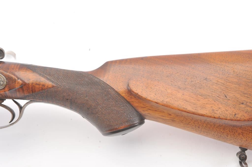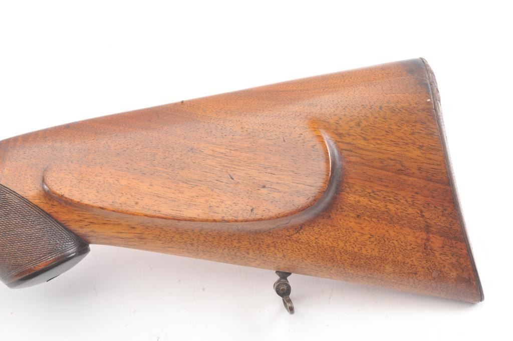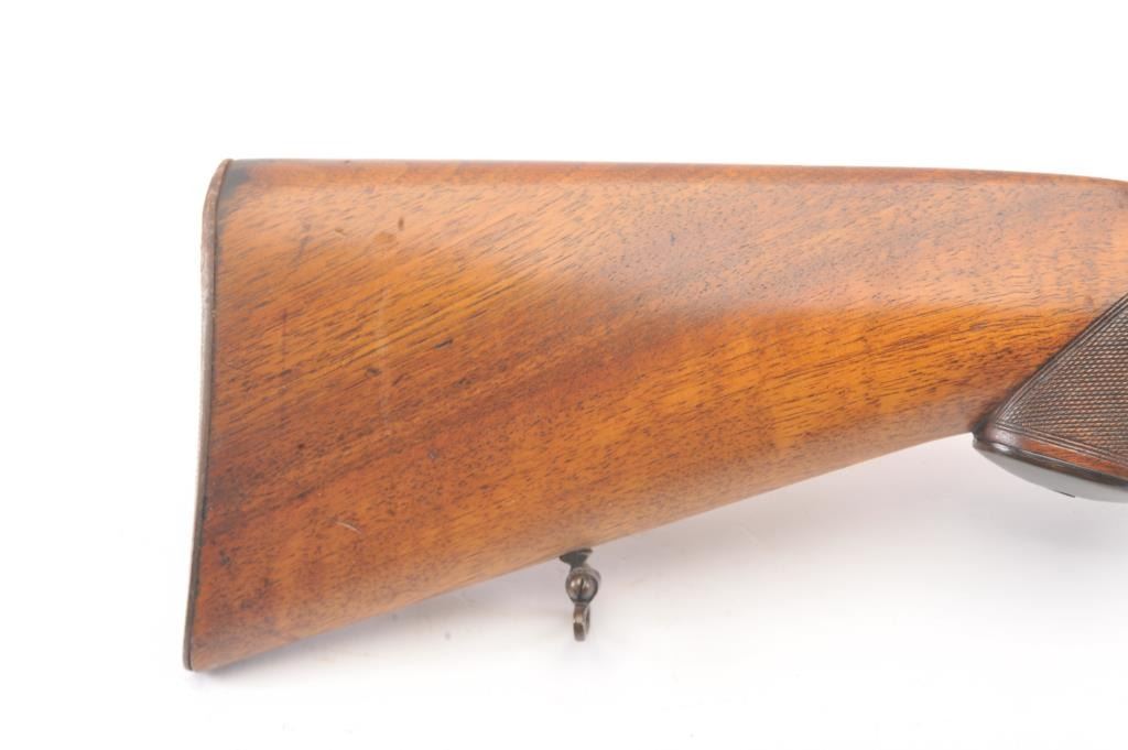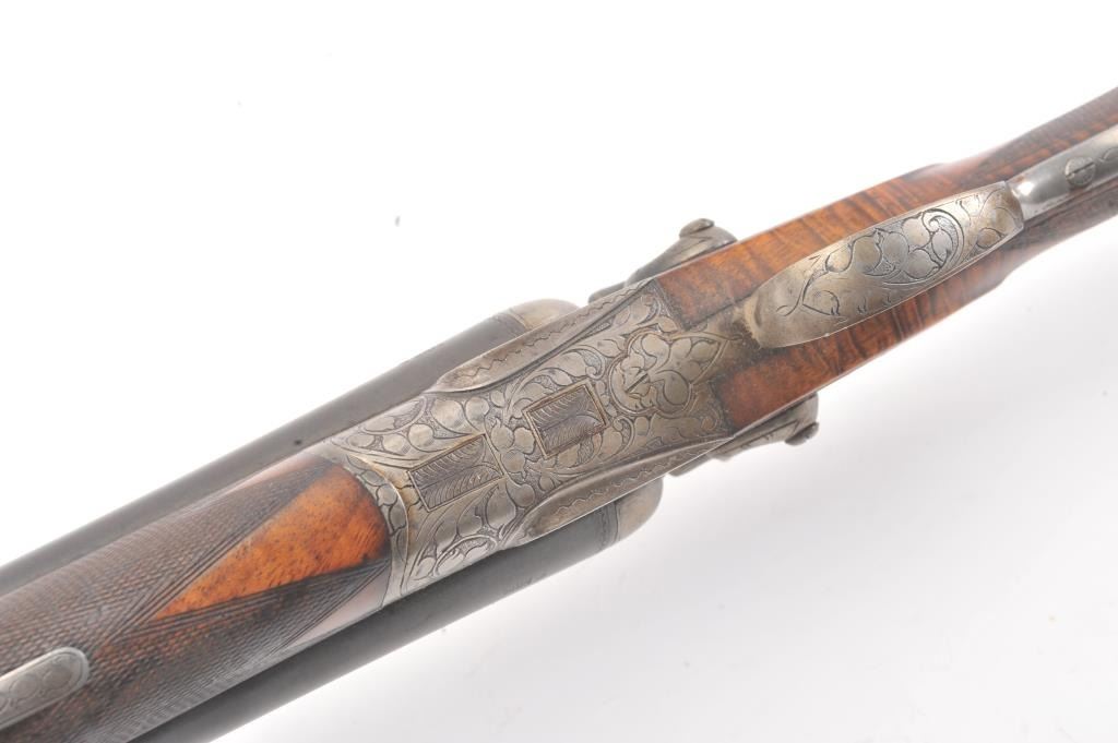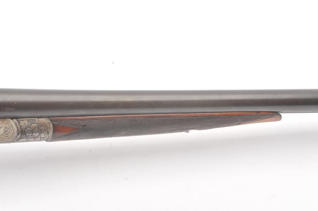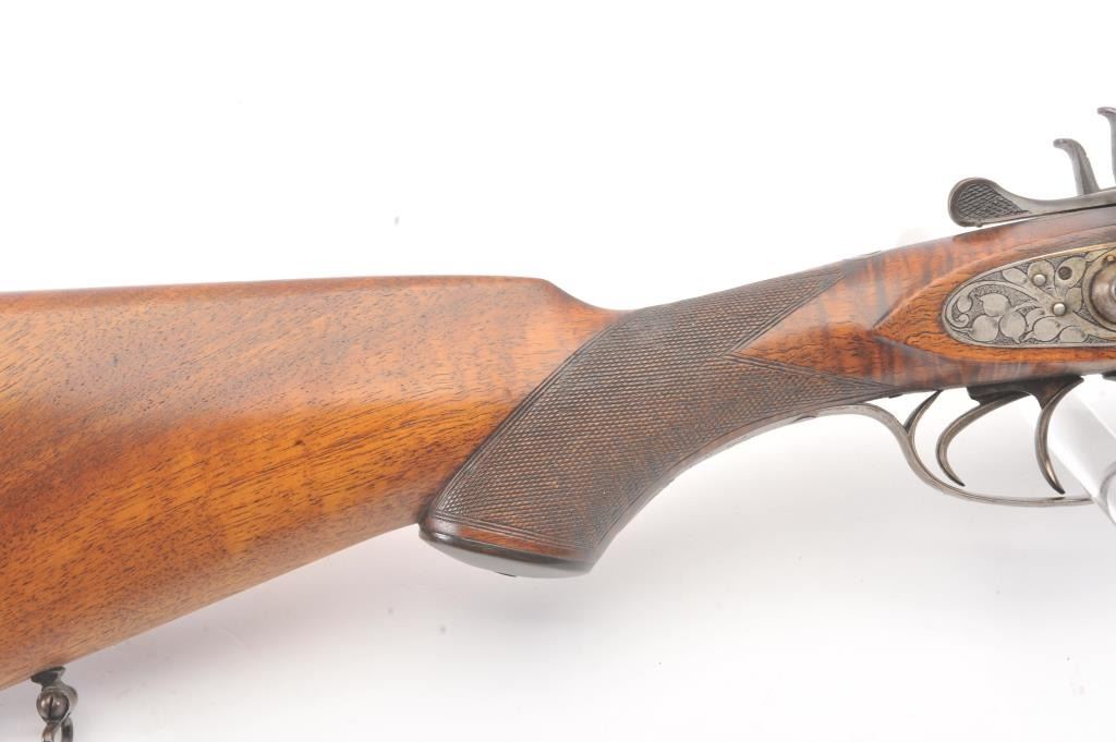 Pre-War German A. Schurk of Munchen Side by Side hammer shotgun, 12 gauge, Serial #4624. The shotgun is in fine overall condition with 29 ¾” barrels with a full-length hand filed rib. The chopper lump barrels areKrupp Steel marked and have gone to dark patina showing numerous proofs on the water table. The barrels are maker marked, A. Schurk on the right and Munchen on the left. The receiver is silvered case hardeningwith sharp relief engraving of a floral motif. The finely checkered stocks are in good condition with a Deeley fore end release, pistol grip with horn cap and a beaded cheek piece. The butt stock ends with a steel butt plate with light to moderate surface rust due to poor storage, providing a 13 ½” LOP to the front trigger. The bores are fair and action works well on this desirable Pre-War shotgun from the Munichregion. Est.: $250-$500. (C+R).