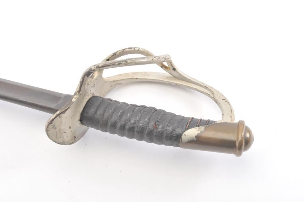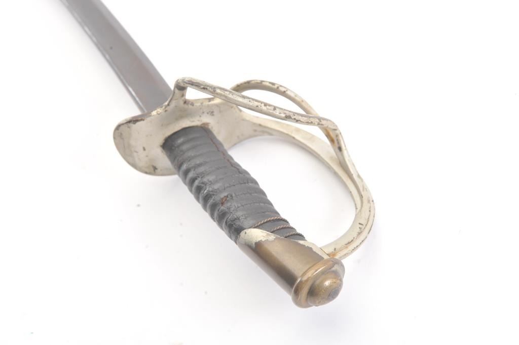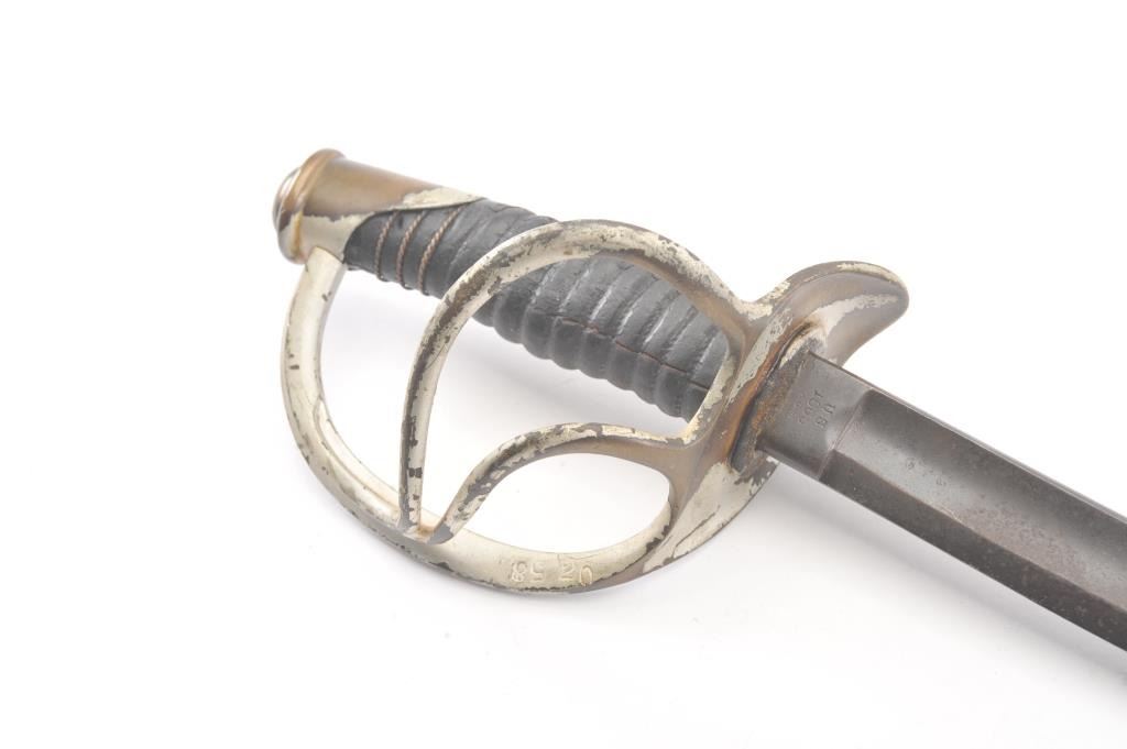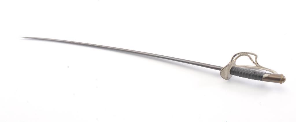Roby U.S. Cavalry Sabre dated 1865 without scabbard. The sabre is in good overall condition, 40 ½” in total length with a 35” blade gone to dark brown patina. The blade is marked, “US 1865 A.G.M.” on one side ofthe ricasso and “C. ROBY CHELMSFORD MASS” on the reverse. The brass basket handguard has been painted silver with crude stamps, “58” and “20” stamped on the guard. The markings could indicate movie studio use or racknumbers. The leather wrapped grip is in good condition missing most of the wire wrap with bare brass at the pommel. Est.: $150-$300.