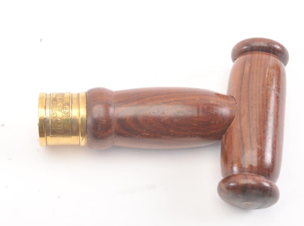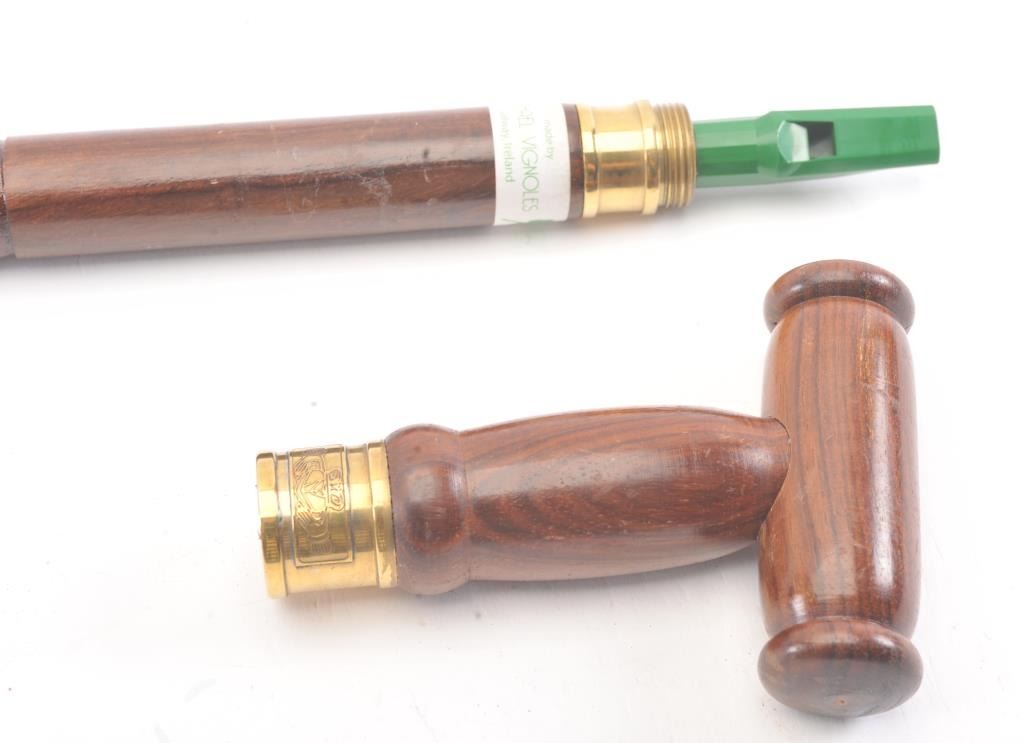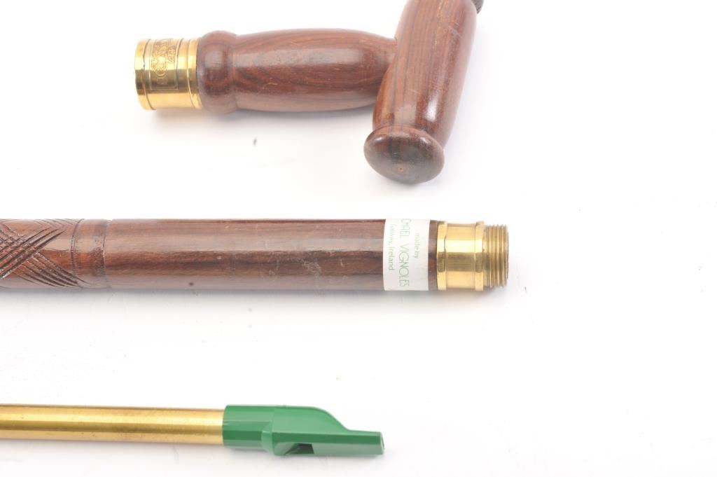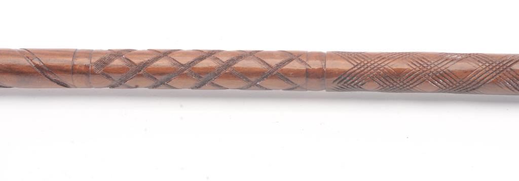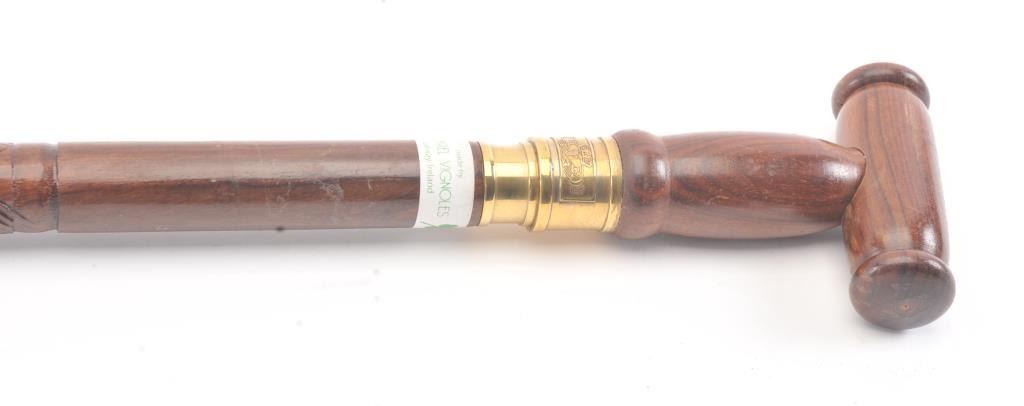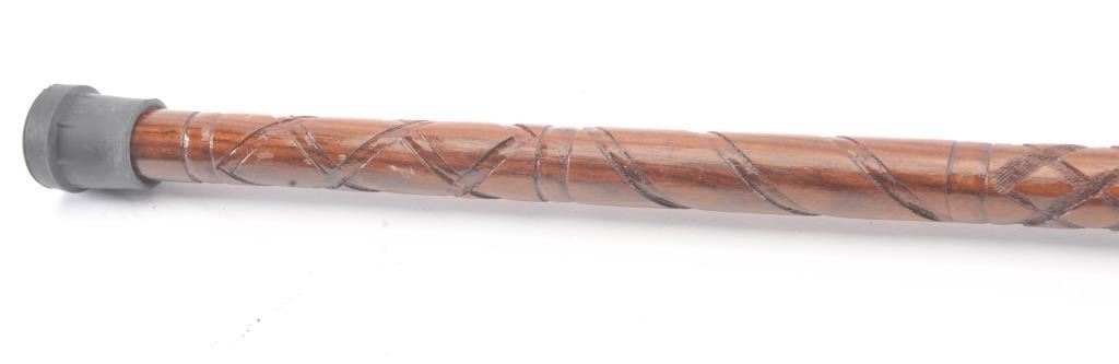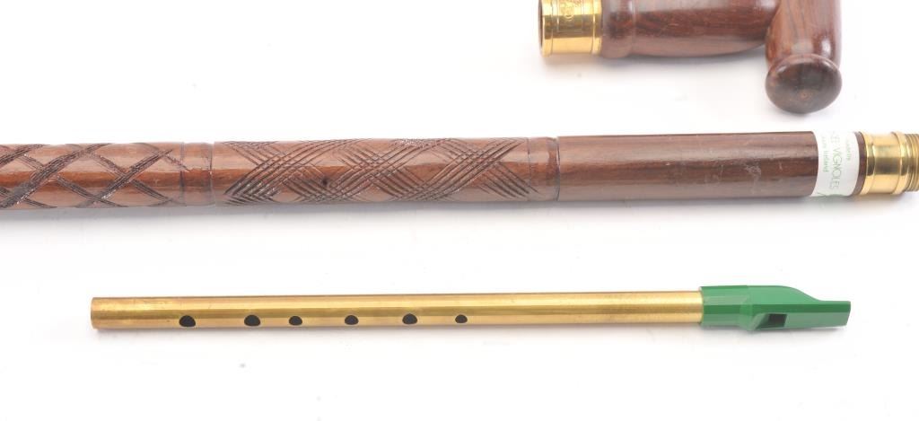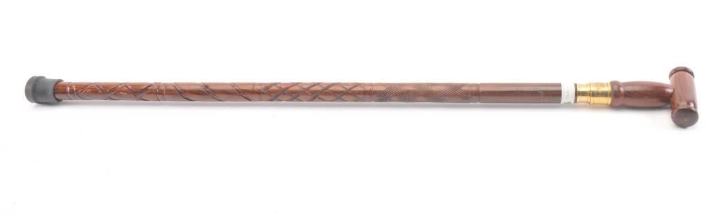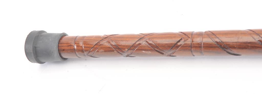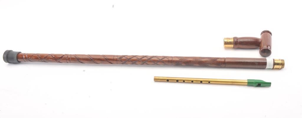 Carved wood cane with a hidden flute. The carved wood cane is marked, “MADE BY MICHAEL VIGNOLES GALWAY, IRELAND” with a rubber crutch tip and hammer top. The cane has a brass fitting marked with a Claddagh Heartwhere the cane disassembles and has a brass and green plastic flute hidden inside. A nice decorator piece from the Emerald Isle in very good condition. Est.: $35-$70.